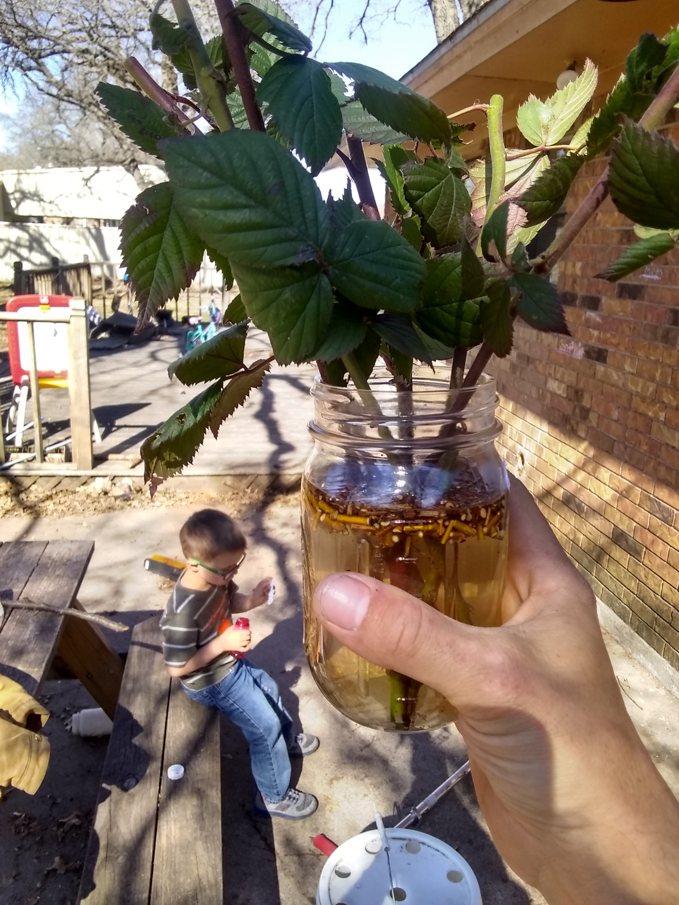 All the cuttings and extra willow twigs I got had me wondering if I could root some more blackberry canes. If it works, we'll have six more plants! It's cool to not have to spend money on plants anymore. Starting next year I should be able to root or graft whatever plants I'll need. Blackberry, goji, peach, plum, apple, pear, almond, fig, I should have plenty and enough to put some into heavy sharing mode and sell for another small homestead income stream.