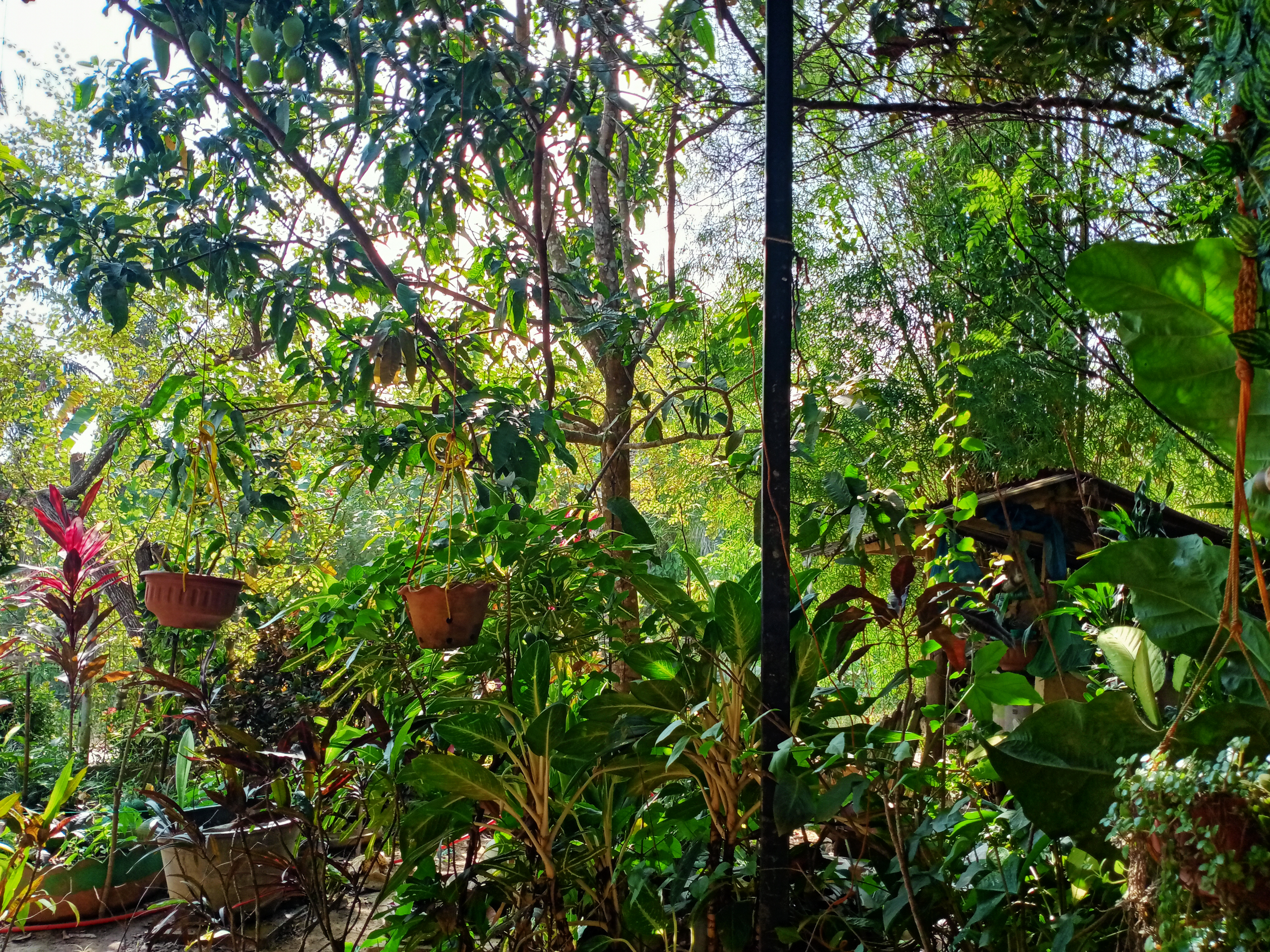 Di teras depan rumahBegitu suasana di luar sudah agak terang, aku menuju teras depan rumah untuk membereskan tanaman-tanaman yang ada di halaman kami.