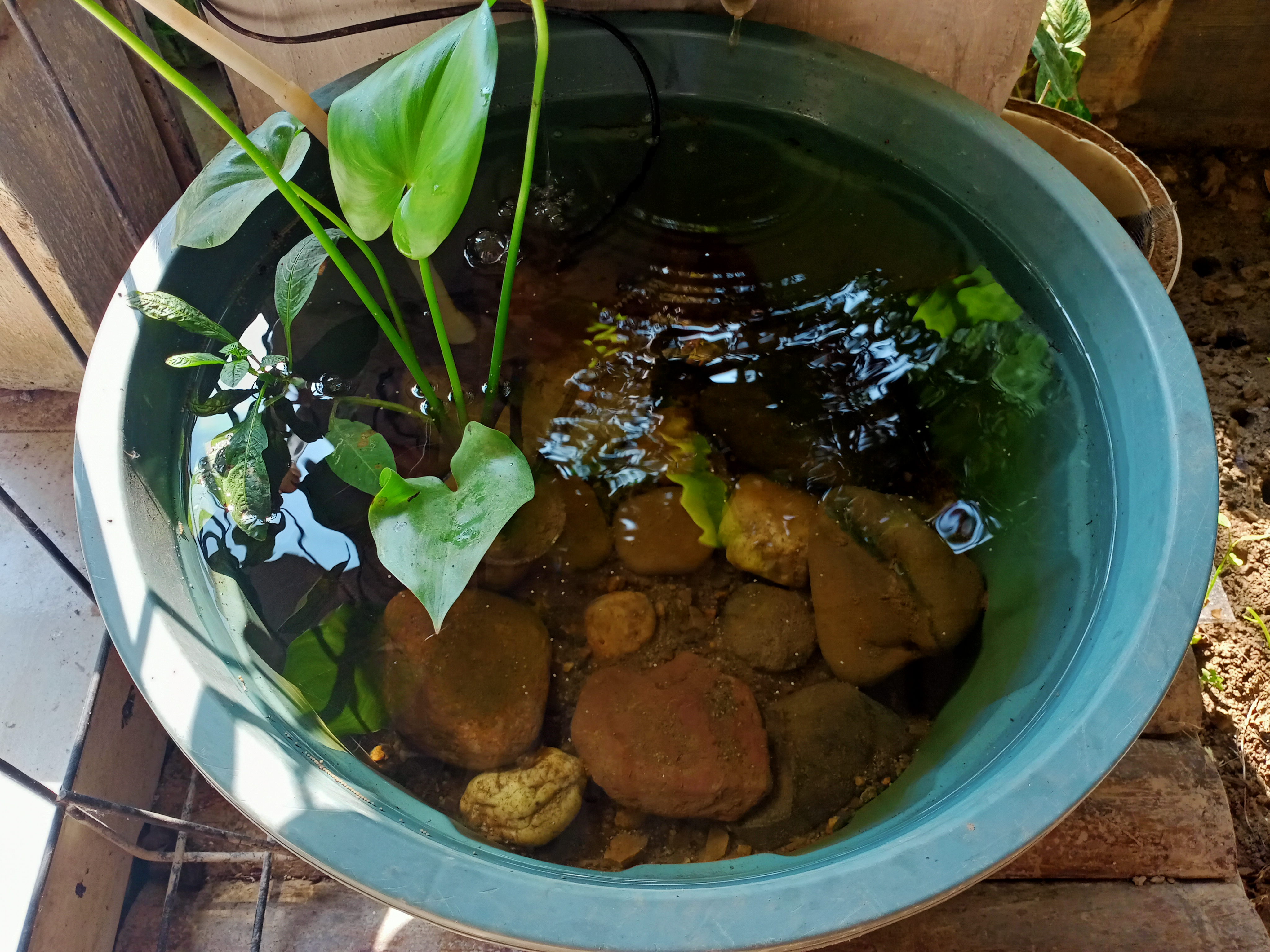 Memberi makan Ikan Sambil mencicil membuat postingan, aku juga memberi makan ikan-ikan yang ada di pot di teras depan rumah kami, yang kebetulan hanya ikan-ikan kecil karena tiga kolam ikan yang kami miliki tidak bisa difungsikan lagi yang disebabkan rusak berat pasca banjir yang lalu.