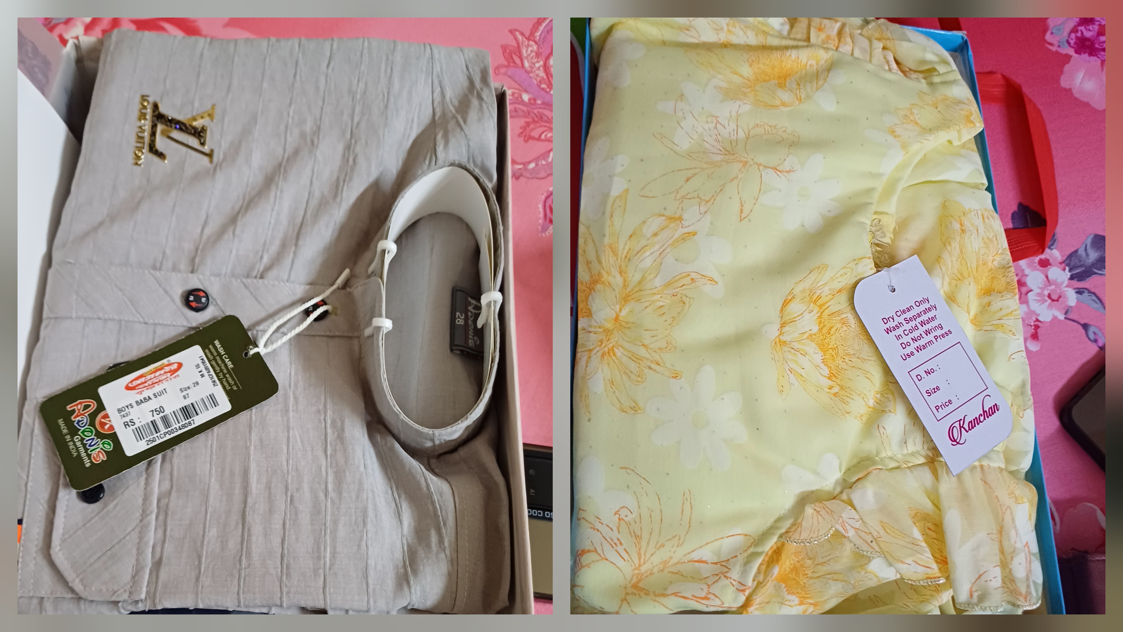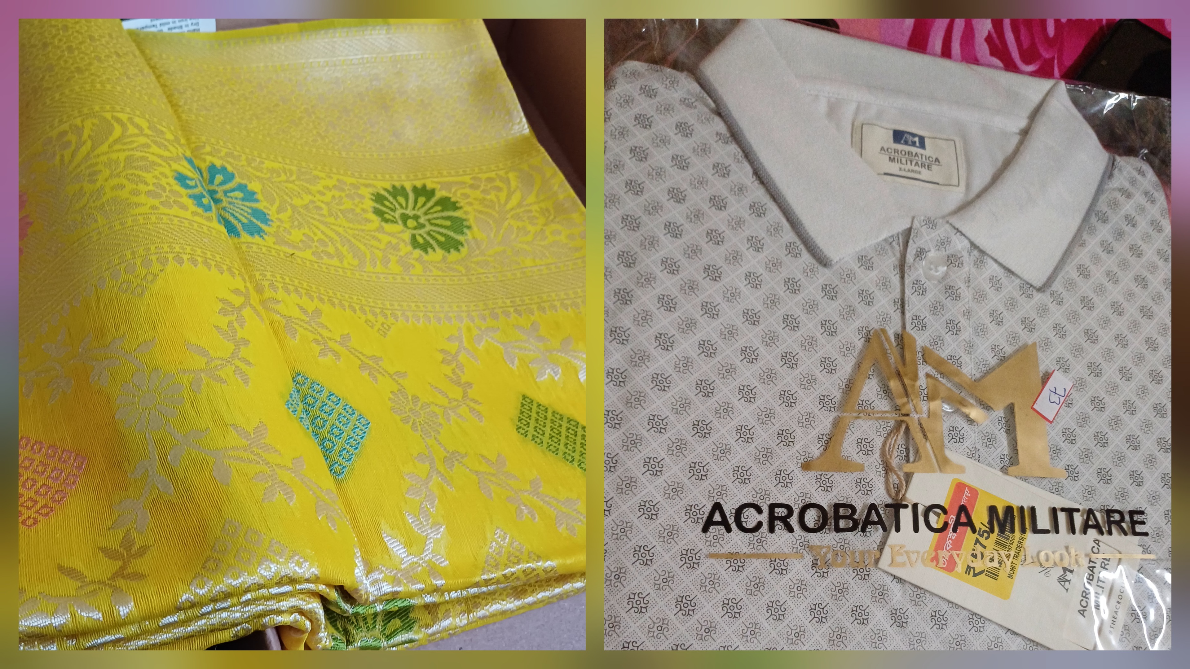 ওই দোকানে সমস্ত কেনাকাটা মিটিয়ে চলে গিয়েছিলাম আর একটা দোকানে ।সেই দোকানের নাম হলো আগমনী বাসন্তী বস্ত্রালয় ।এই দোকানটা কিছুদিন আগেই কৃষ্ণনগরে হয়েছে, এদের মেন ব্রাঞ্চ কাঁচরাপাড়া। ওদের ওখান থেকেই কাকিমার জন্য একটা শাড়ি কিনলাম। ছবিতে থাকা টি-শার্টের পাশে কাঁচা হলুদ ধরনের যে শাড়িটা সেই শাড়িটা। এর সাথে কিনে নিলাম ওদেরই ছেলের শার্ট প্যান্ট সেট।