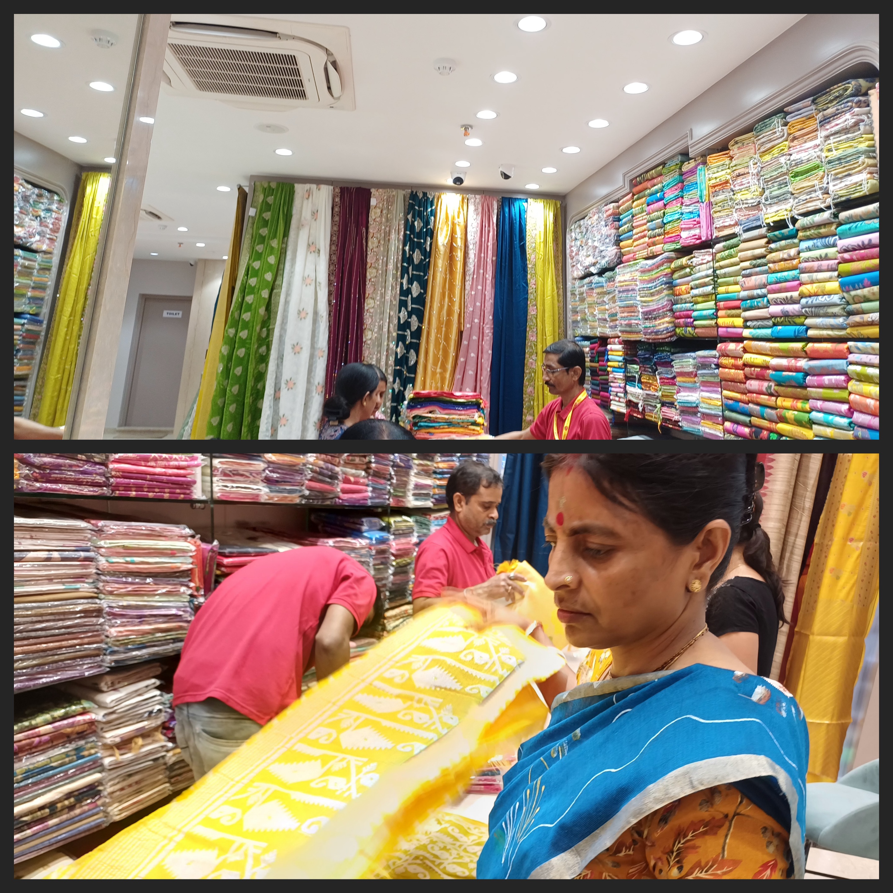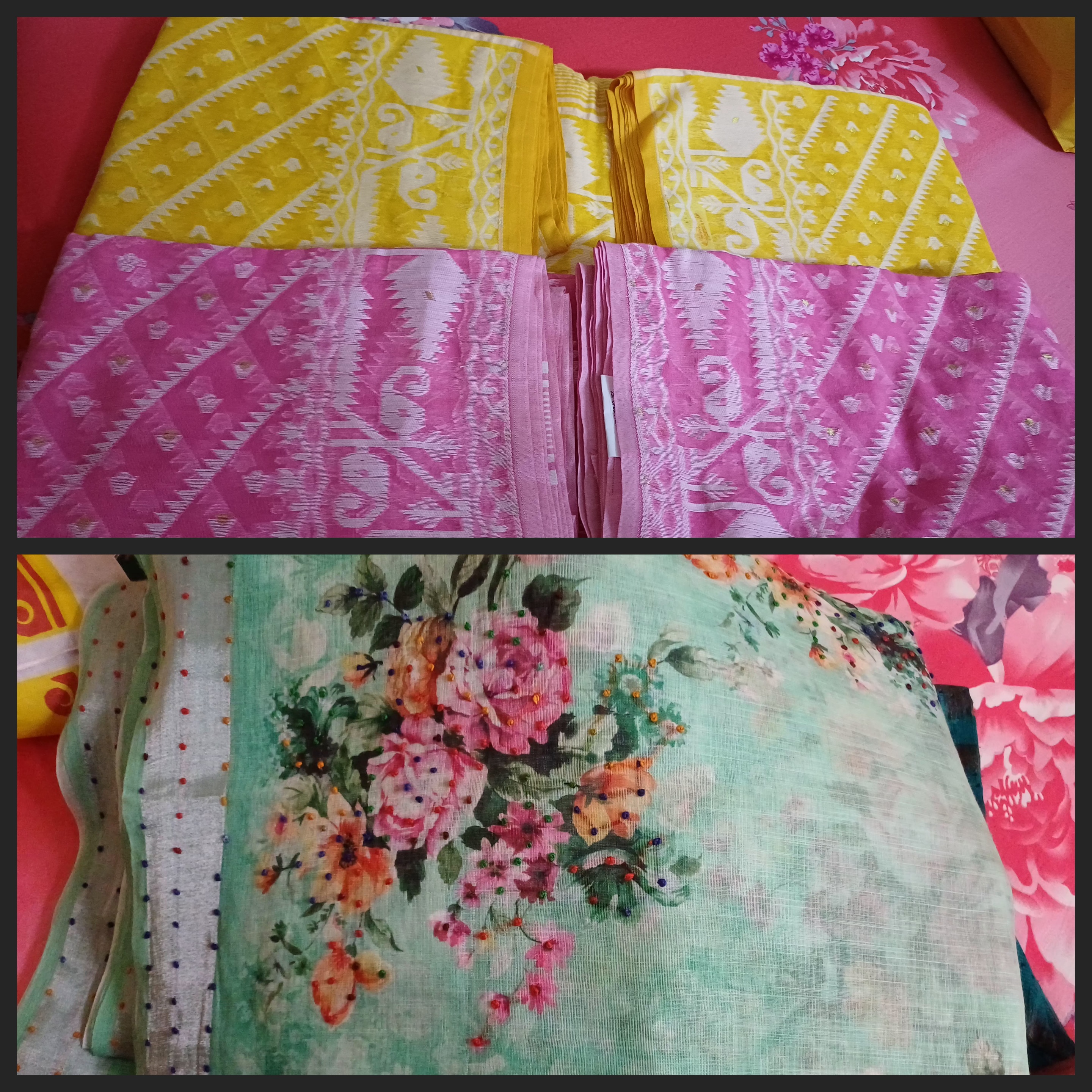এসব করতে করতে ওখানকার শাড়ির কালেকশনের দিকে মার একটু নজর গেল, তারপর মা অনেকগুলো শাড়ি দেখতে লাগলো। কিছু ব্যবহার করার শাড়ি মা খুঁজছিল ,তারপর এসব দেখতে দেখতে হঠাৎ করে কিছু শাড়ি চোখে পড়ল ,বেশ সুন্দর লাগলো। দামও বেশ অল্প, তাই মা দুটো ডিফারেন্ট কালারের একই শাড়ি নিয়ে নিল।। ওই যে একটা গোলাপি রঙের আর একটা হলুদ রঙের ।