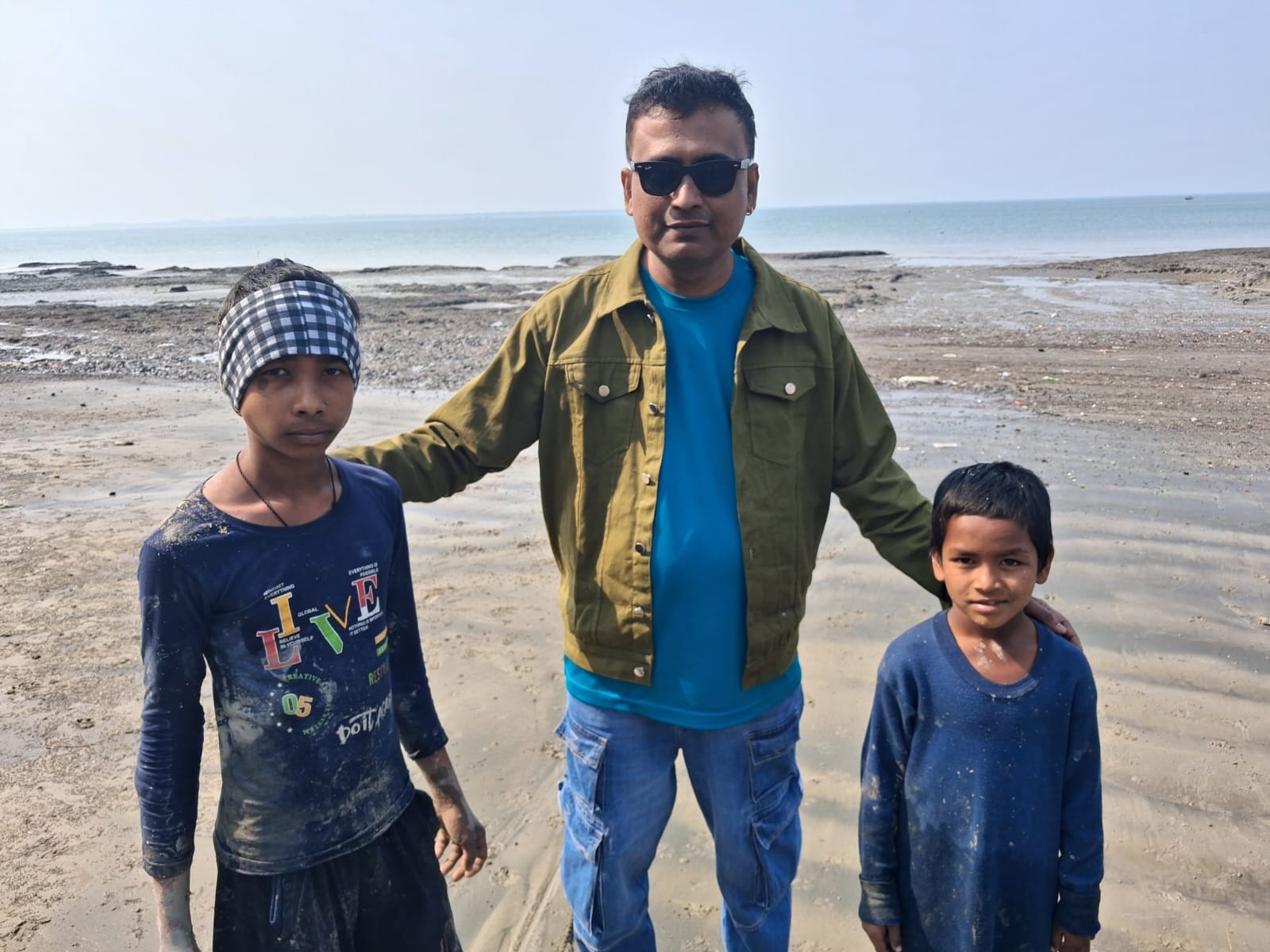 ঘাটের থেকে একটা নৌকা করে ১০ মিনিটের মধ্যে নদী পেরিয়ে মৌসুনি দ্বীপ গিয়ে পৌঁছই। ওখানে পৌঁছে আমরা হাল্কা ব্রেকফাস্ট করে নি। আমি খেয়েছিলাম ডিম টোস্ট আর চা আর অসীমদা শুধু ডবল ডিমের অমলেট খেয়েছিল। এরপর আমরা আবার একটা টোটো ধরে সি বীচে যাই। মৌসুনি আইল্যান্ডের বিশেষত্ব হলো এই দ্বীপের একদিকে নদী আরেকদিকে সমুদ্র। ওখানে গিয়ে আমরা ১ ঘন্টার মতো সময় কাটাই। সি বীচে দুটো বাচ্চা ছেলের সাথে আলাপ হলে আমি ওদের সাথে একটা ছবি তুলে নি।