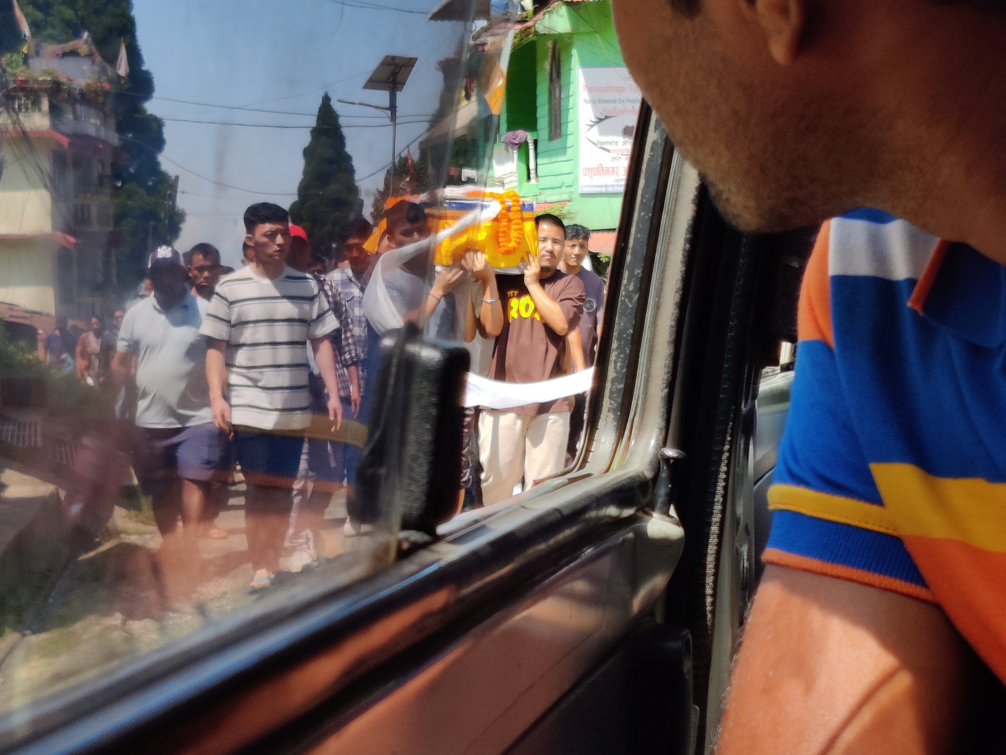 রাস্তায় যেতে যেতে দেখলাম বেশ কিছু লোক মিছিলের মতো হেঁটে আসছে। তবে আমাদের গাড়ির যিনি ড্রাইভার ছিলেন, তিনি জানালেন পাশেই কোনো একজন মারা গিয়েছেন, যার মৃতদেহ নিয়ে সকলে শবযাত্রা করছে। গাড়ির মধ্যে থেকে একটা ছবি তোলার চেষ্টা করেছিলাম, হয়তো আপনারা কিছুটা বুঝতে পারবেন।
