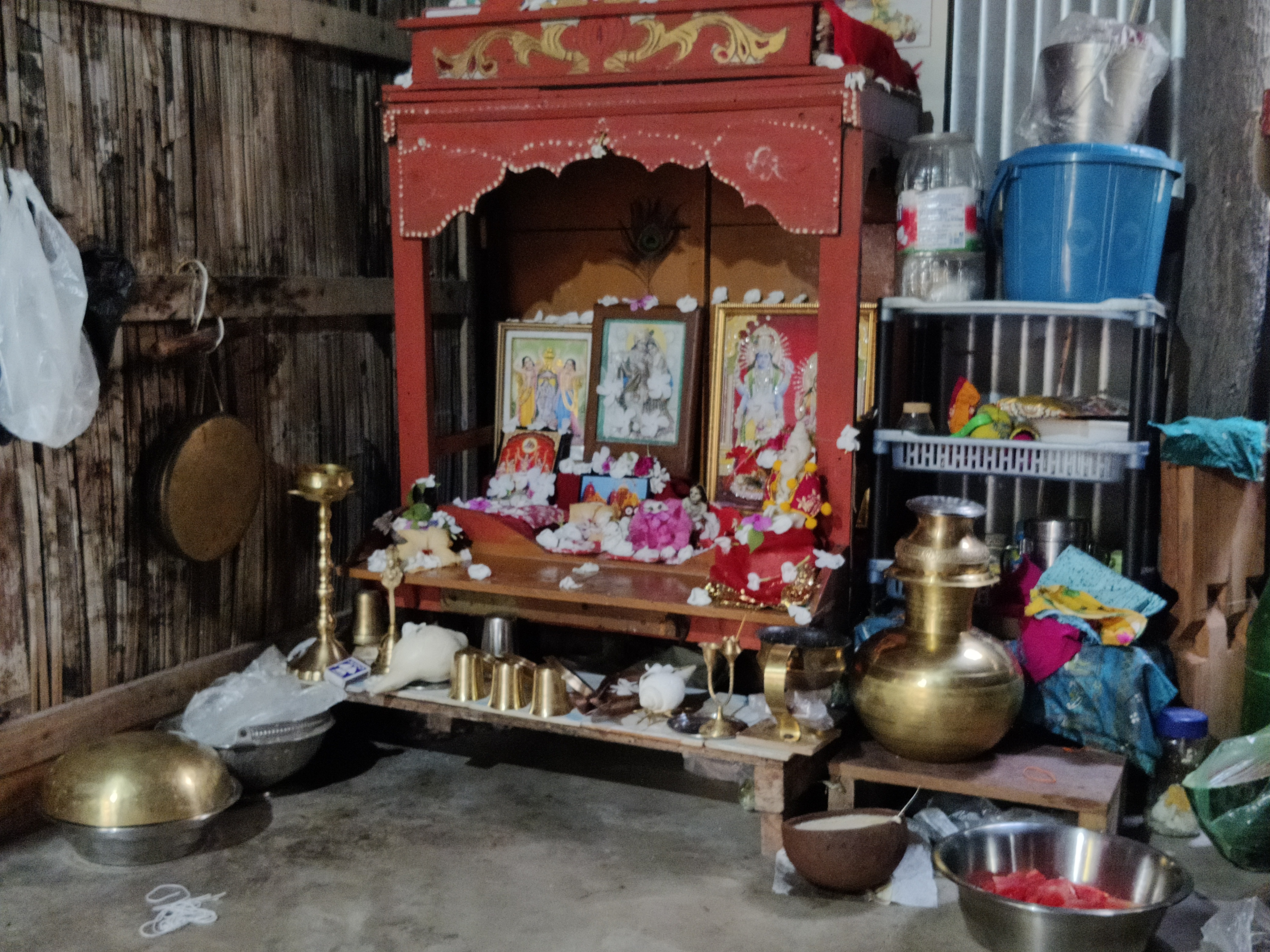 তখনই দিদির ঘরে ঠাকুরের আসনের ছবিটা তুলেছিলাম। যদিও দিদির আর্থিক অবস্থা ততটাও ভালো নয়, ঘরবাড়িও ভীষণ সুন্দর নয়, তবে মাটির ঘর হলেও এতো সুন্দর ভাবে সাজানো গোছানো যা, যেকোনো পাকা বাড়ির সৌন্দর্য্যকে হাড় মানায়। দিদি দুপুর বেলায় ঠাকুরের সম্পূর্ণ আসনটা, গাছ থেকে তোলা সাদা ফুল দিয়ে এতো সুন্দর সাজিয়েছিল, যেটা দেখে ছবি তোলার লোভ সামলাতে পারিনি।