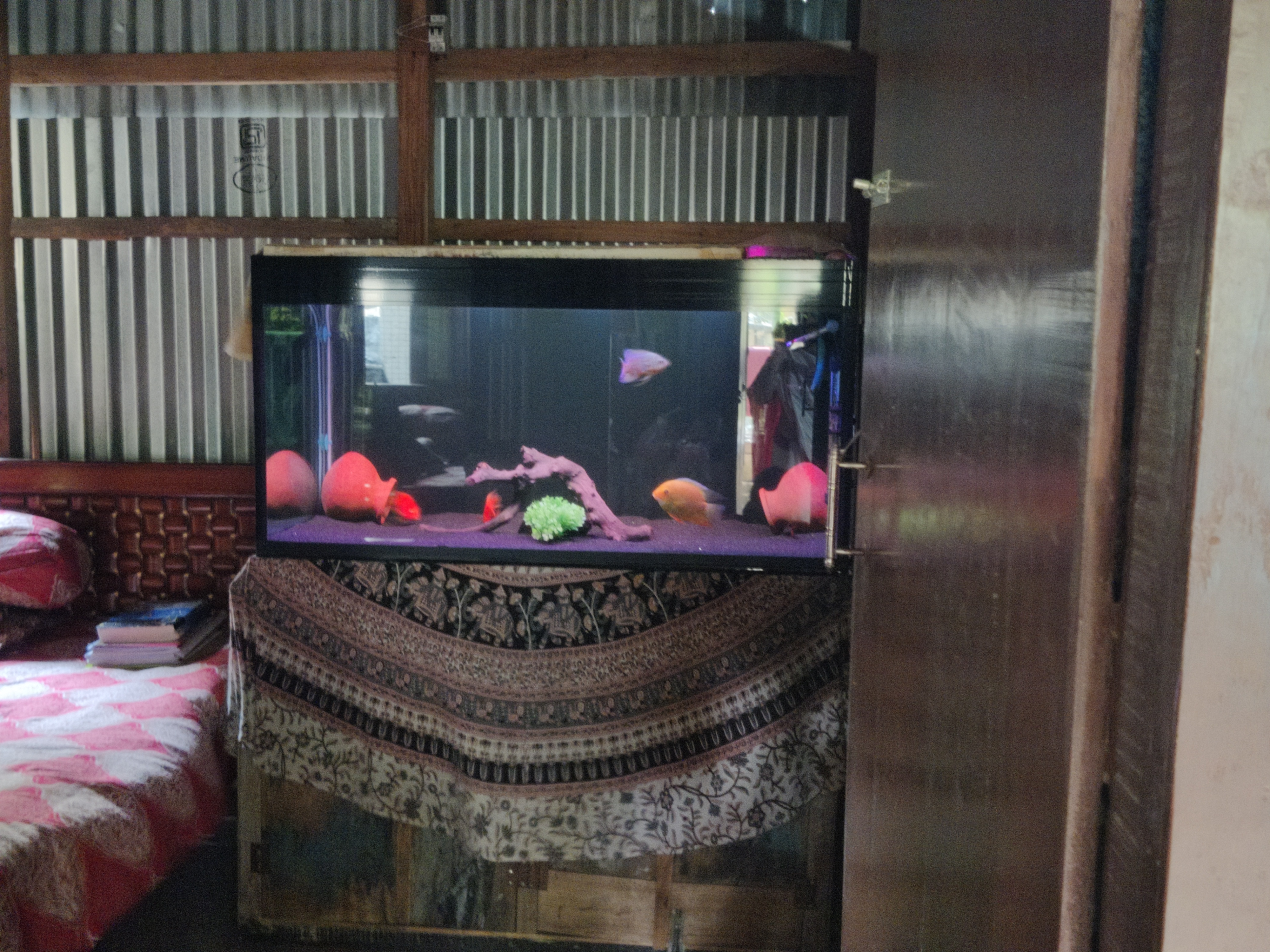 এরপর চোখ পরলো পাশের ঘরে রাখা অ্যাকুরিয়ামের দিকে। দিদির ছেলের ভীষণ অ্যাকুরিয়াম পছন্দ। তাই কষ্ট হলেও ছেলের এই আবদারটা দিদি পূরণ করেছে। অনেকটা বড় অ্যাকুরিয়ামের মধ্যে বেশ কয়েকটা মাছও রয়েছে। বহু বছর ধরেই এটা বাড়িতে রয়েছে, আর মাছগুলোর সম্পূর্ণ যত্ন দিদির ছেলে করে থাকে।