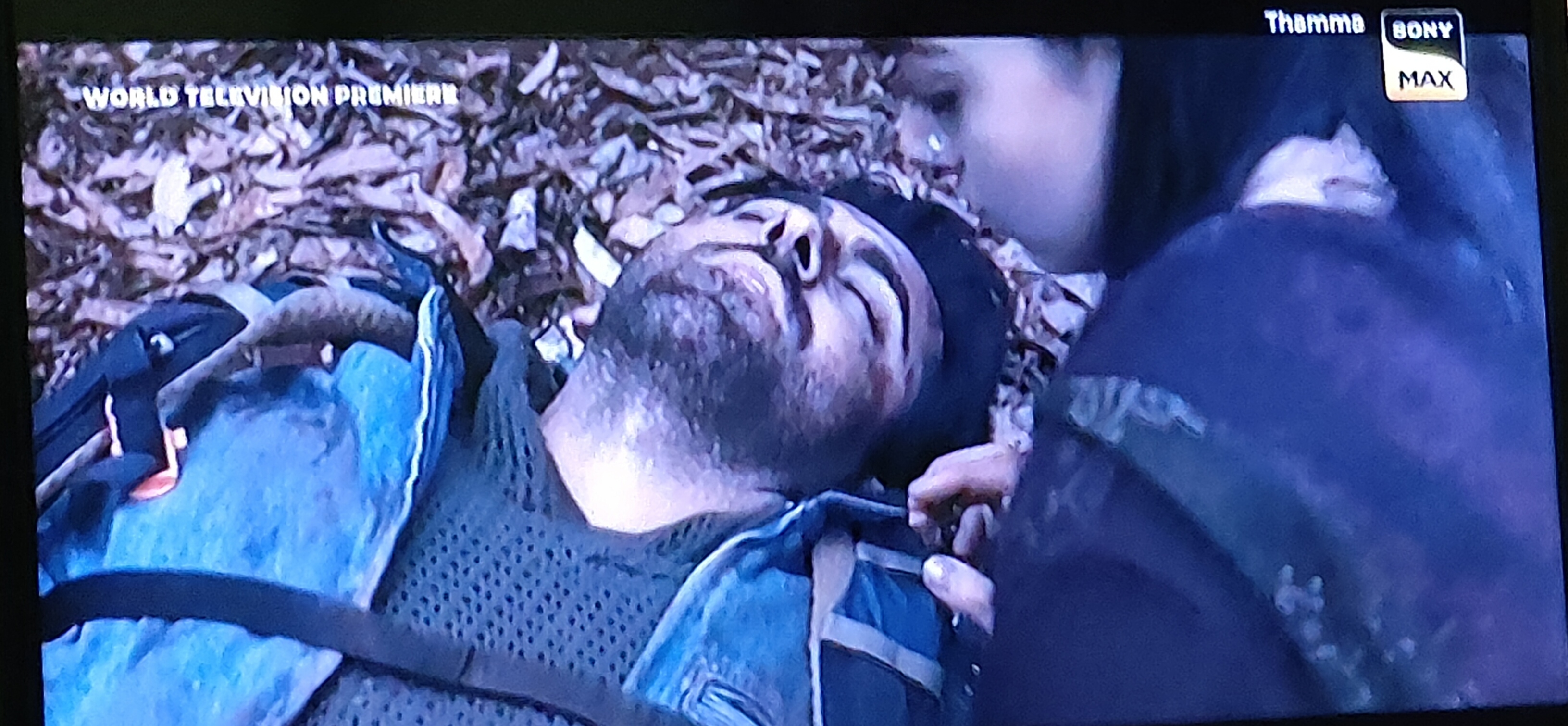 Upon entering the jungle, his friends abandon him, leaving him to fend for himself. After losing consciousness, he awakens within a damaged aeroplane, where he encounters the female lead, Rashmika Mandanna, who plays the character Tarka—a being that is not human but rather a betal or vampire.