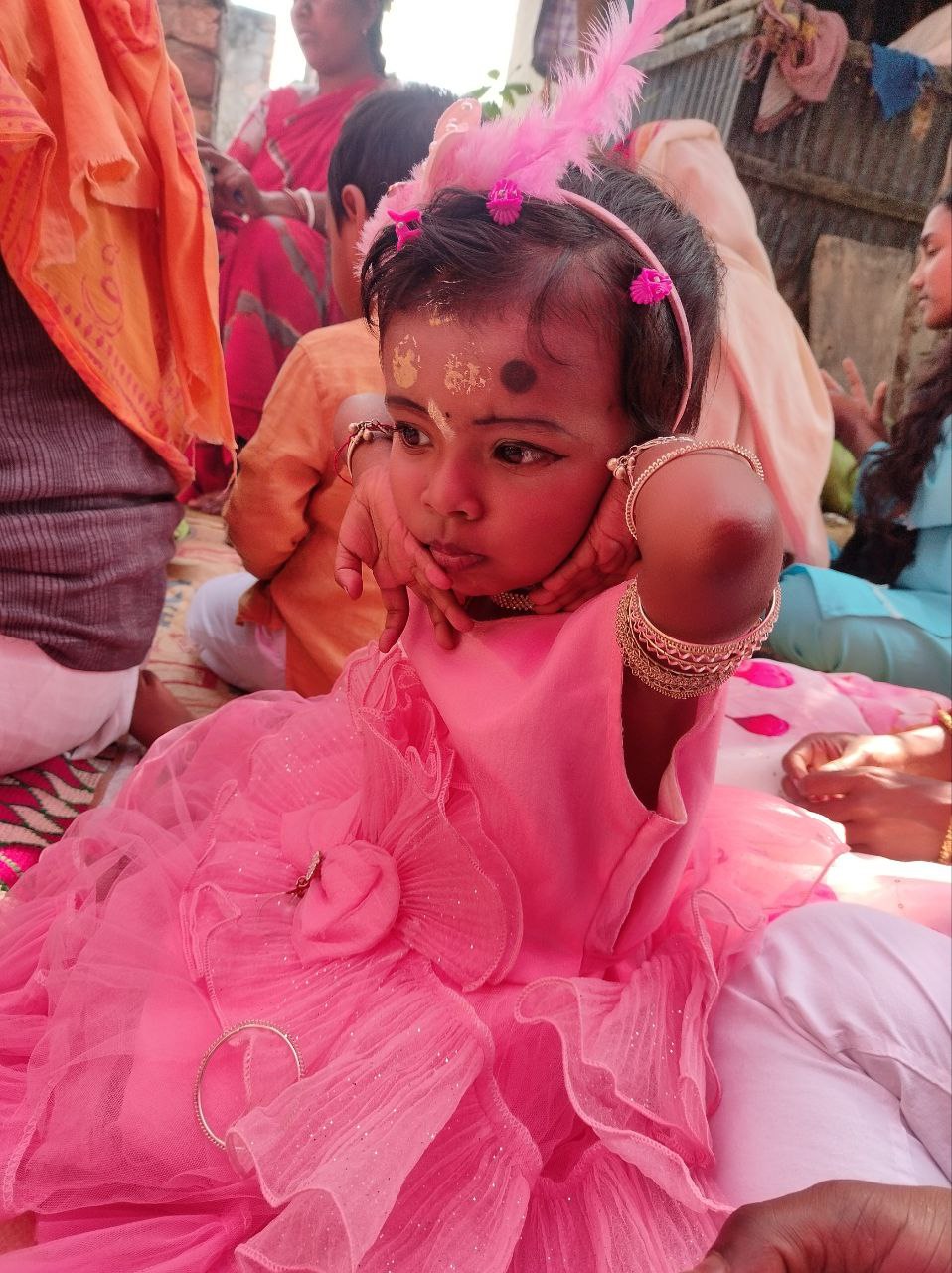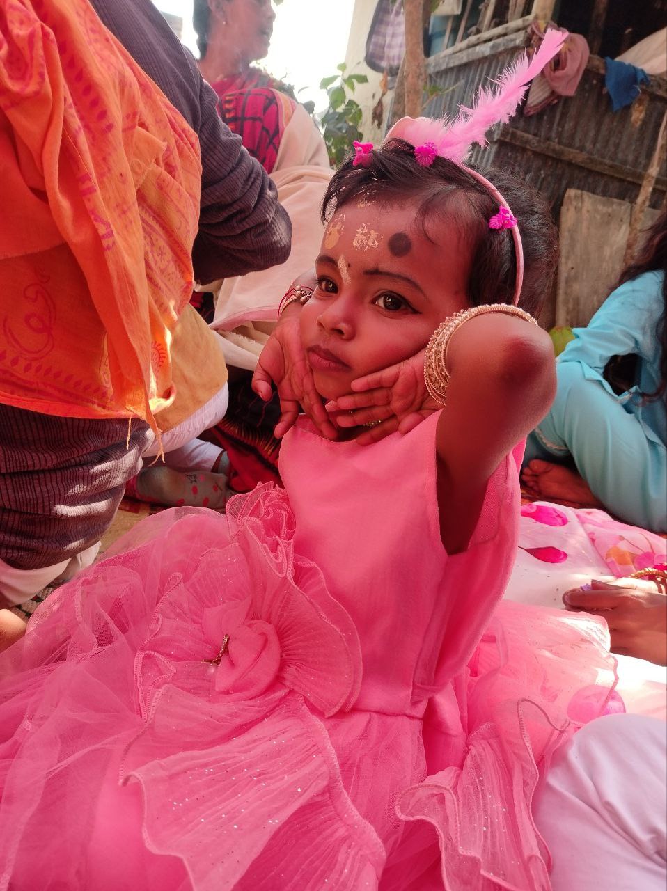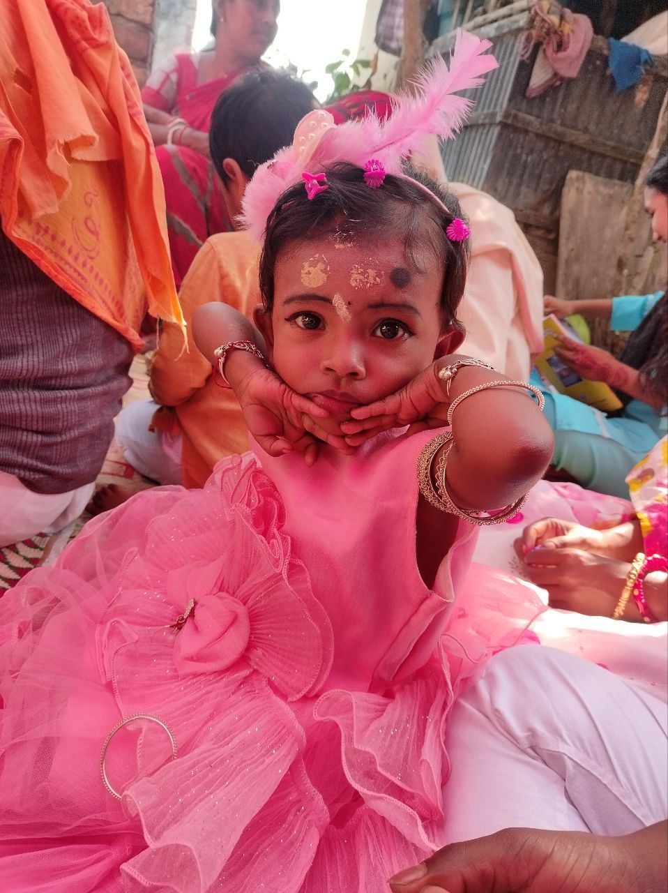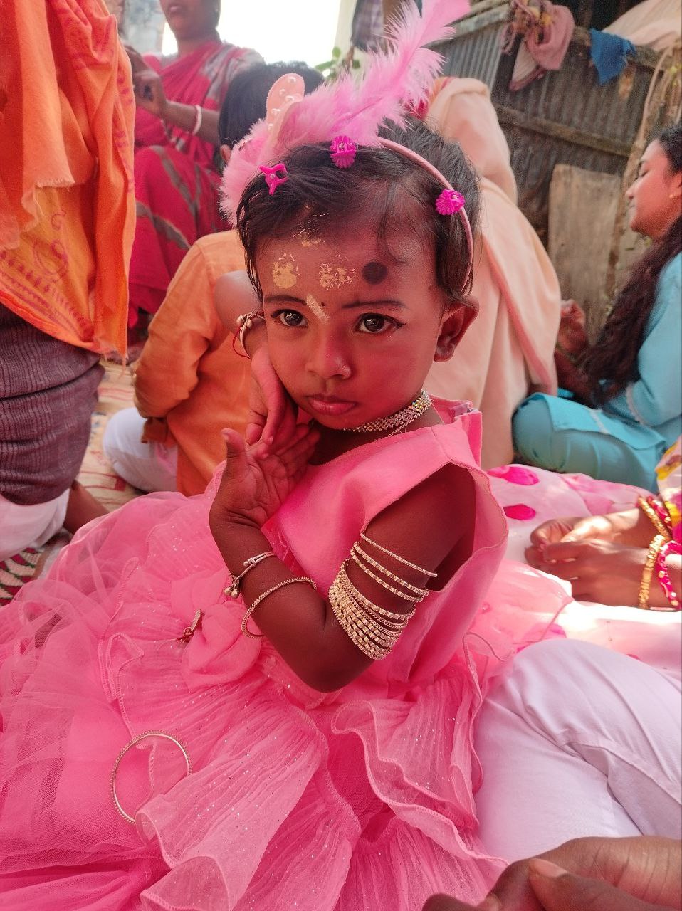 আমার বন্ধুর মেয়ে! সরস্বতী পূজার সময় একসাথে অঞ্জলি দিতে বসেছিলাম। প্রথমে আমি ওকে কোলে নিতে চাইলে আমার কাছে আসছিলো না। তবে কিছু সময় বাবাকে নিয়ে আমার পাশে বসে থাকার কারনে আমার প্রতি হয়ত কিছুটা বিশ্বাস আর ভালোবাসা জন্মেছে।
