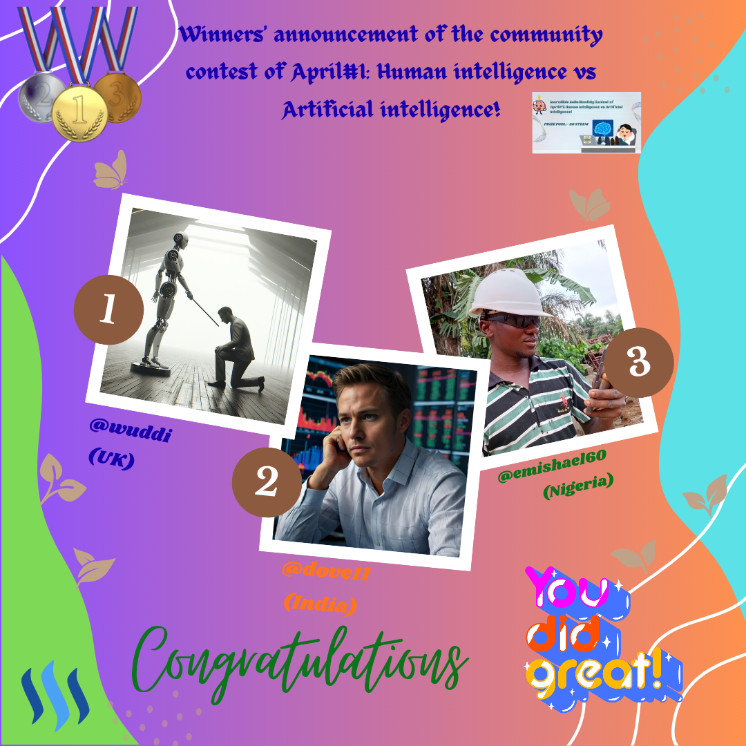 | meraindia [Posts] 7:35:12 pm Winners' announcement of the community contest of April#1: Human intelligence vs Artificial intelligence! |