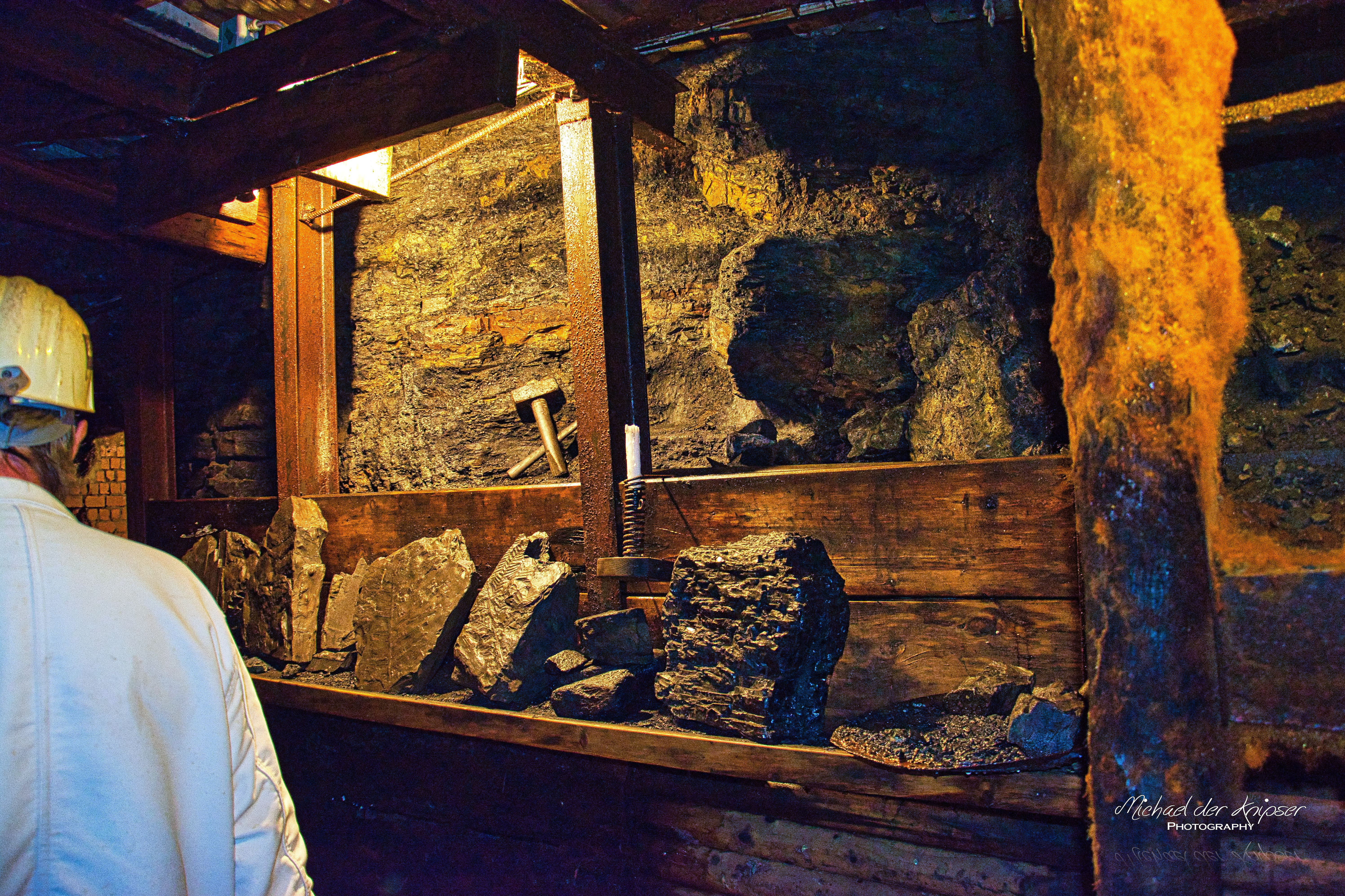 My wife sat in front of me, the seating position was very familiar to us. Now it's time to go inside. There was hardly any light, everything was shaking and it suddenly got cooler. From this point on, I could no longer take pictures. The ride also ended after about 5 min and it was time to "all get out". Our miner led us to an exhibition wall where different coal was displayed. He told us how people mined the hard coal in the 18th century. But the hard coal could keep the huts just above 0°C in winter.