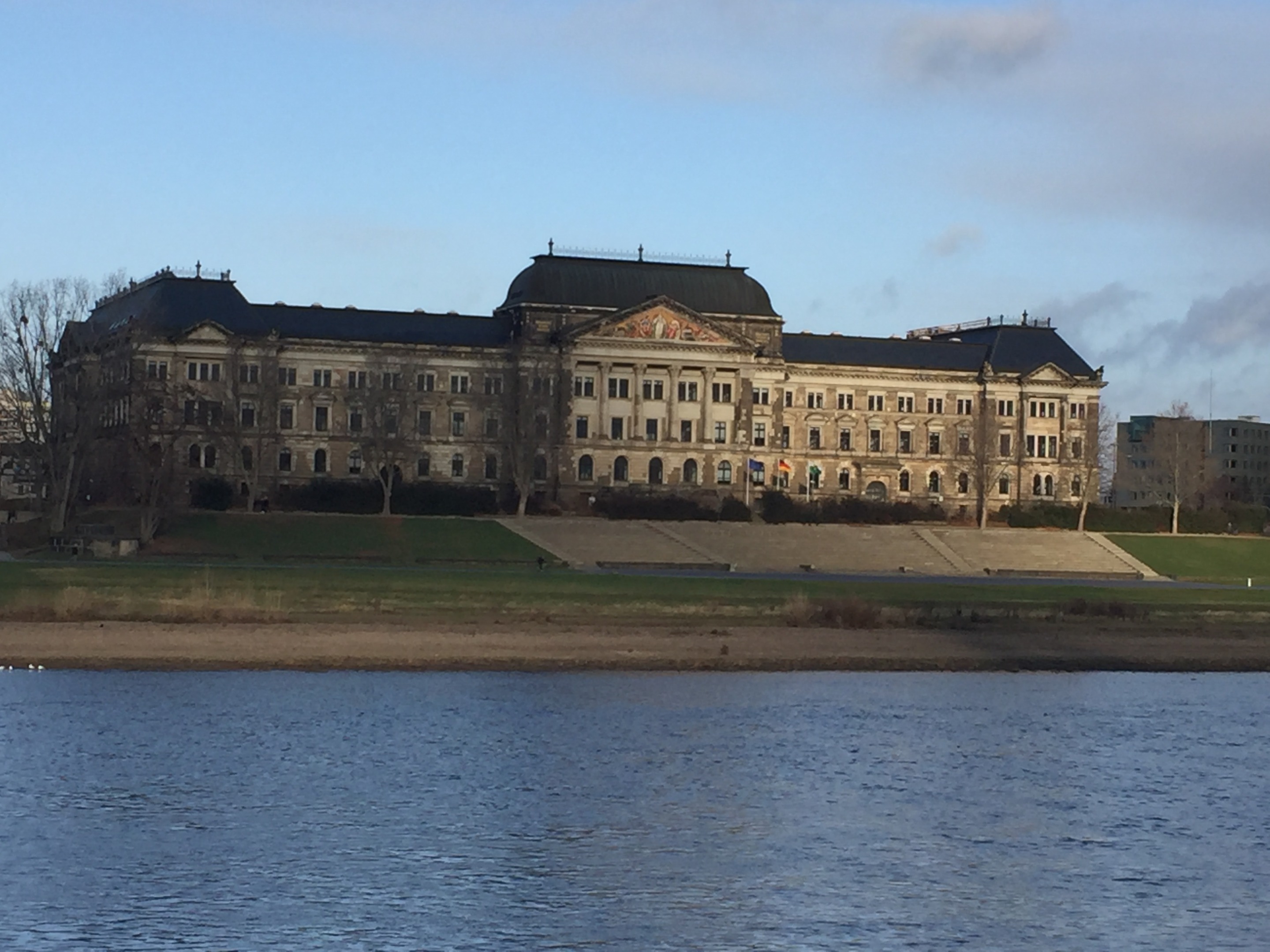 The building was constructed in the neo-renaissance style according to designs by Otto Wanckel and Ottomar Reichelt between 1890 and 1896. It is located directly on the banks of the Elbe between Carolabrücke and Augustusbrücke. The Elbe front bears a painting by the painter Anton Dietrich. It shows the allegory of Saxonia surrounded by the arts as well as the revenues of the state. In 1945 during the bombing of Dresden, the building was severely damaged but was rebuilt in the 1950s. Since 1990, it has once again housed the Ministry of Finance of the Free State of Saxony. In summer, the "Filmnächte am Elbufer" take place directly in front of the building. They are Germany's largest open-air cinema festival and have attracted around 200,000 spectators each of the recent years.