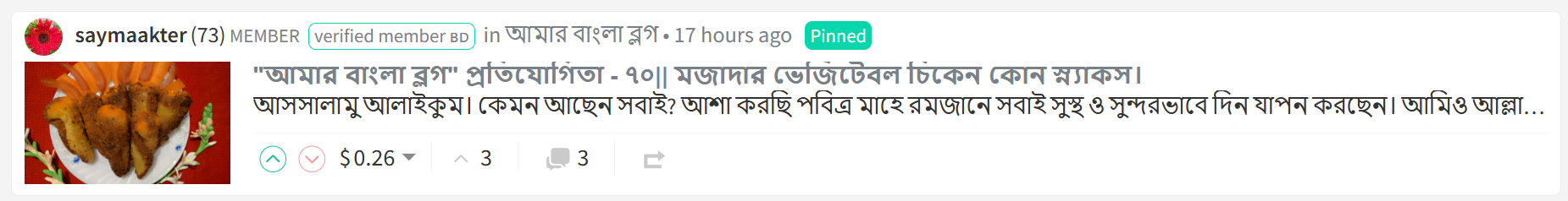 কমিউনিটির সকলের পরিচিত সাইমা আক্তার ম্যাডামের একটি রেসিপি আমার খুবই ভালো লেগেছে। রেসিপিটির নাম হল: মজাদার ভেজিটেবল চিকেন কোন স্ন্যাকস।- যা তিনি কনটেস্টে অংশগ্রহণের জন্য প্রকাশ করেছেন।