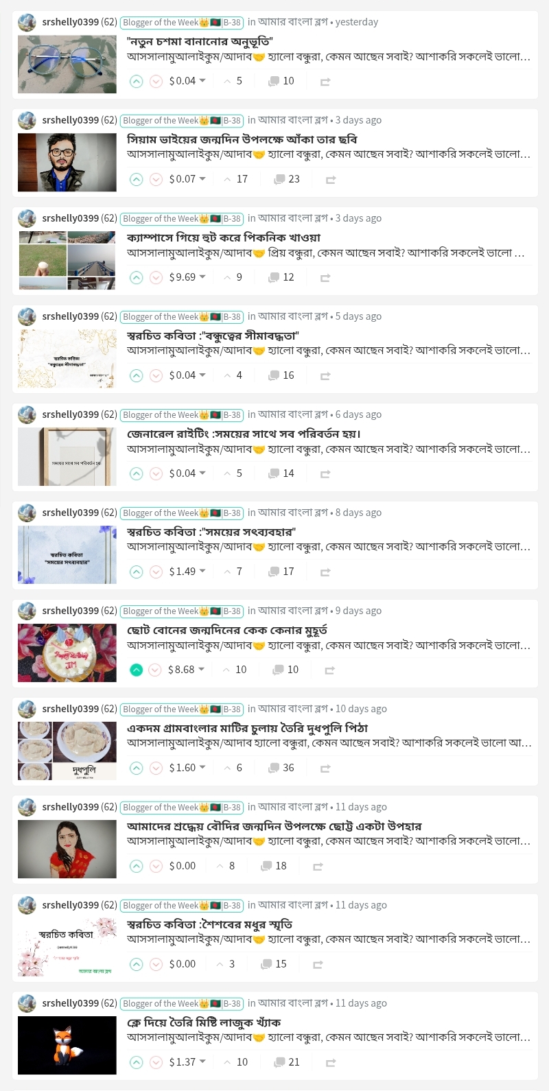 | 02 | @srshelly0399 | $25 UPVOTE | "স্বরচিত কবিতা :পাখির মতো স্বপ্ন" |