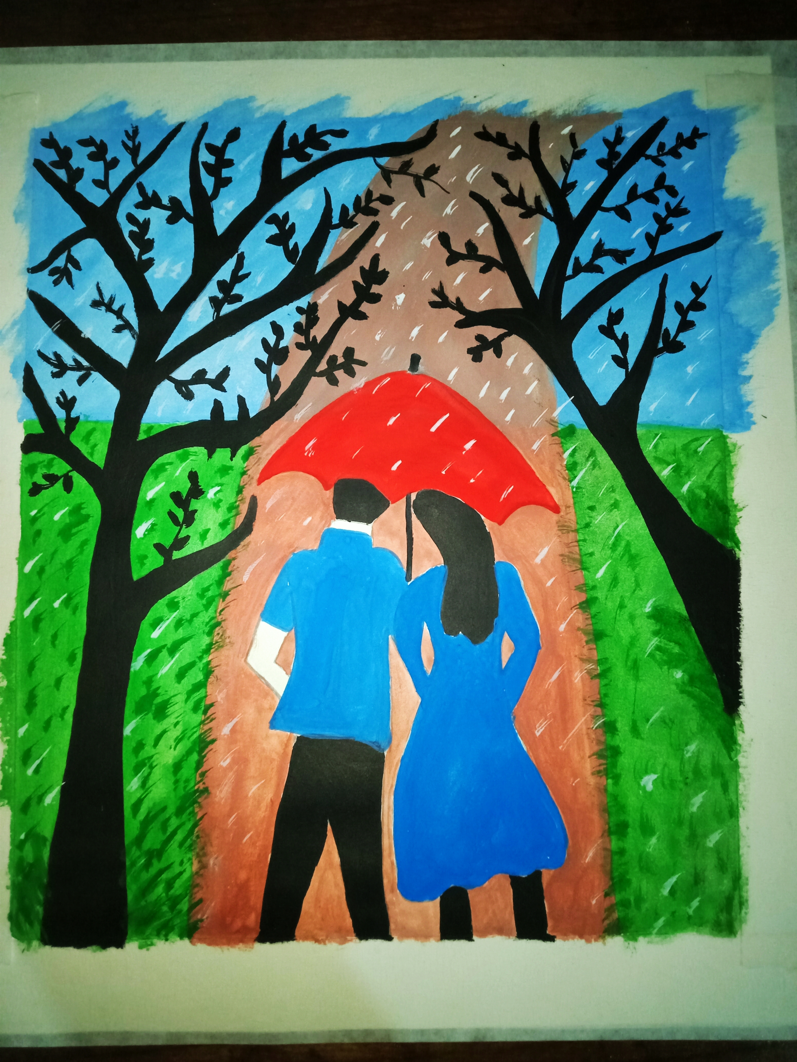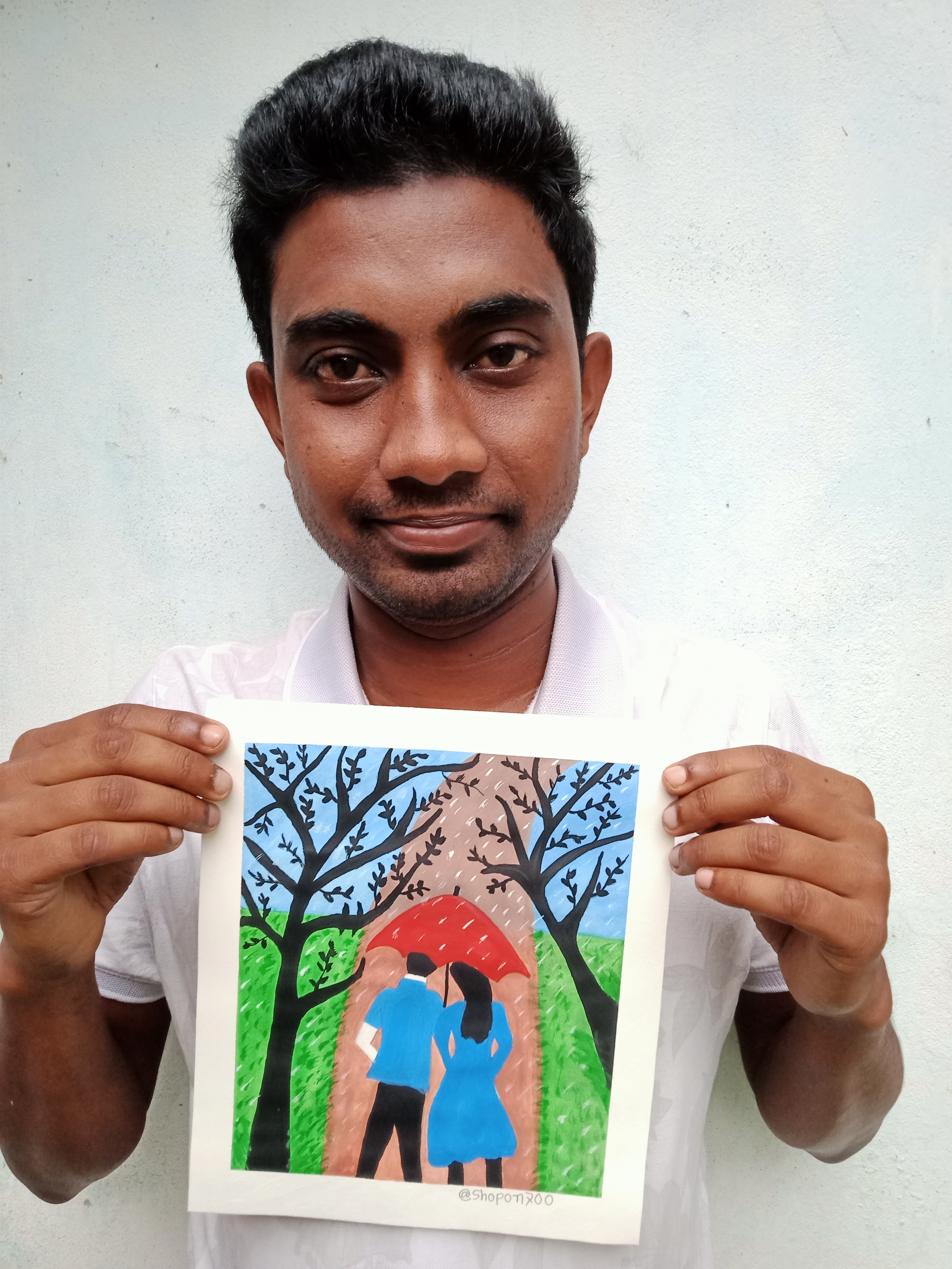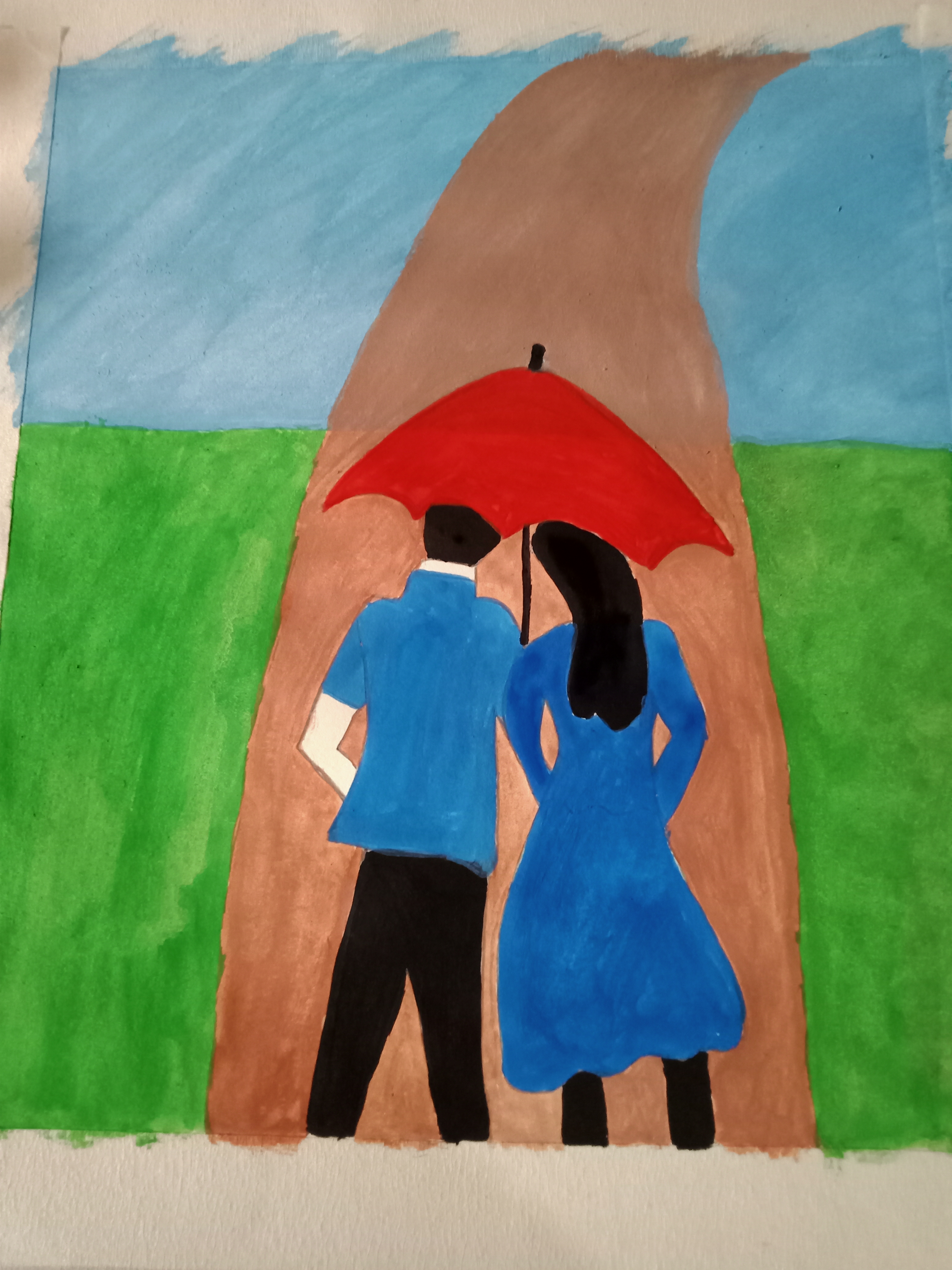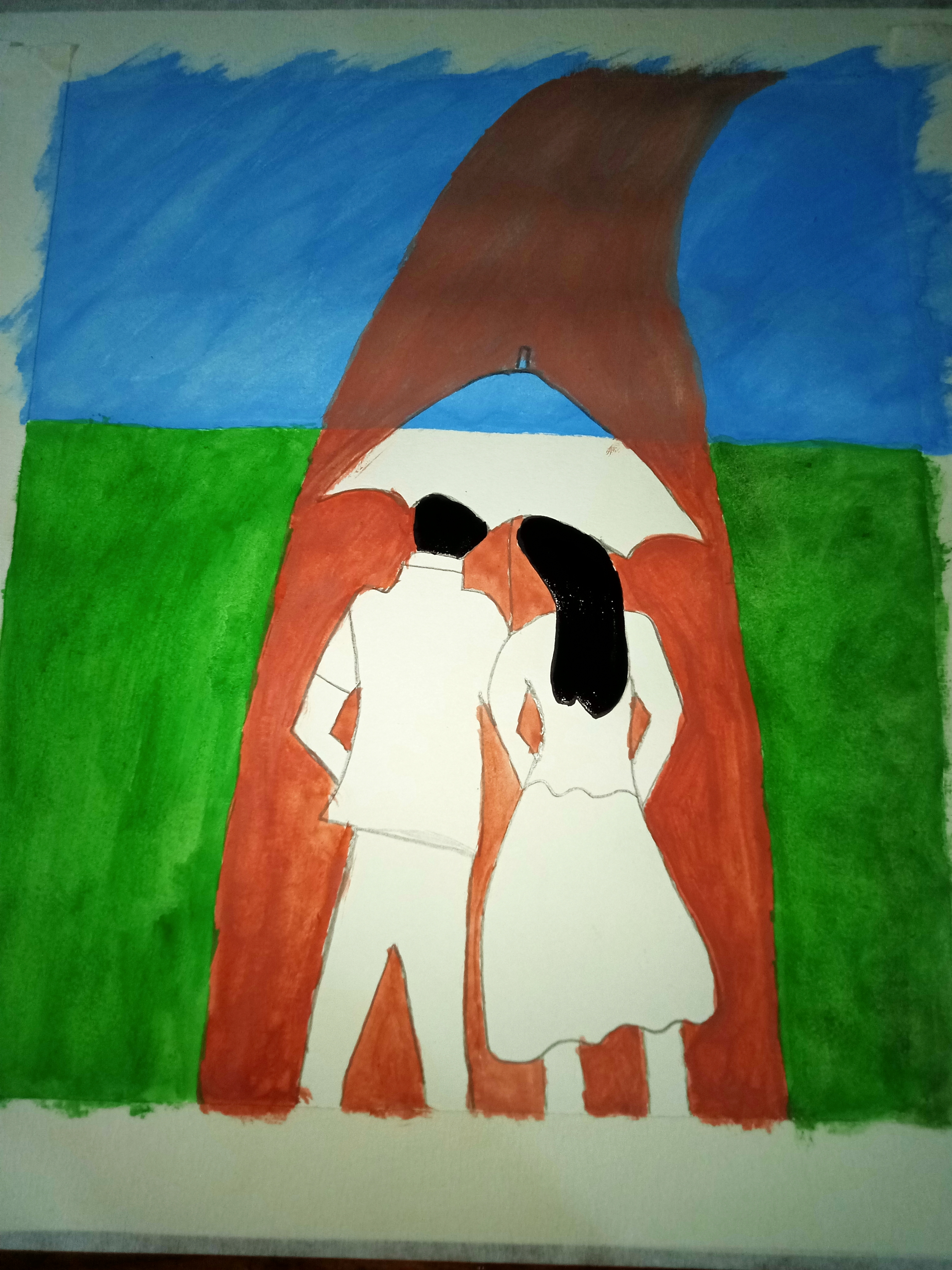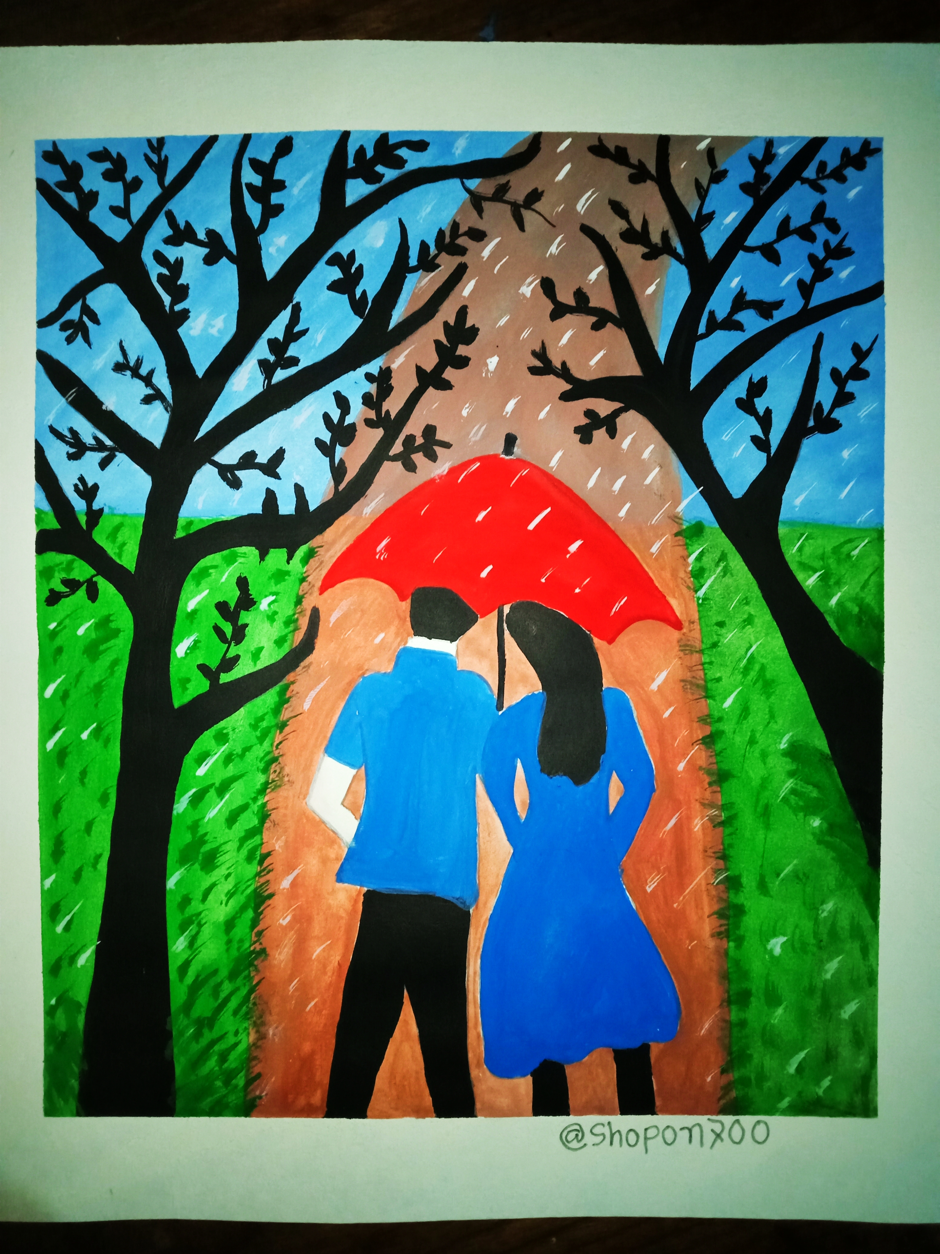 বৃষ্টি ভেজা দিনে ছাতা মাথায় দিয়ে দুজন হেটে যাচ্ছে। খুব সুন্দর হয়েছে পেইন্টিংটি। একটা রোমান্টিক ভাব আছে। চমৎকার কালার কম্বিনেশন এর মাধ্যমে সুন্দর একটি পেইন্টিং করে আমাদের সাথে শেয়ার করার জন্য ধন্যবাদ।