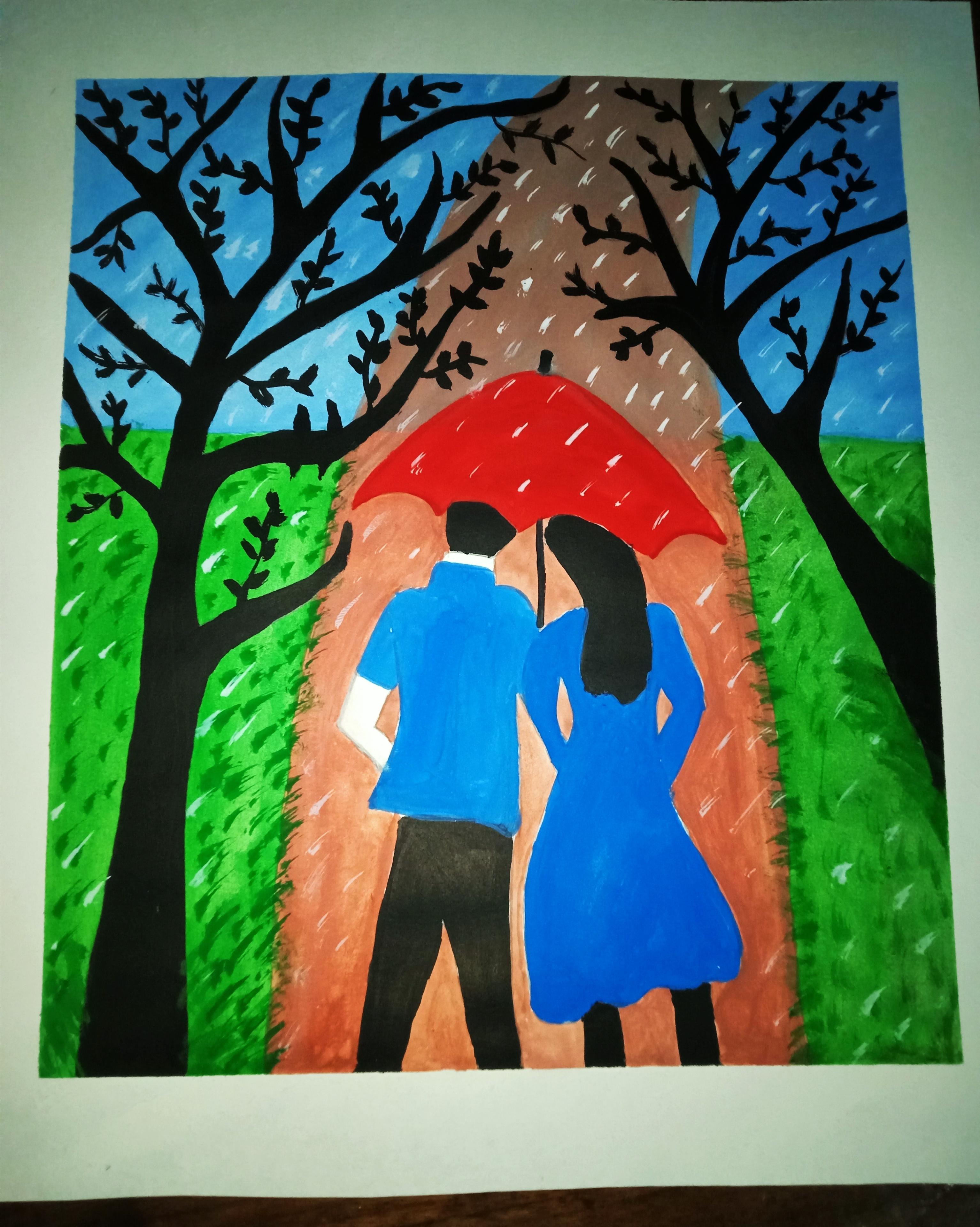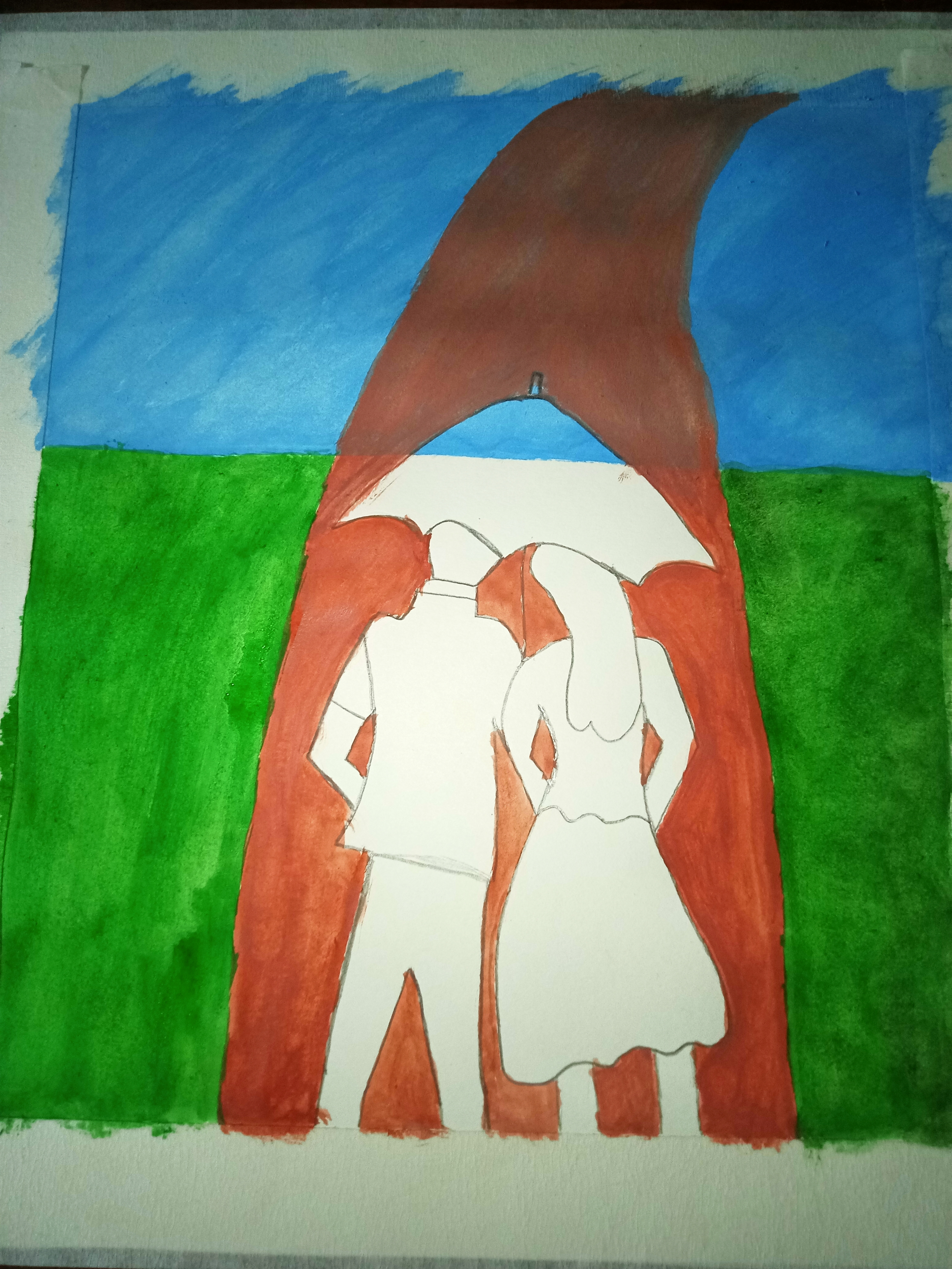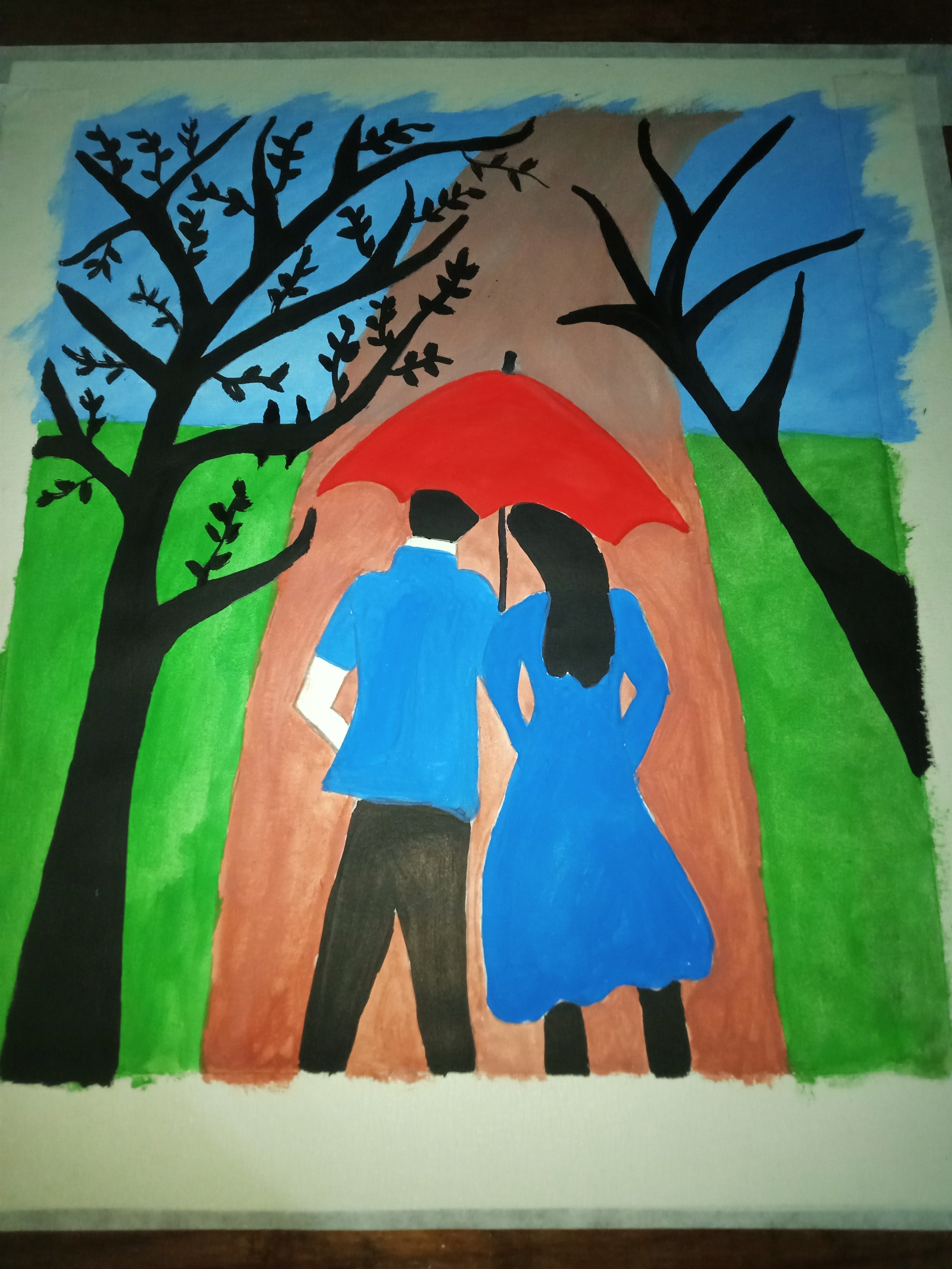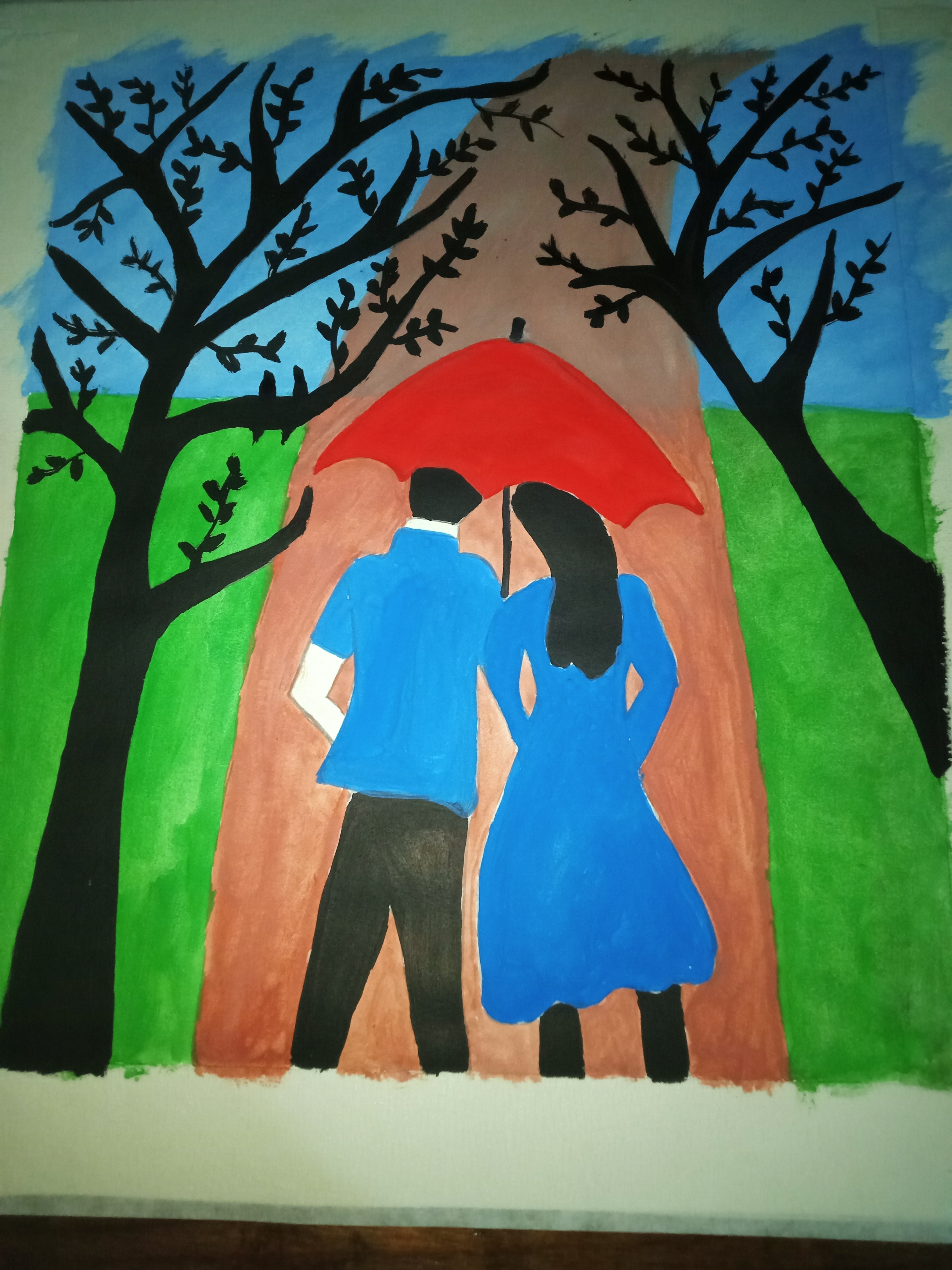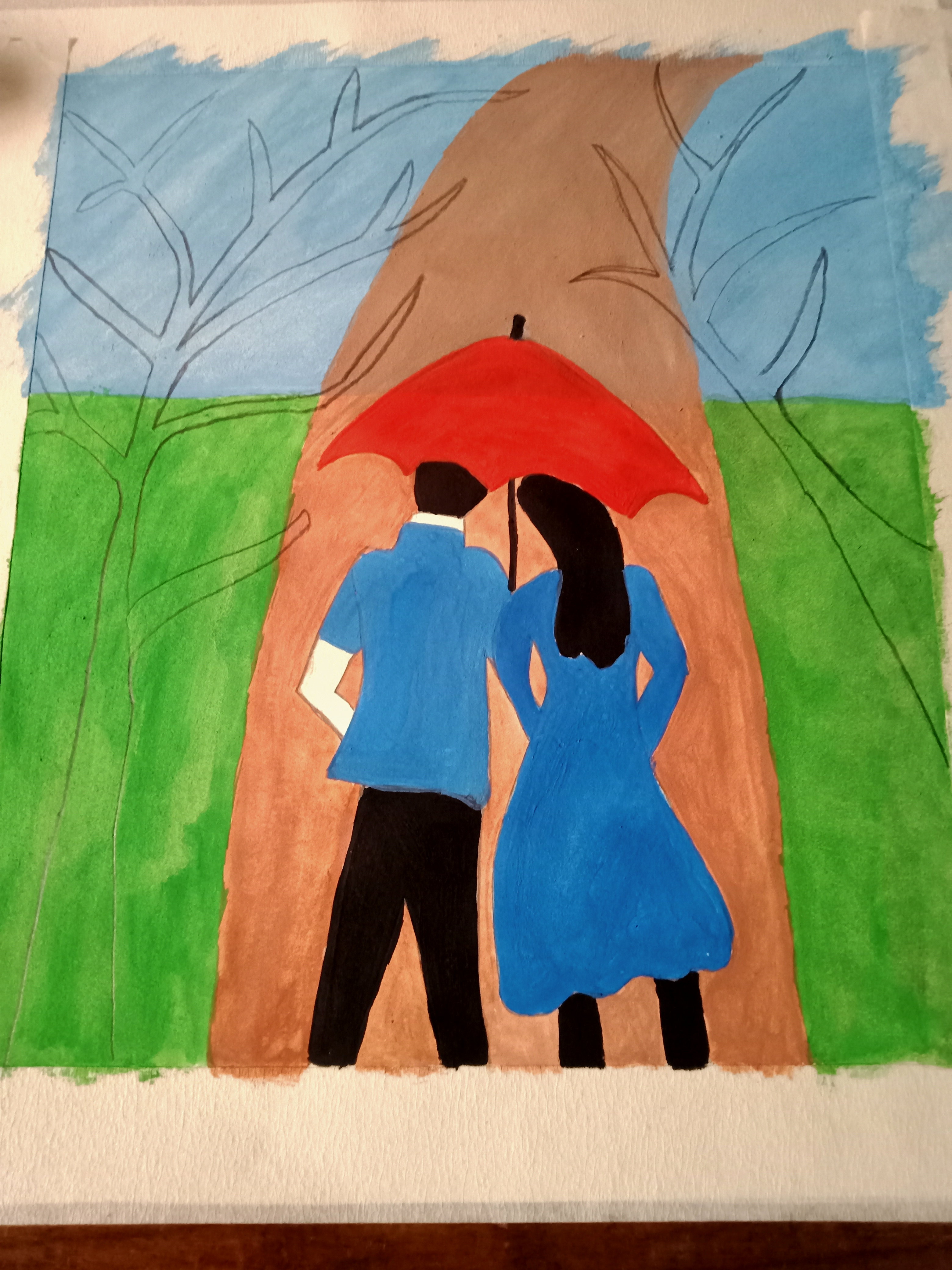 বৃষ্টি ভেজা দিনে ছাতা মাথায় দিয়ে দুজন হেটে যাচ্ছে। খুব সুন্দর হয়েছে পেইন্টিংটি। একটা রোমান্টিক ভাব আছে। চমৎকার কালার কম্বিনেশন এর মাধ্যমে সুন্দর একটি পেইন্টিং করে আমাদের সাথে শেয়ার করার জন্য ধন্যবাদ।