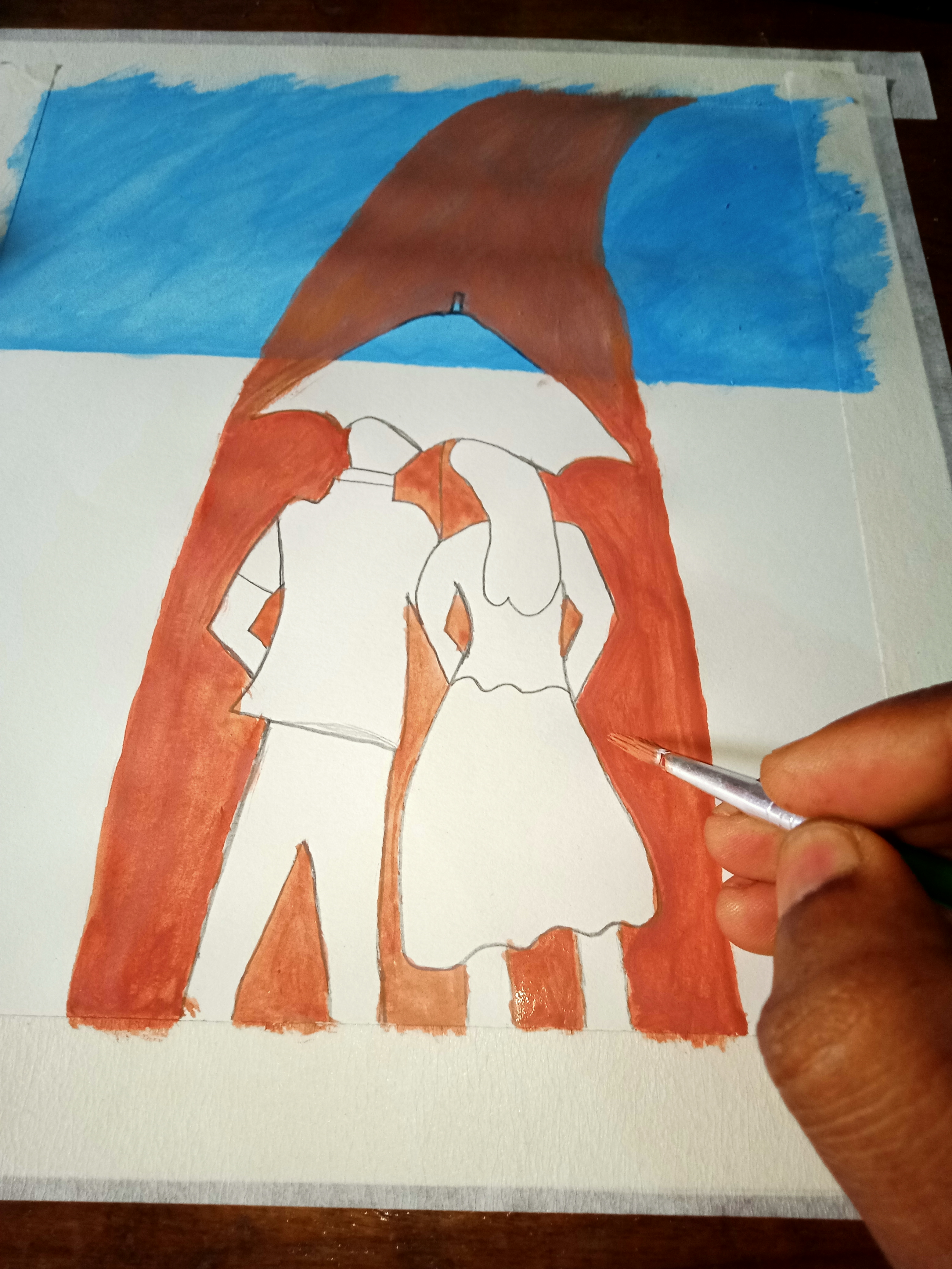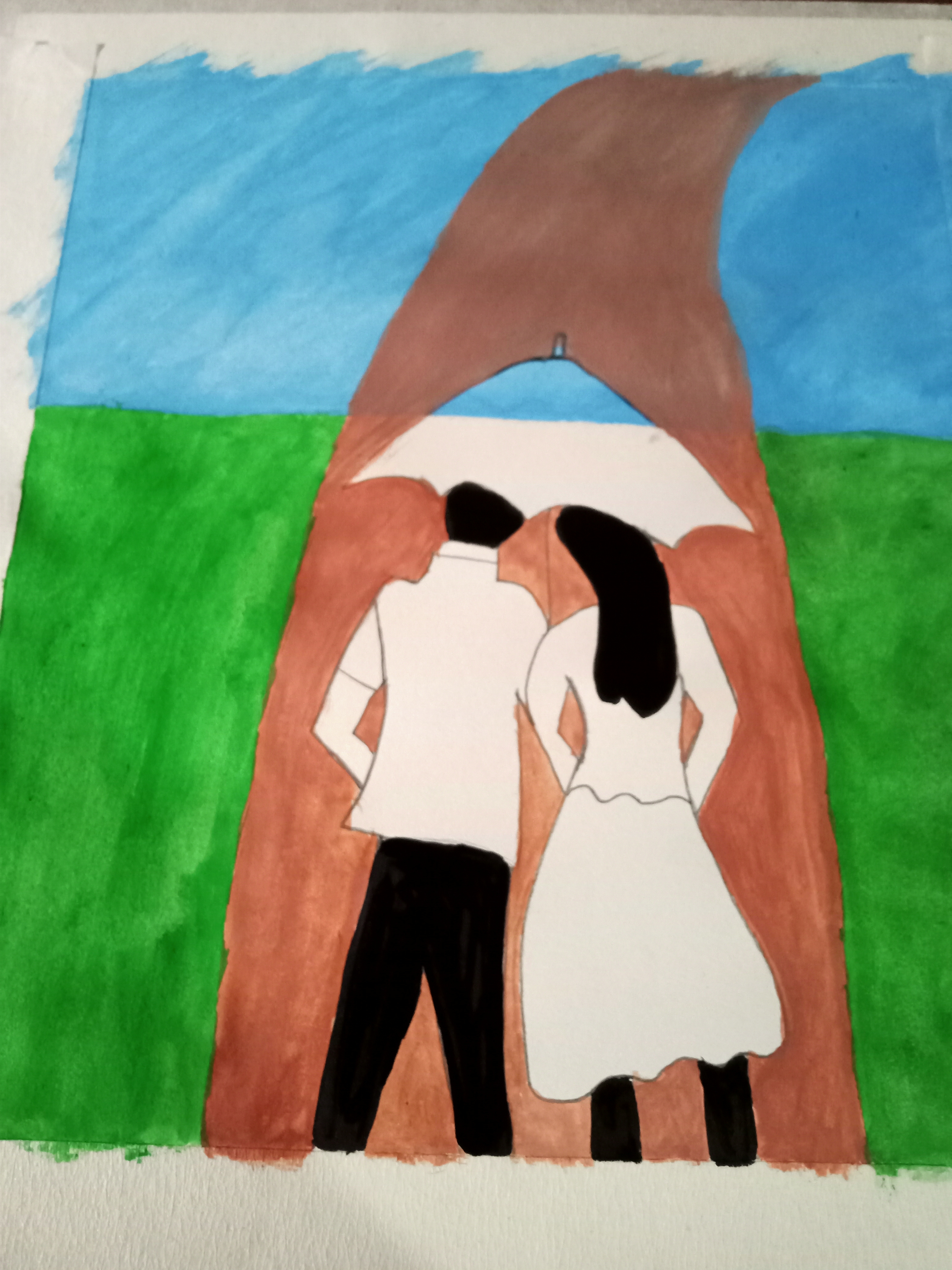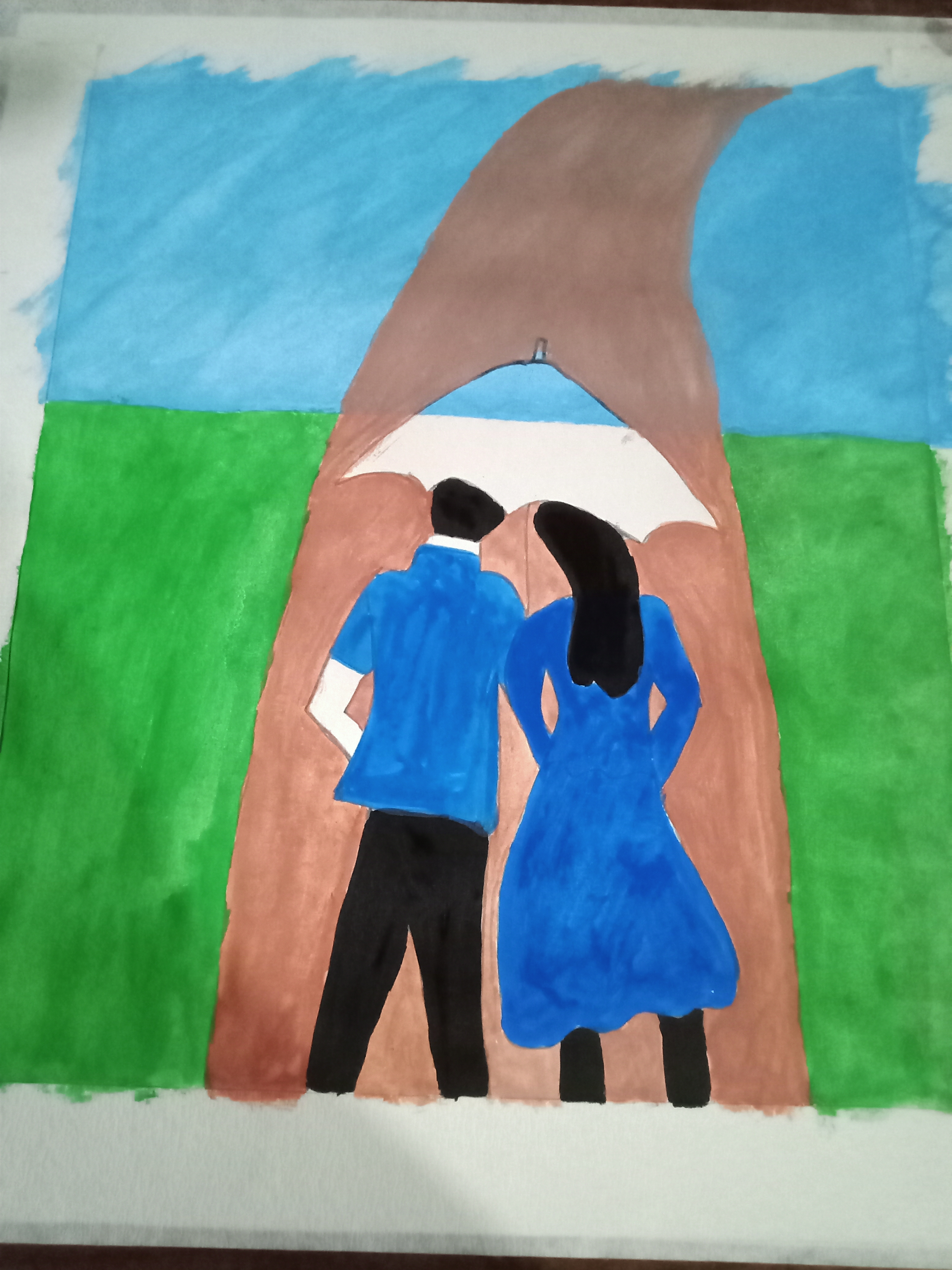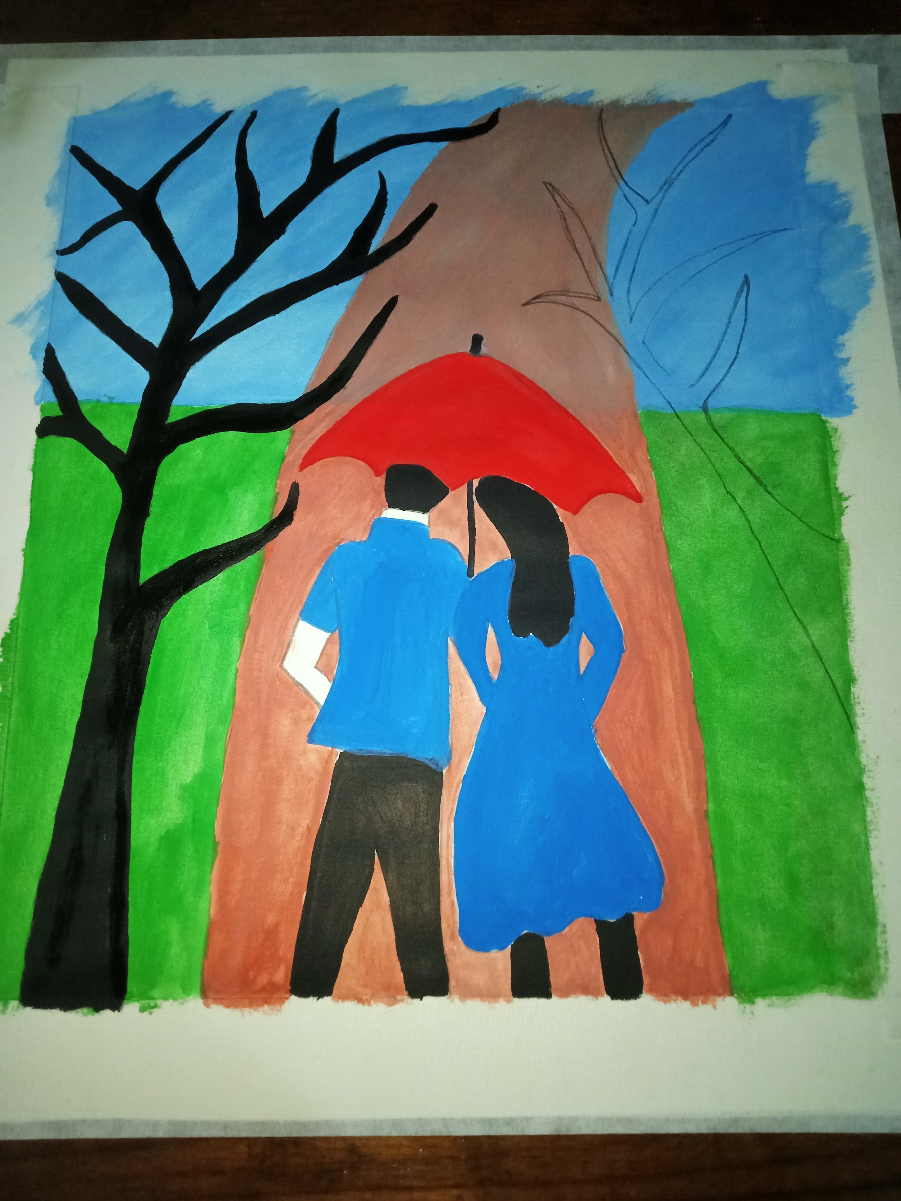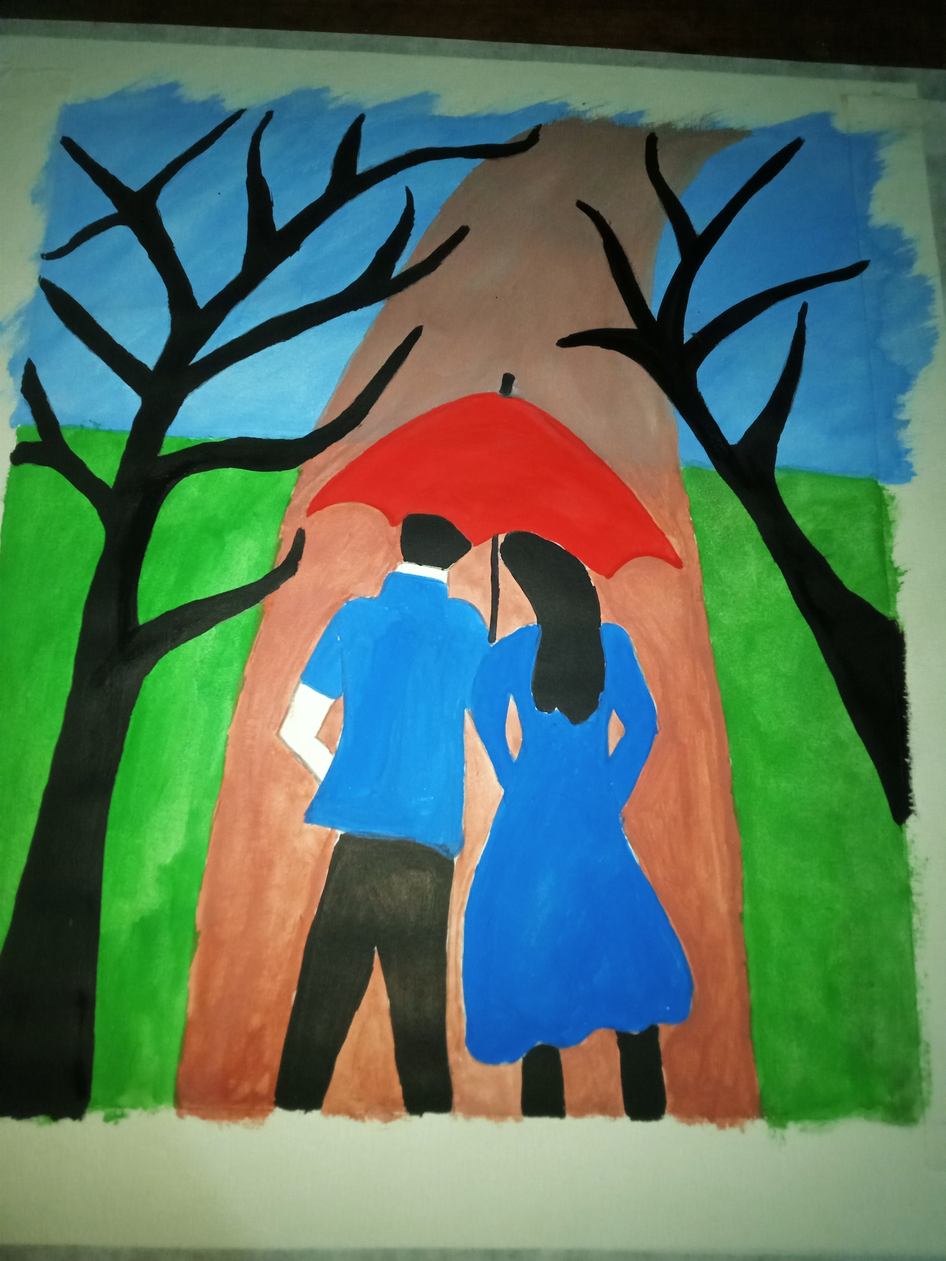 বৃষ্টি ভেজা দিনে ছাতা মাথায় দিয়ে দুজন হেটে যাচ্ছে। খুব সুন্দর হয়েছে পেইন্টিংটি। একটা রোমান্টিক ভাব আছে। চমৎকার কালার কম্বিনেশন এর মাধ্যমে সুন্দর একটি পেইন্টিং করে আমাদের সাথে শেয়ার করার জন্য ধন্যবাদ।
