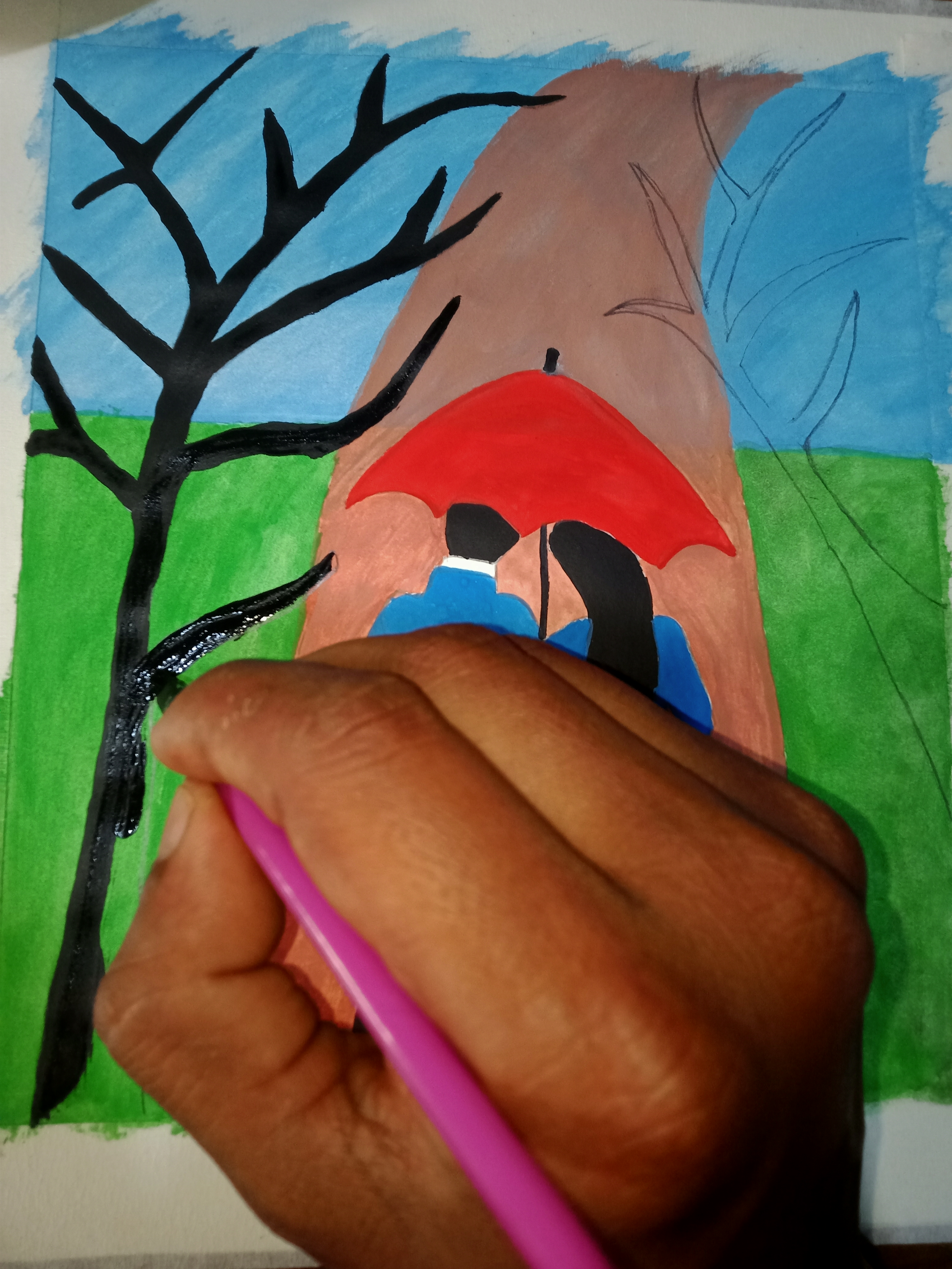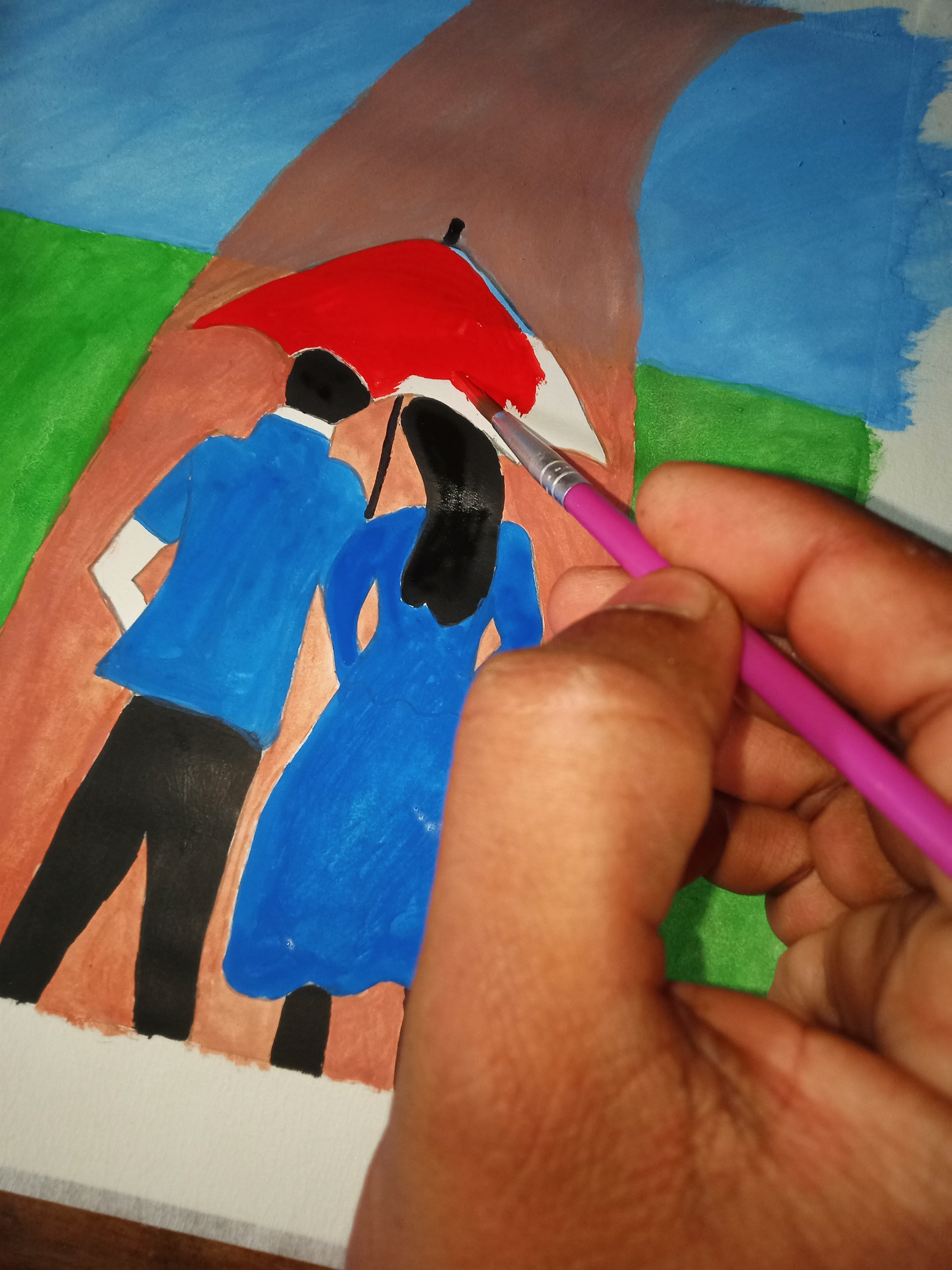 এবার মাথার উপরের ছাতাটি দেখতে যেন সুন্দর হয় ও চিত্রটি দেখতে যেন আরও বেশি আকর্ষণীয় হয় এজন্য লাল রং দিয়ে ছাতার চিত্র অঙ্কন করেছি। রঙিন ছাতা দেখতে অনেক সুন্দর লাগছে। এর ফলে আমার এই পেইন্টিং আরও বেশি আকর্ষণীয় হয়েছে।