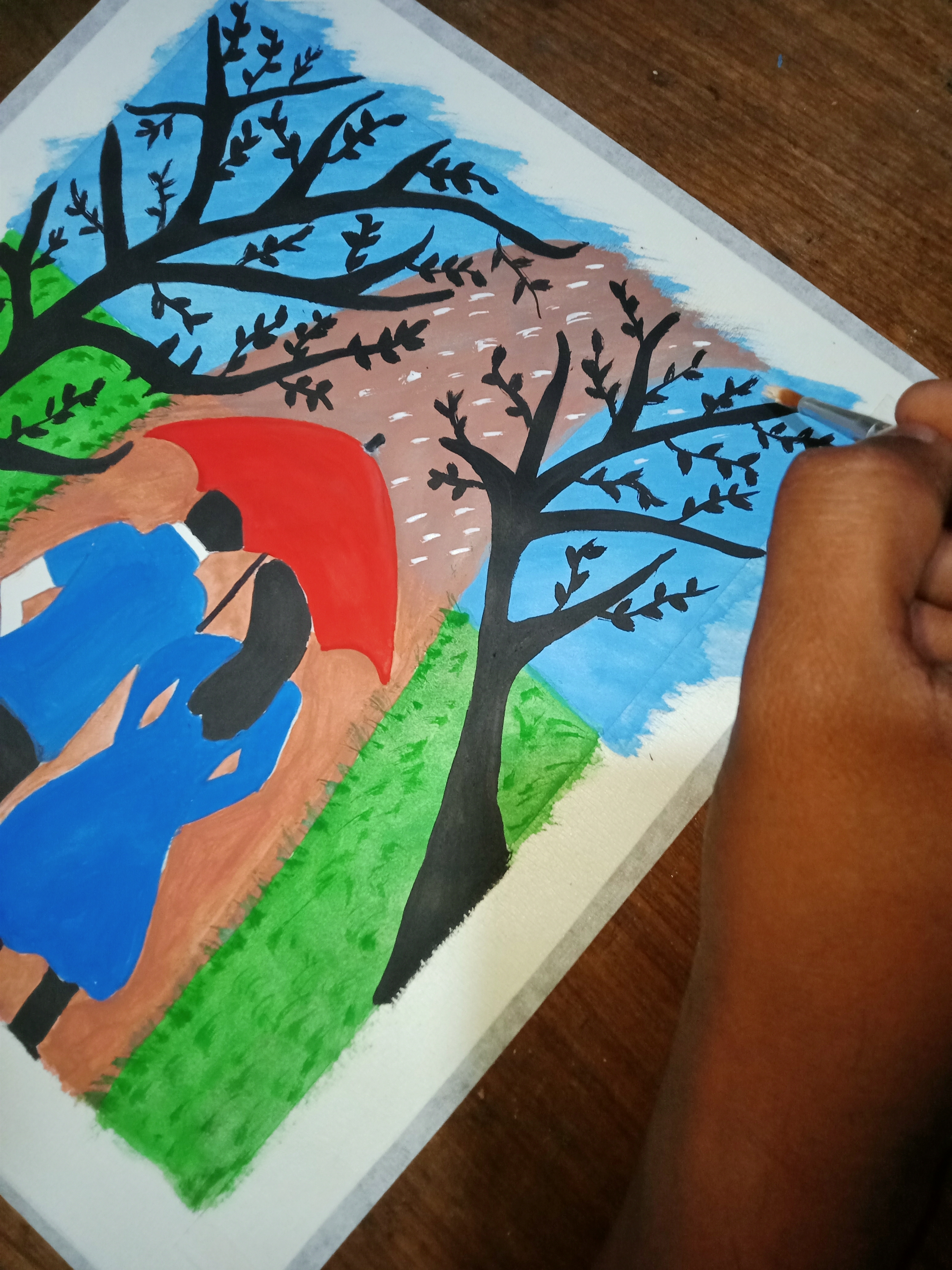 এবার বৃষ্টি ভেজা দিনের পেইন্টিং করার জন্য সাদা রং দিয়ে ছোট ছোট বৃষ্টির ফোঁটা অঙ্কন করেছি। বৃষ্টি অঙ্কন করতে আমার ভালো লেগেছে।