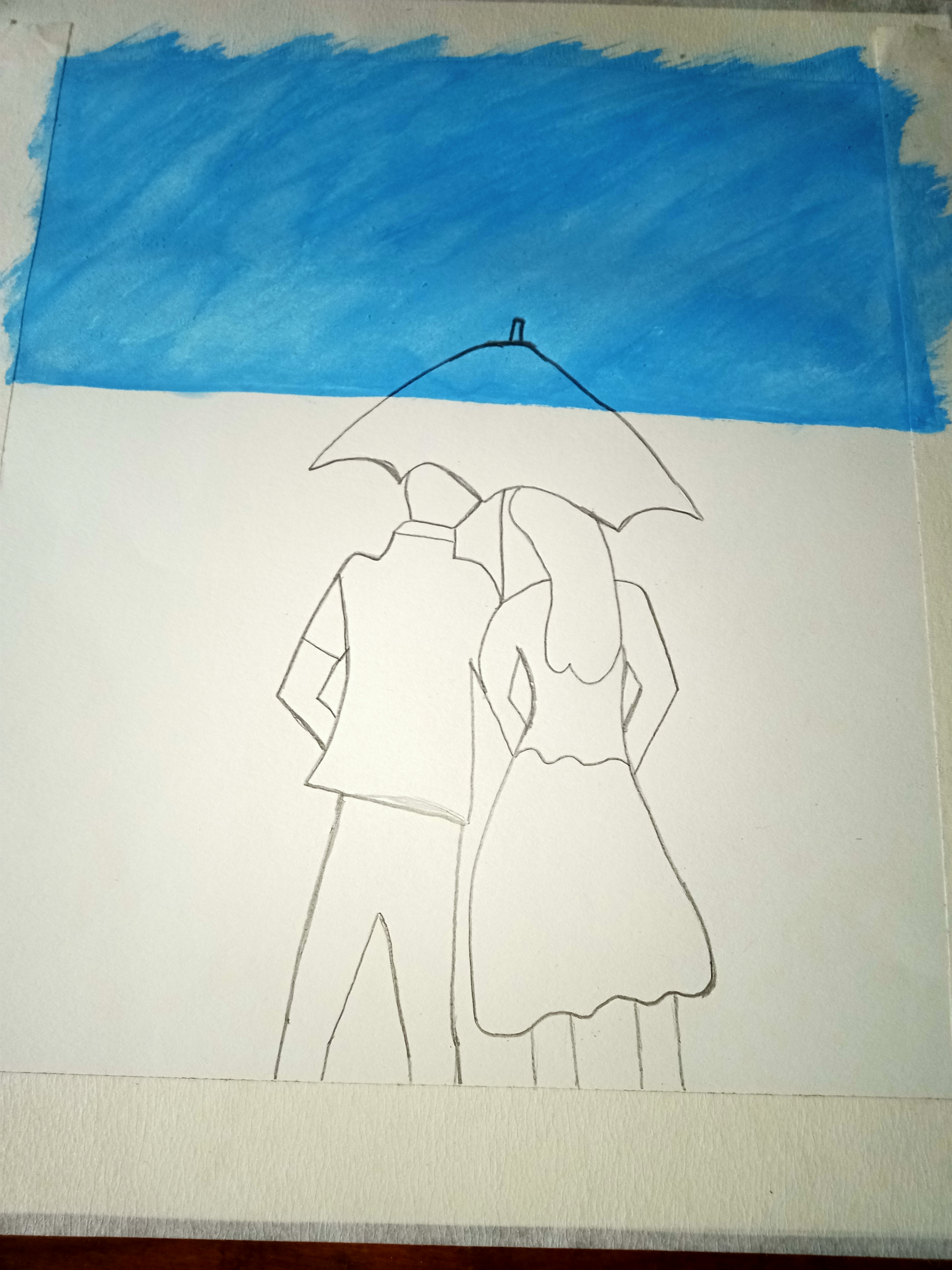 এবার আমি একটি ছেলে ও একটি মেয়ে হেঁটে যাচ্ছে ছাতা মাথায় দিয়ে এরকম একটি চিত্র অঙ্কন করার জন্য প্রথমে পেন্সিল দিয়ে অঙ্কন করেছি।