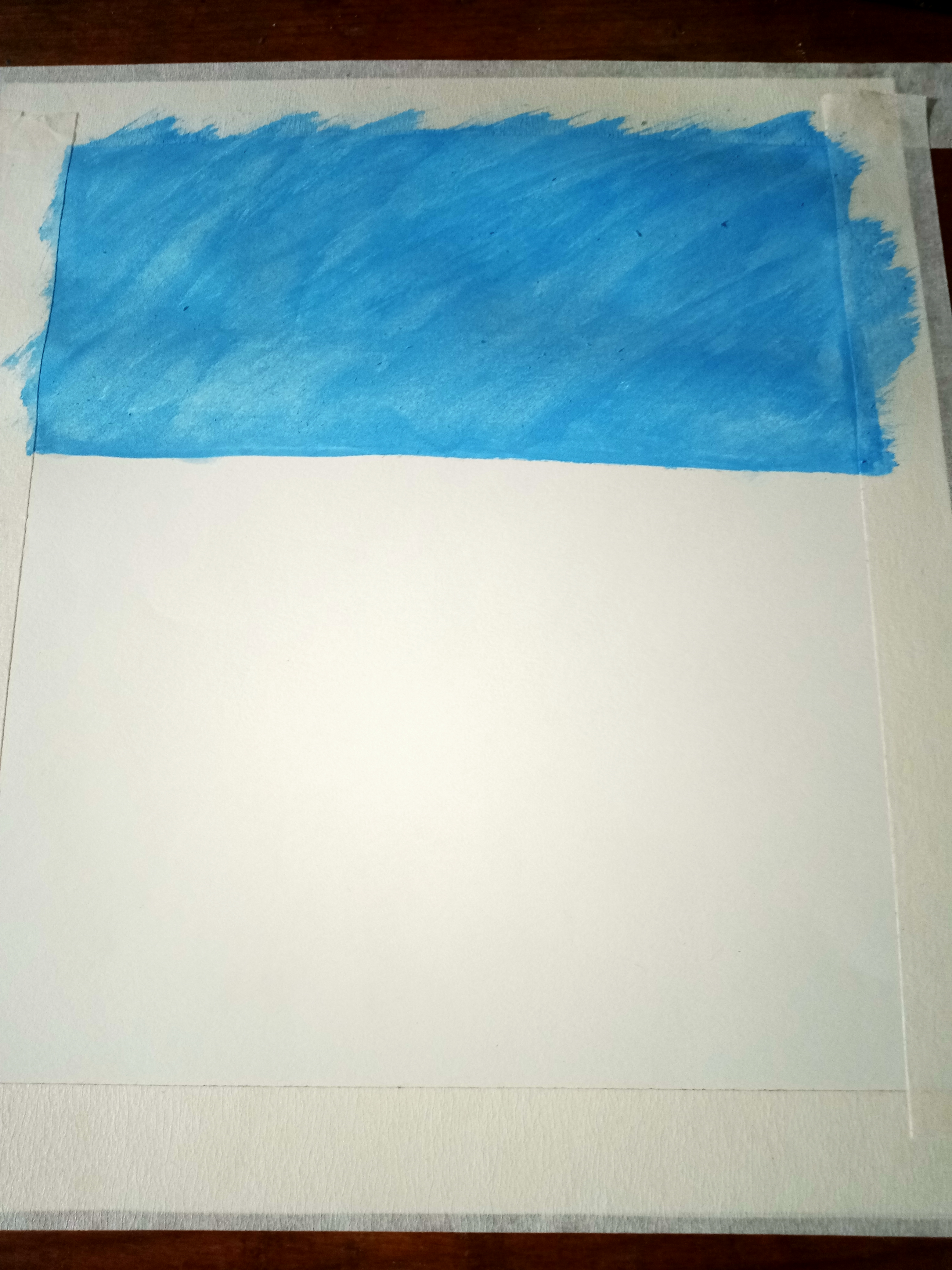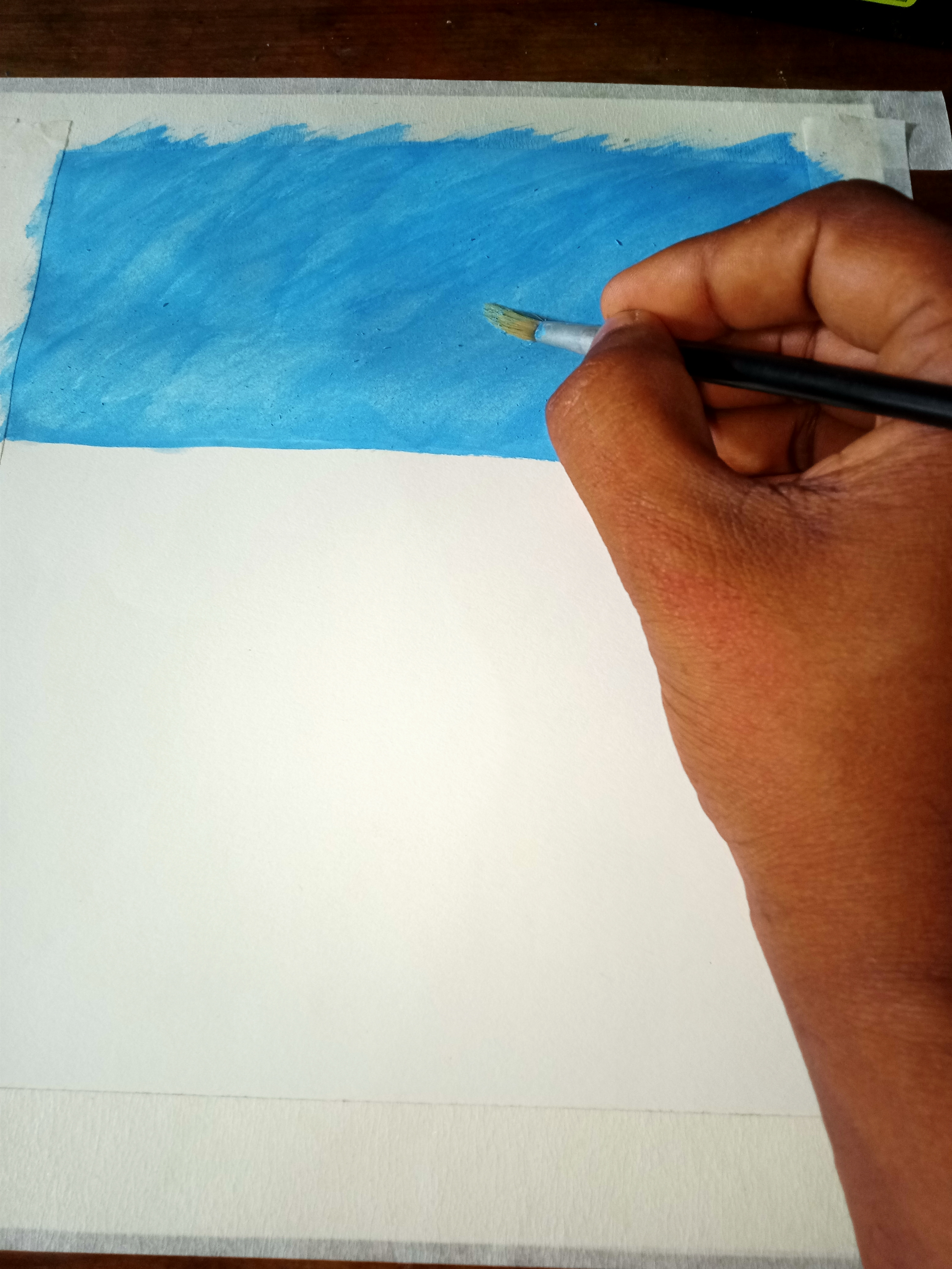 বৃষ্টি ভেজা দিনের পেইন্টিং করার জন্য প্রথমে কার্টিজ পেপারের চারপাশে মাসকিং টেপ লাগিয়েছি। এরপর আকাশের পেইন্টিং করেছি। আকাশের পেইন্টিং করার জন্য আমি হালকা আকাশী কালার রং ব্যবহার করেছি।
