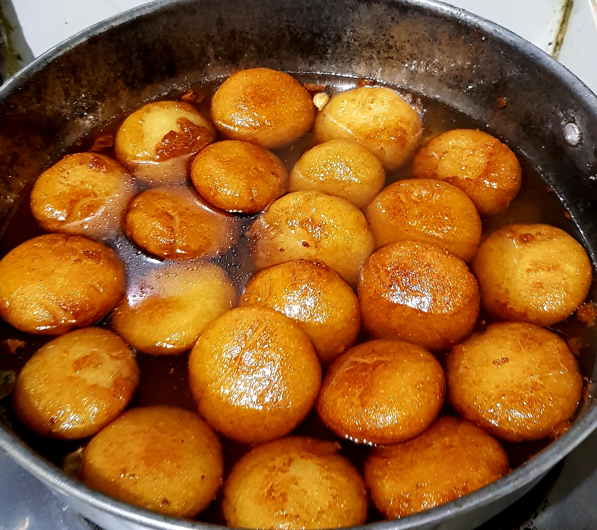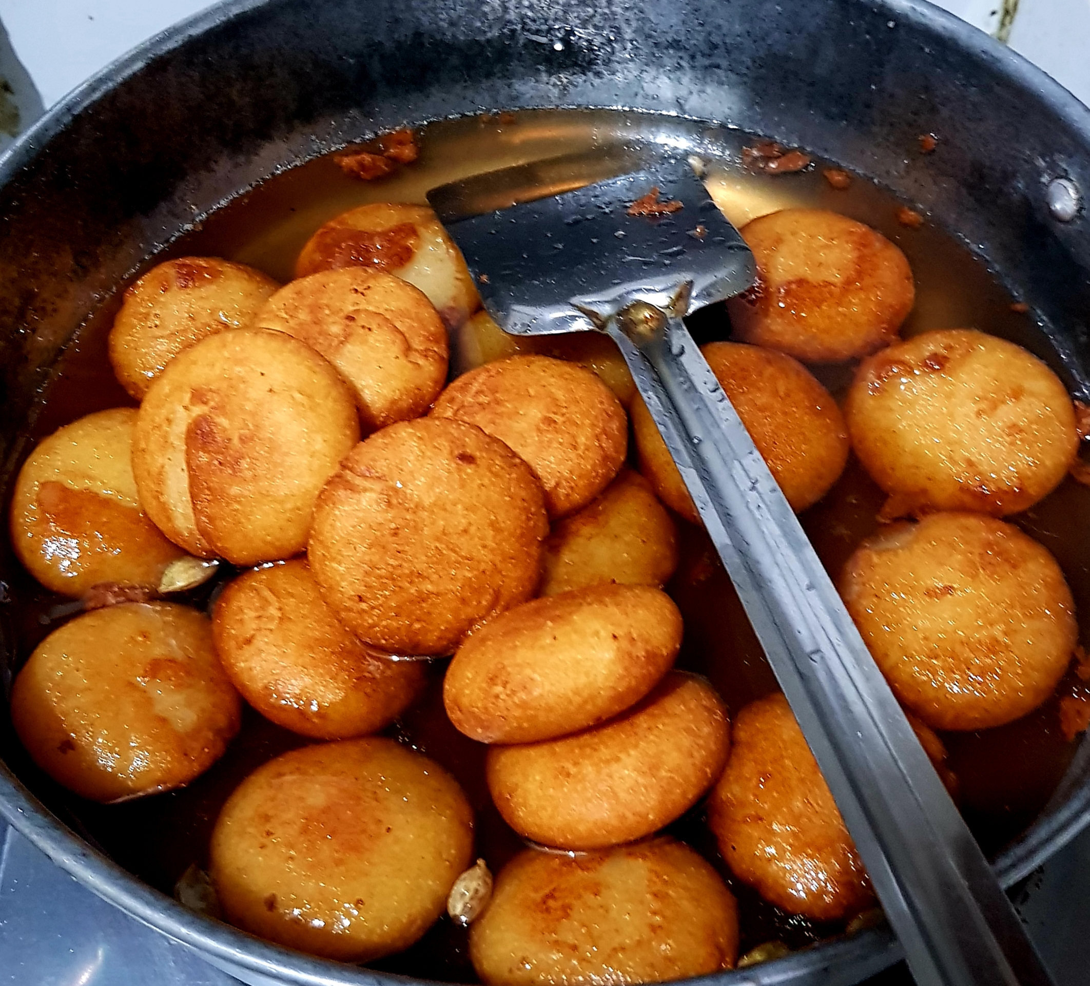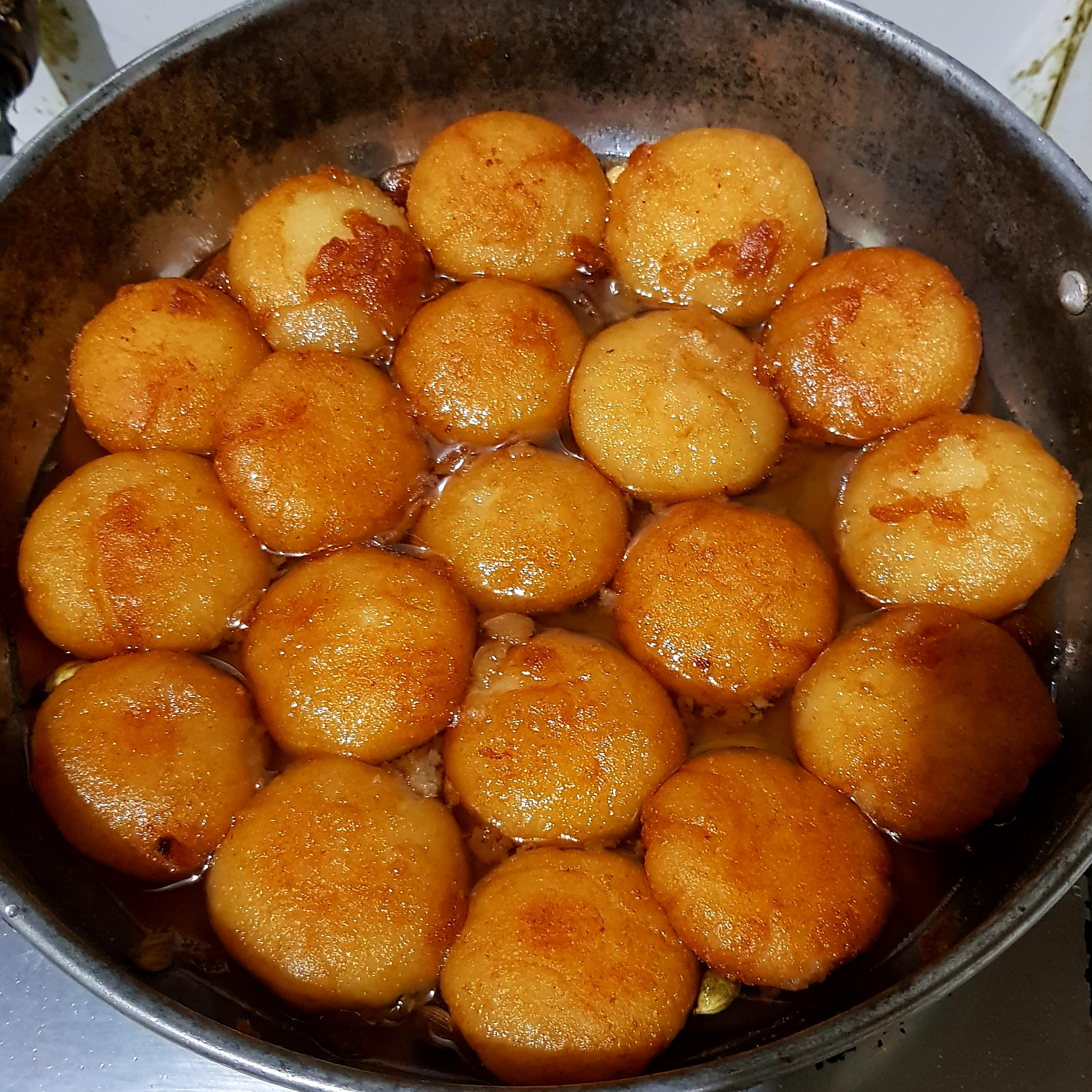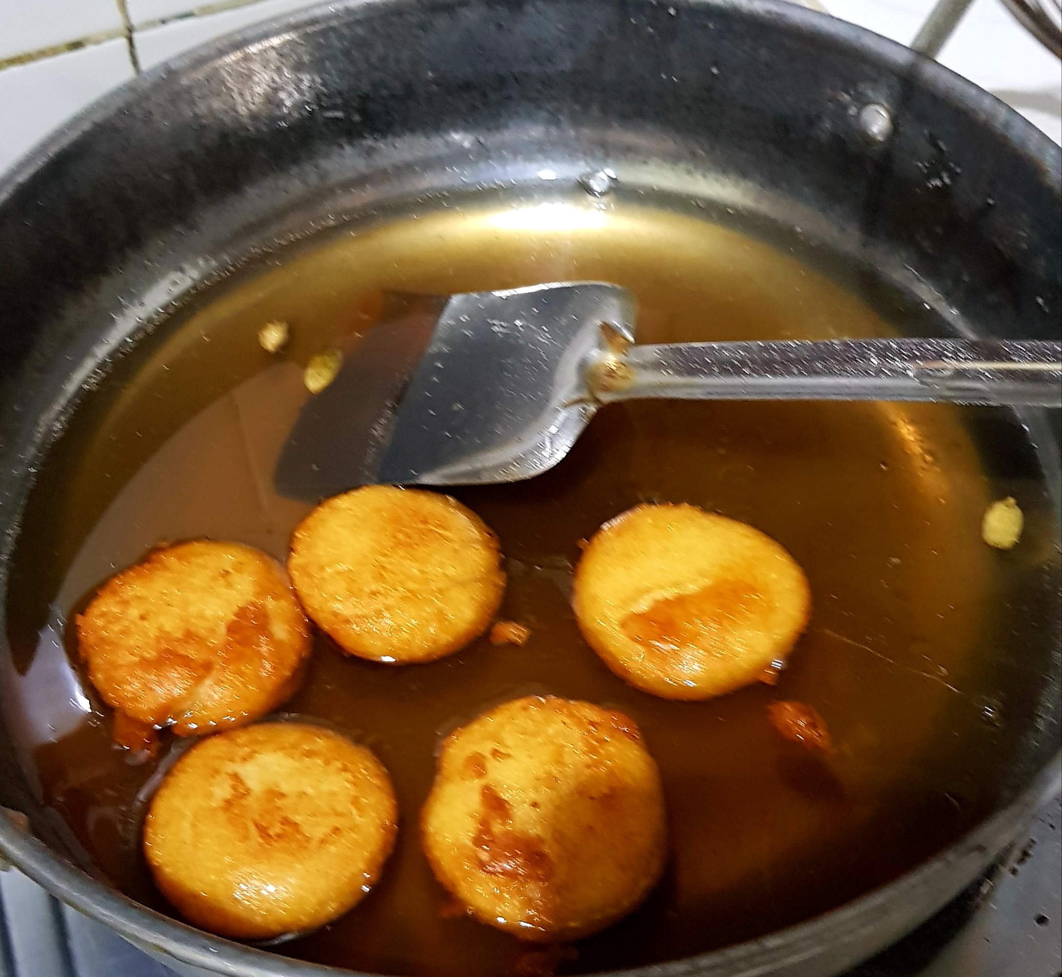 এভাবে একে একে সবগুলো ভাজা হয়ে গেলে সবগুলো নিয়ে চিনির শিরার ভিতর দিয়ে দিয়েছি। এপাশ-ওপাশ করে সবগুলো চিনির সিরার ভিতরে ডুবিয়ে রেখেছি। তারপর একটা ঢাকনা দিয়ে ২ ঘন্টার জন্য রেখে দিয়েছি। |