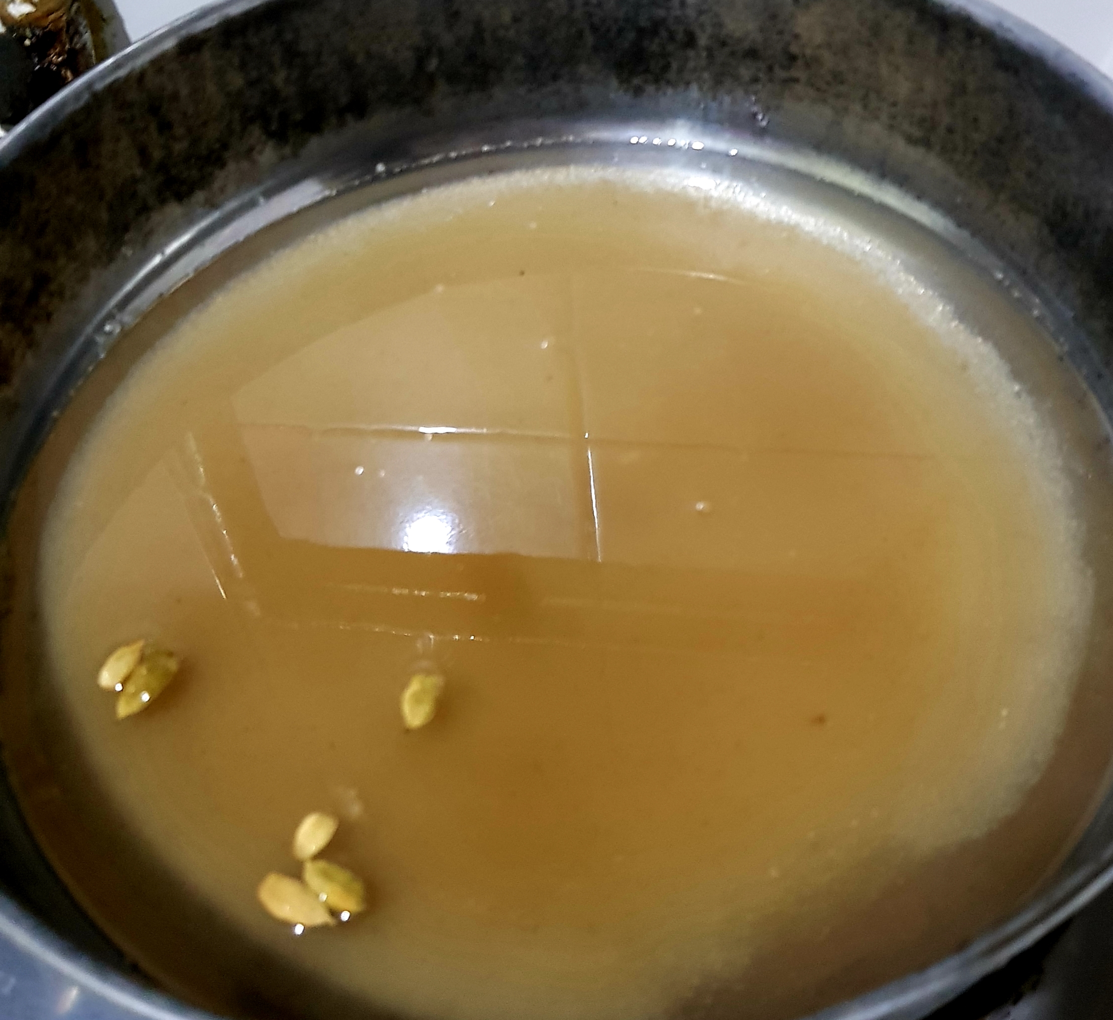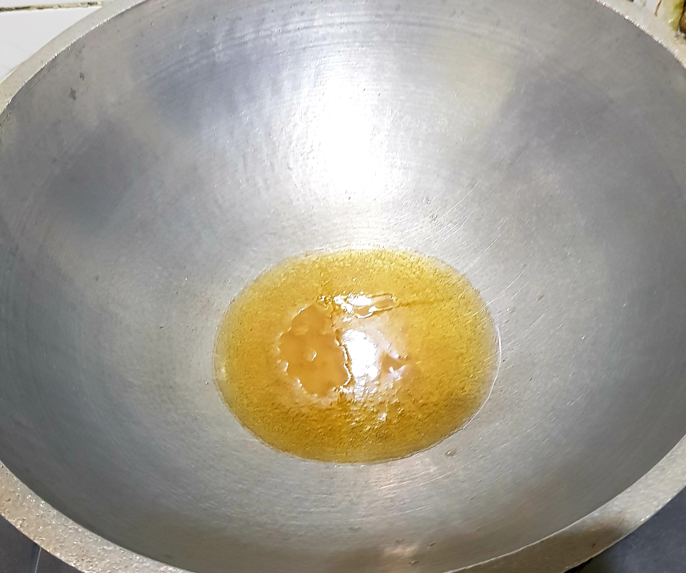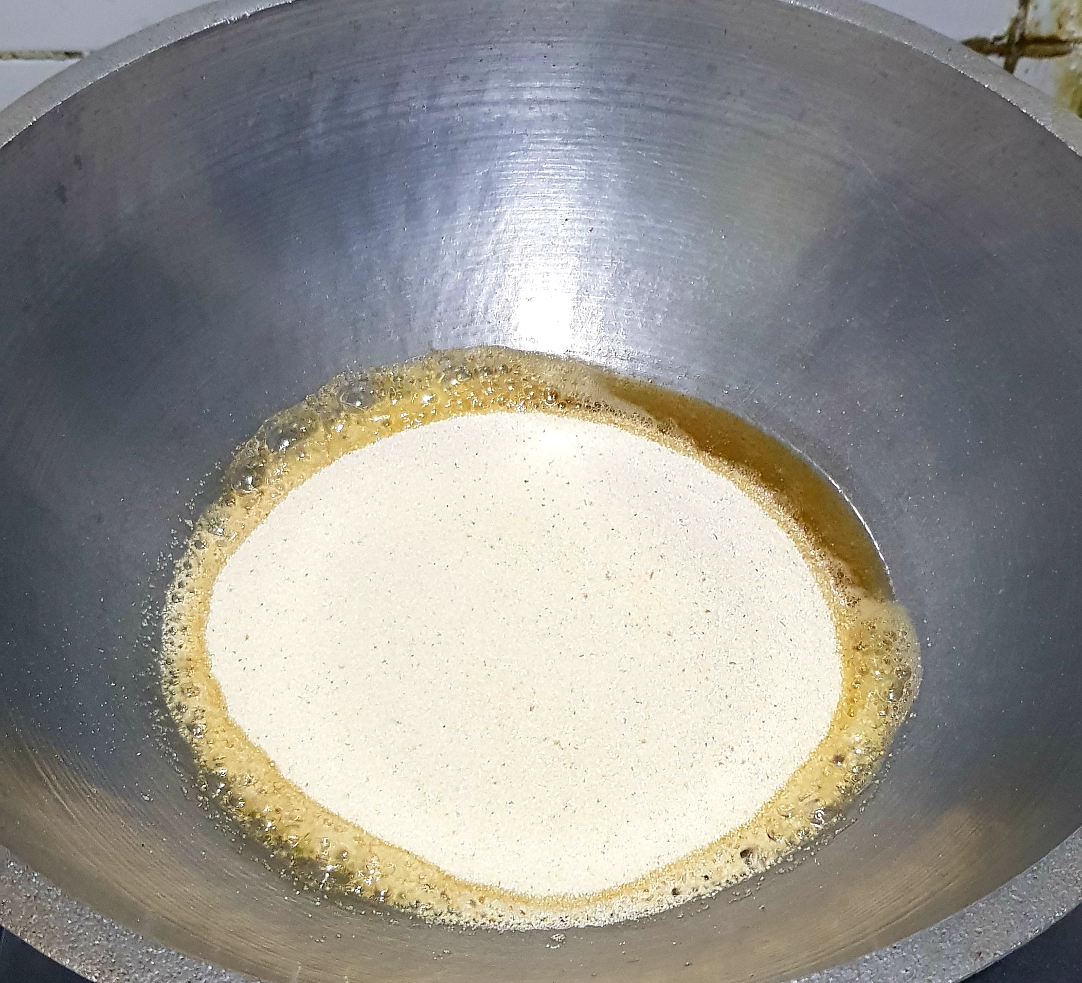 প্রথমে চুলায় একটি কড়াই বসিয়ে তার ভিতর ২ কাপ চিনি ২ কাপ পানি দিয়ে দিয়েছি ।তারপর দুই-তিন মিনিট বলক আসার পরে চুলা বন্ধ করে রেখে দিয়েছি। তারপর অন্য একটি চুলায় কড়াই বসিয়ে তার ভিতরে ৩ টেবিল চামচ পরিমাণ ঘি দিয়ে দিয়েছি। |