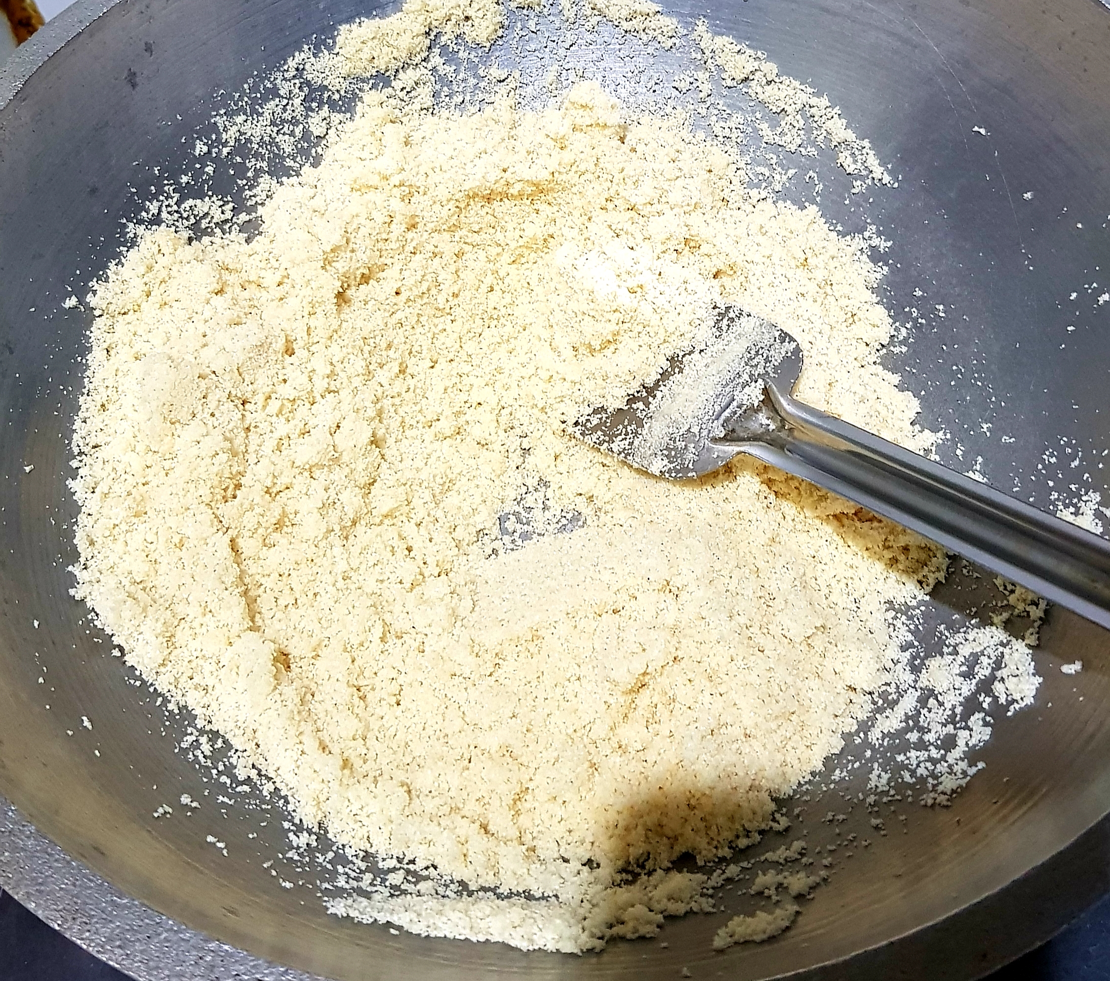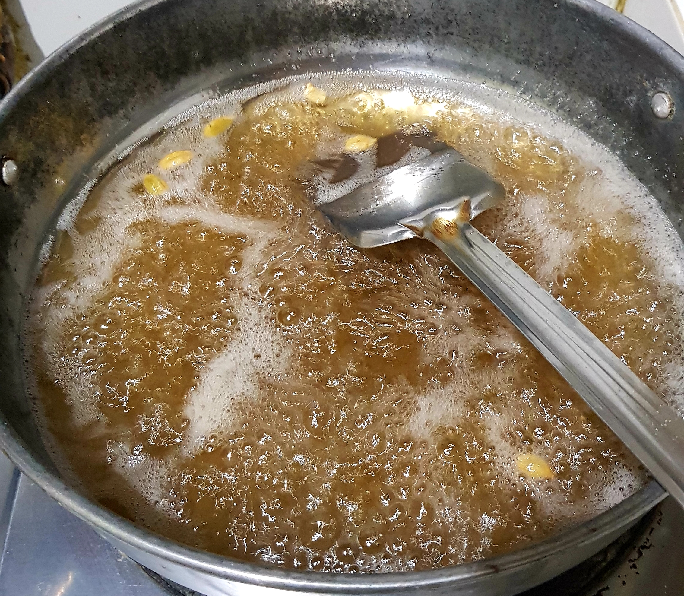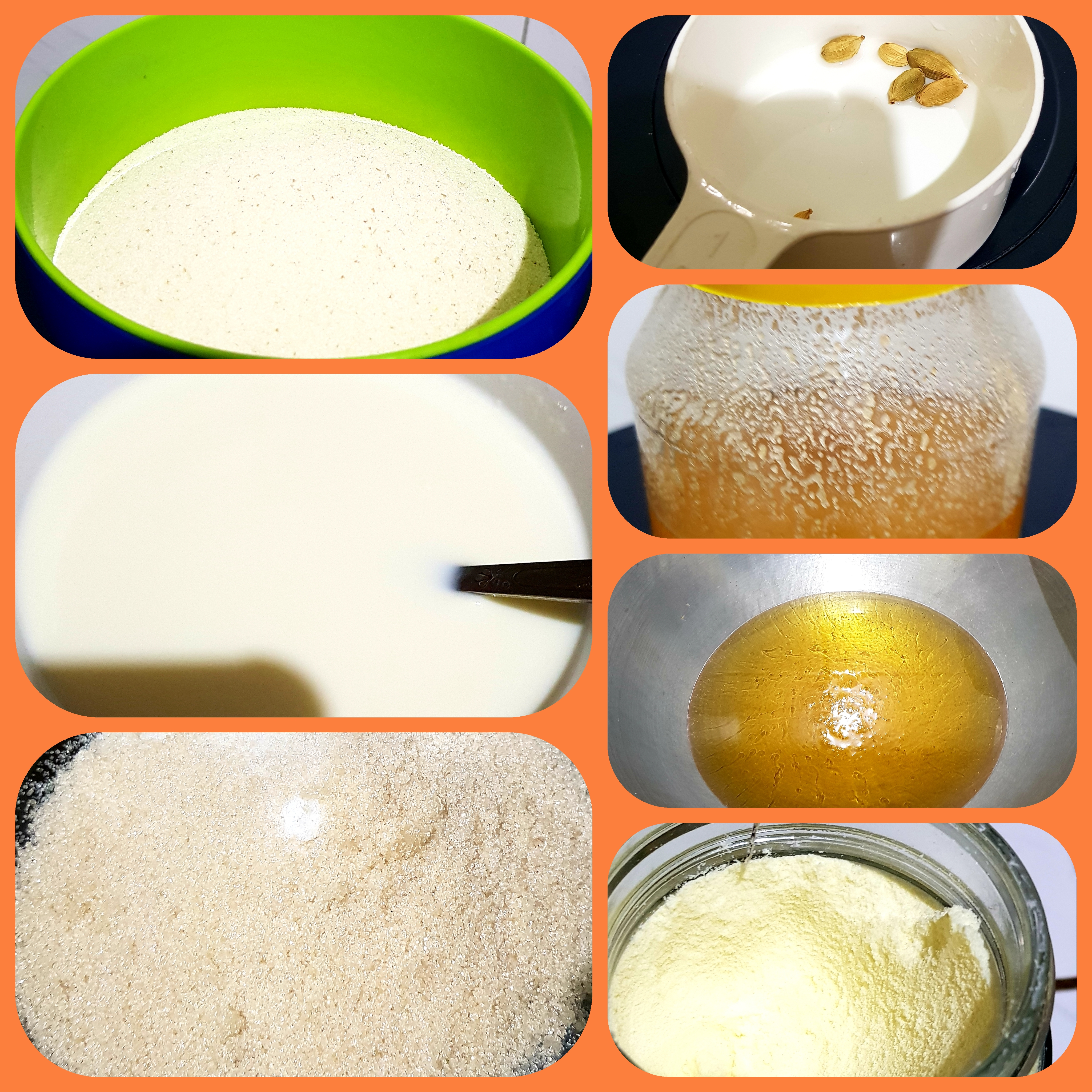 প্রথমে চুলায় একটি কড়াই বসিয়ে তার ভিতর ২ কাপ চিনি ২ কাপ পানি দিয়ে দিয়েছি ।তারপর দুই-তিন মিনিট বলক আসার পরে চুলা বন্ধ করে রেখে দিয়েছি। তারপর অন্য একটি চুলায় কড়াই বসিয়ে তার ভিতরে ৩ টেবিল চামচ পরিমাণ ঘি দিয়ে দিয়েছি। |