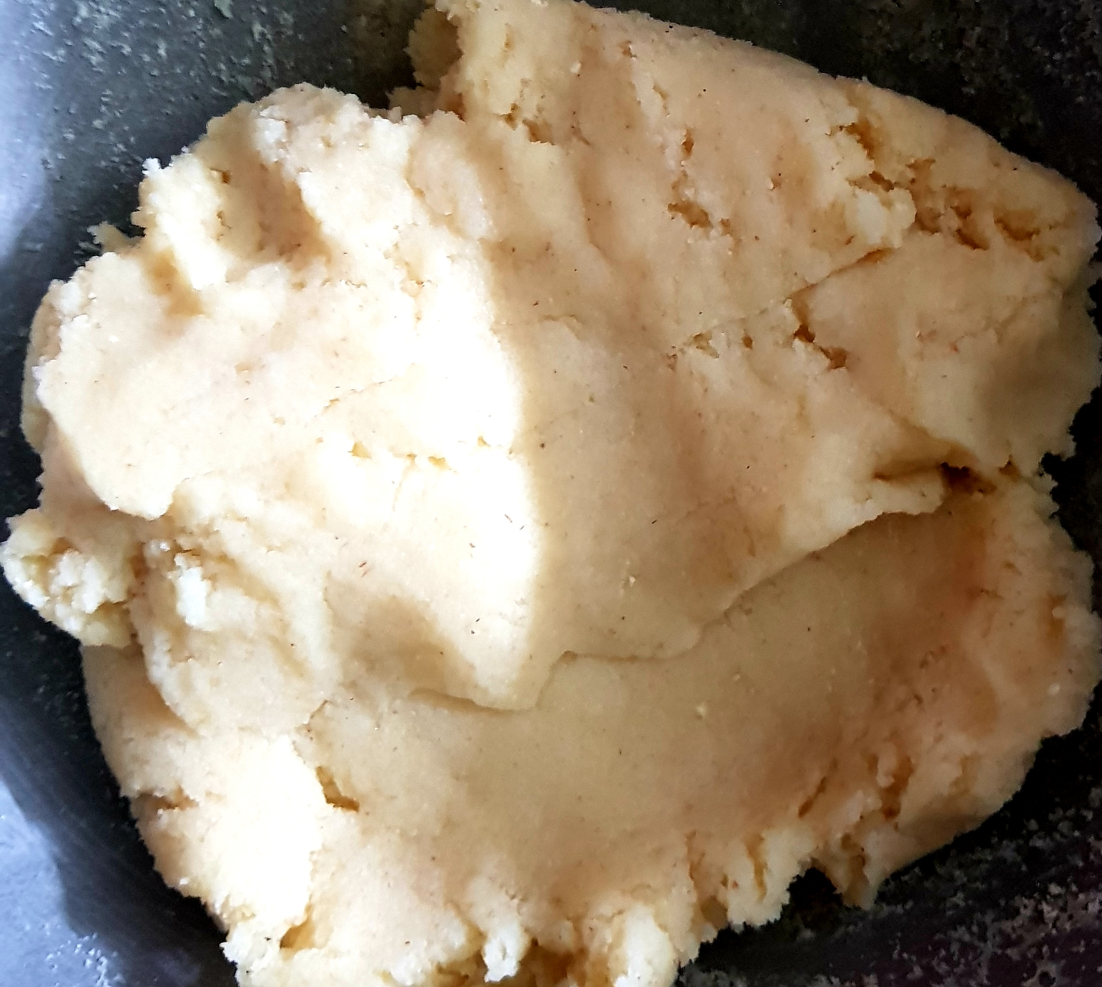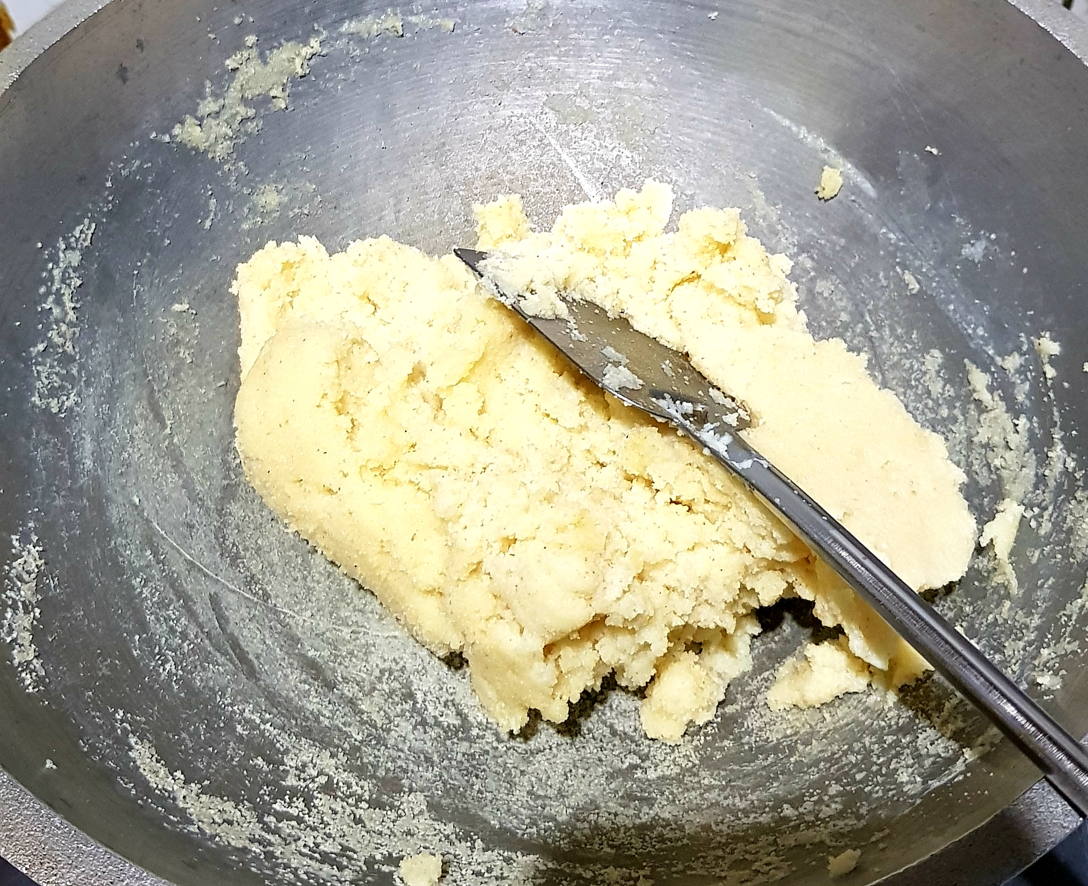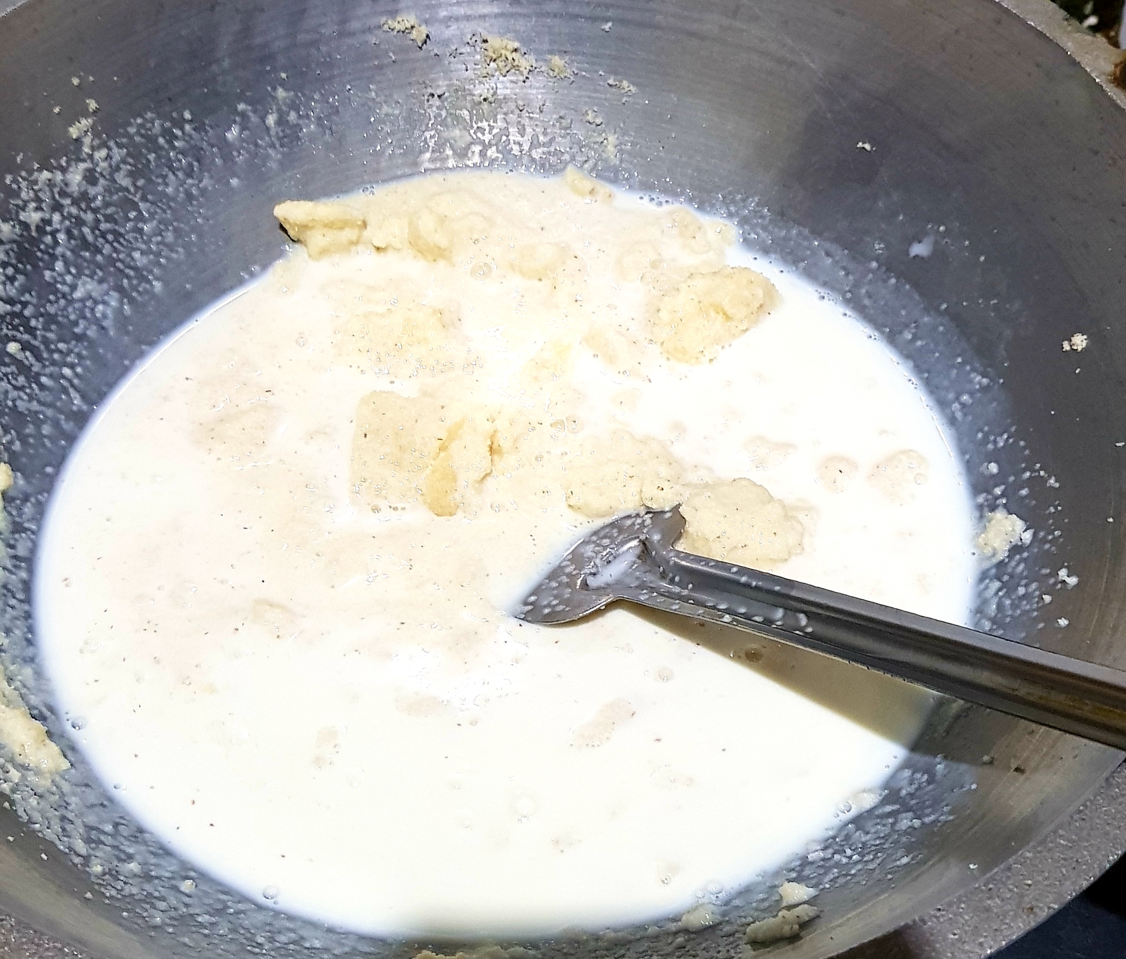 তারপর ঘি একটু গরম হওয়ার পরে ঘির ভিতর দুই কাপ পরিমাণ সুজি দিয়ে দিয়েছি। সুজিটা কিছু সময় ঘিয়ের সাথে নেড়েচেড়ে একটু ভেজে নিয়েছি। তারপর সুজি ভাজা হয়ে গেলে তার ভিতরে দুই কাপ পরিমাণ দুধ দিয়ে দিয়েছি। দুধ দিয়ে কিছু সময় পর দেখব যে আমার সুজিতা একটি ডো এর মত হয়ে গিয়েছে তখন আমি চুলা থেকে নামিয়ে নিব। |