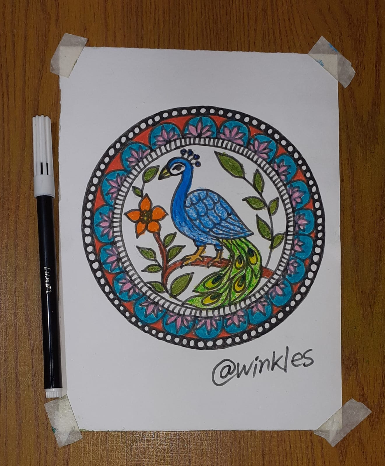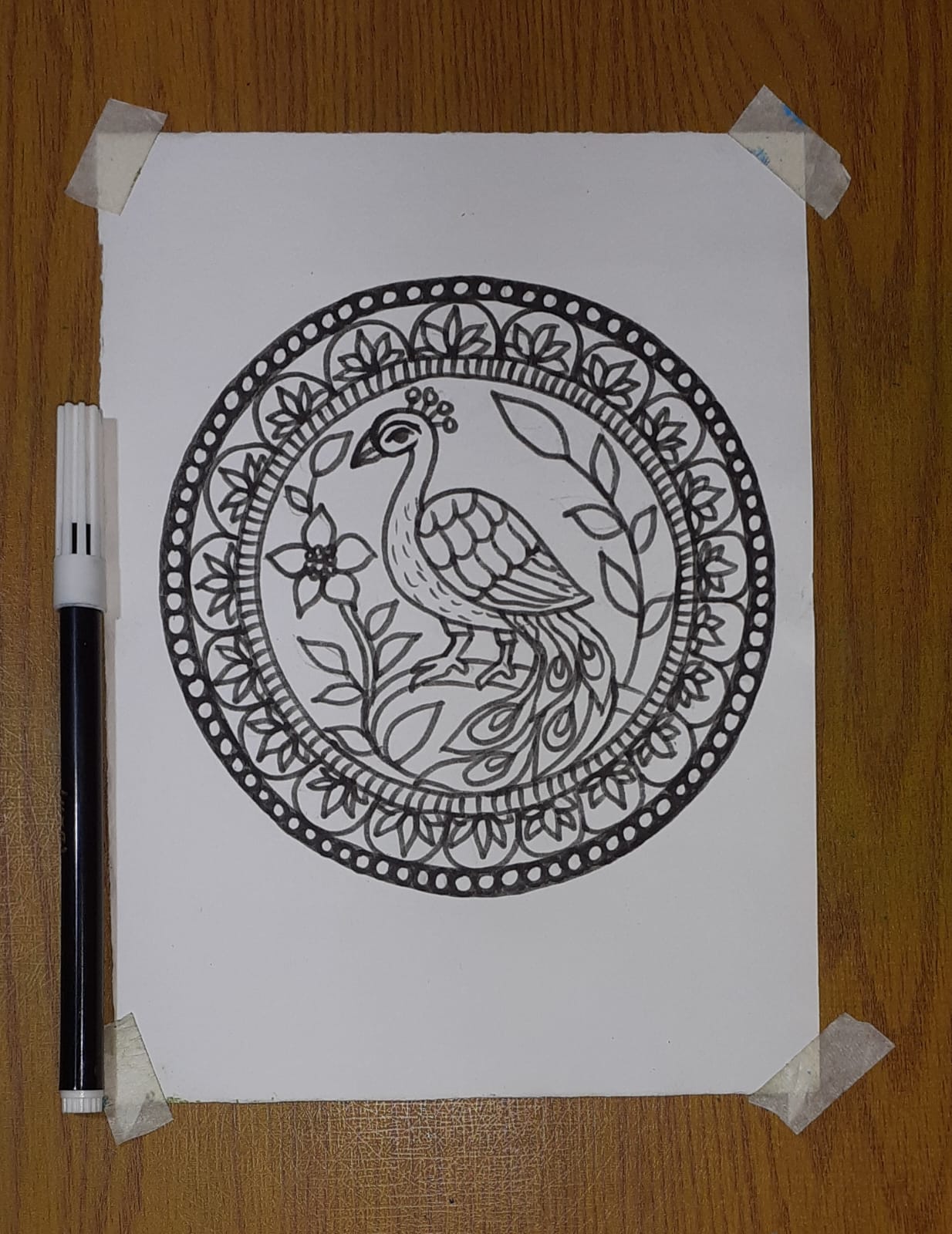 ▶️তৃতীয় ধাপে- কালার পেন এর কালী দিয়ে পুরো ডিজাইন এবং ময়ূর এর আর্টে গাঢ় করে দিয়েছিলাম।