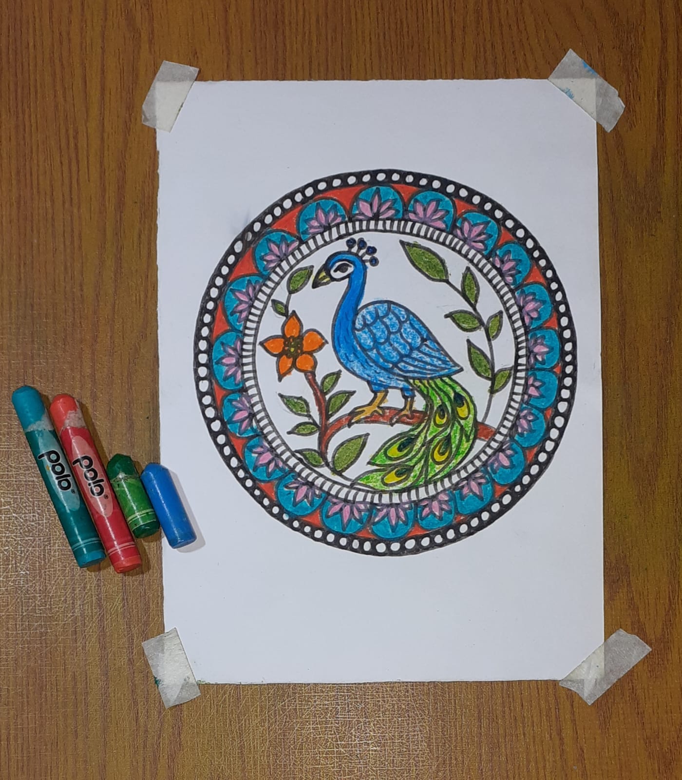 ▶️চতুর্থ ধাপে- মোম রং দিয়ে সম্পূর্ণ ডিজাইন এবং আর্টে কালার করে দিয়েছিলাম। এরপর অঙ্কন এখানেই সমাপ্ত করেছিলাম।