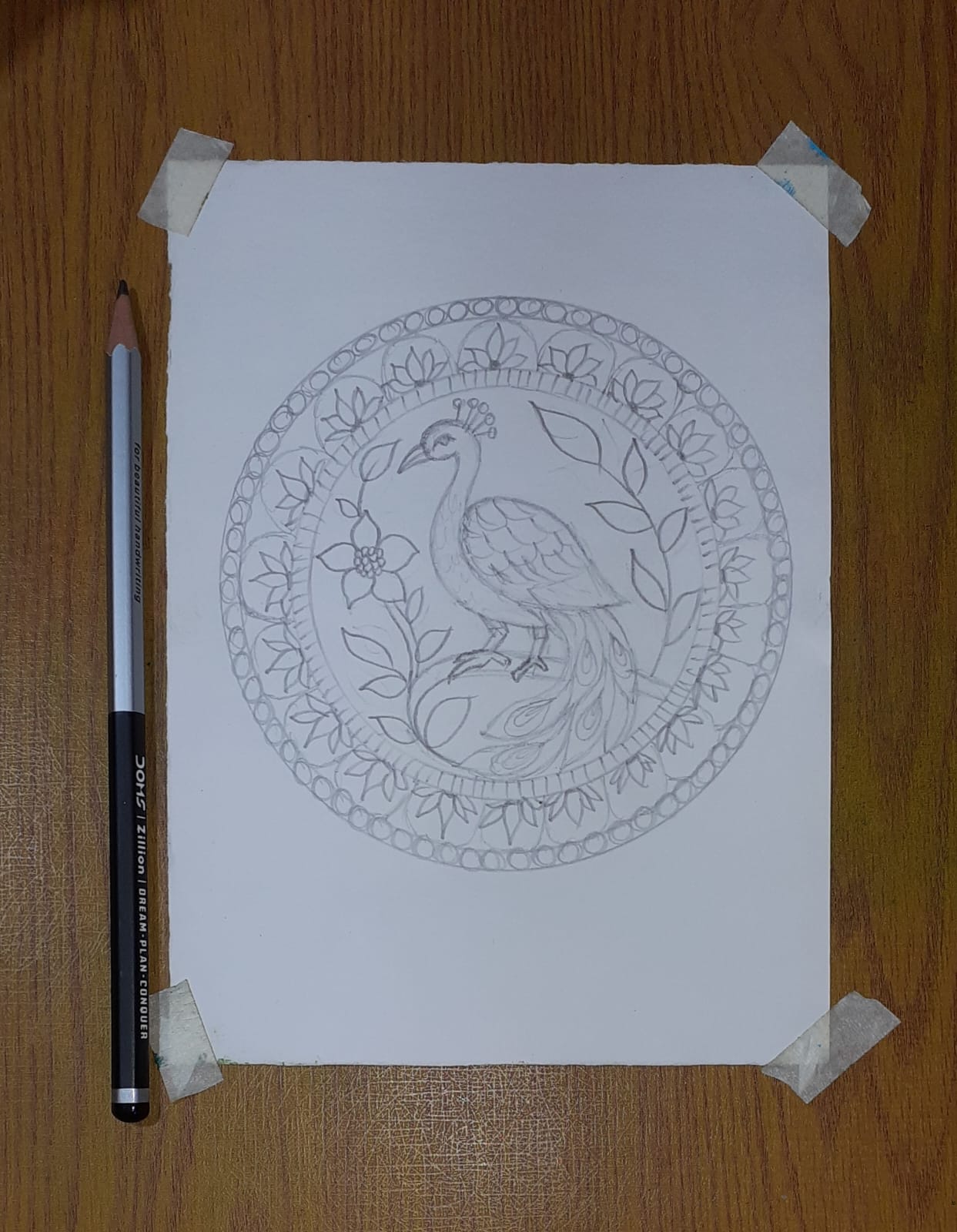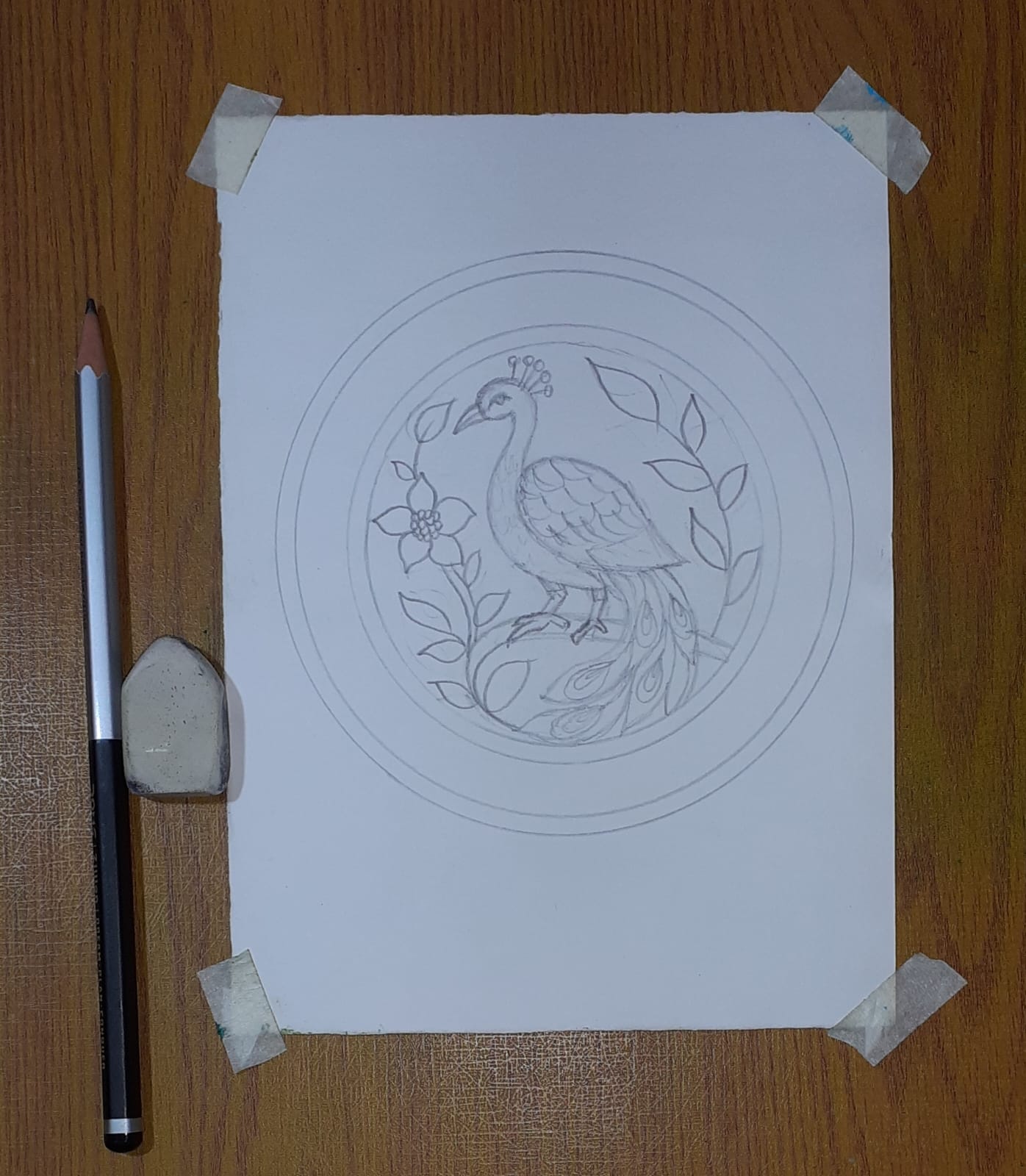 ▶️প্রথম ধাপে- স্কেচ পেন্সিল দিয়ে একটি ময়ূর এর চিত্র পুরোপুরি এঁকে নিয়েছিলাম। এরপর ফুল গাছের ডাল, পাতা, ফুল এঁকে নিয়েছিলাম। এরপর তার পাশে কয়েকটা বৃত্তের সার্কেল তৈরী করে নিয়েছিলাম।