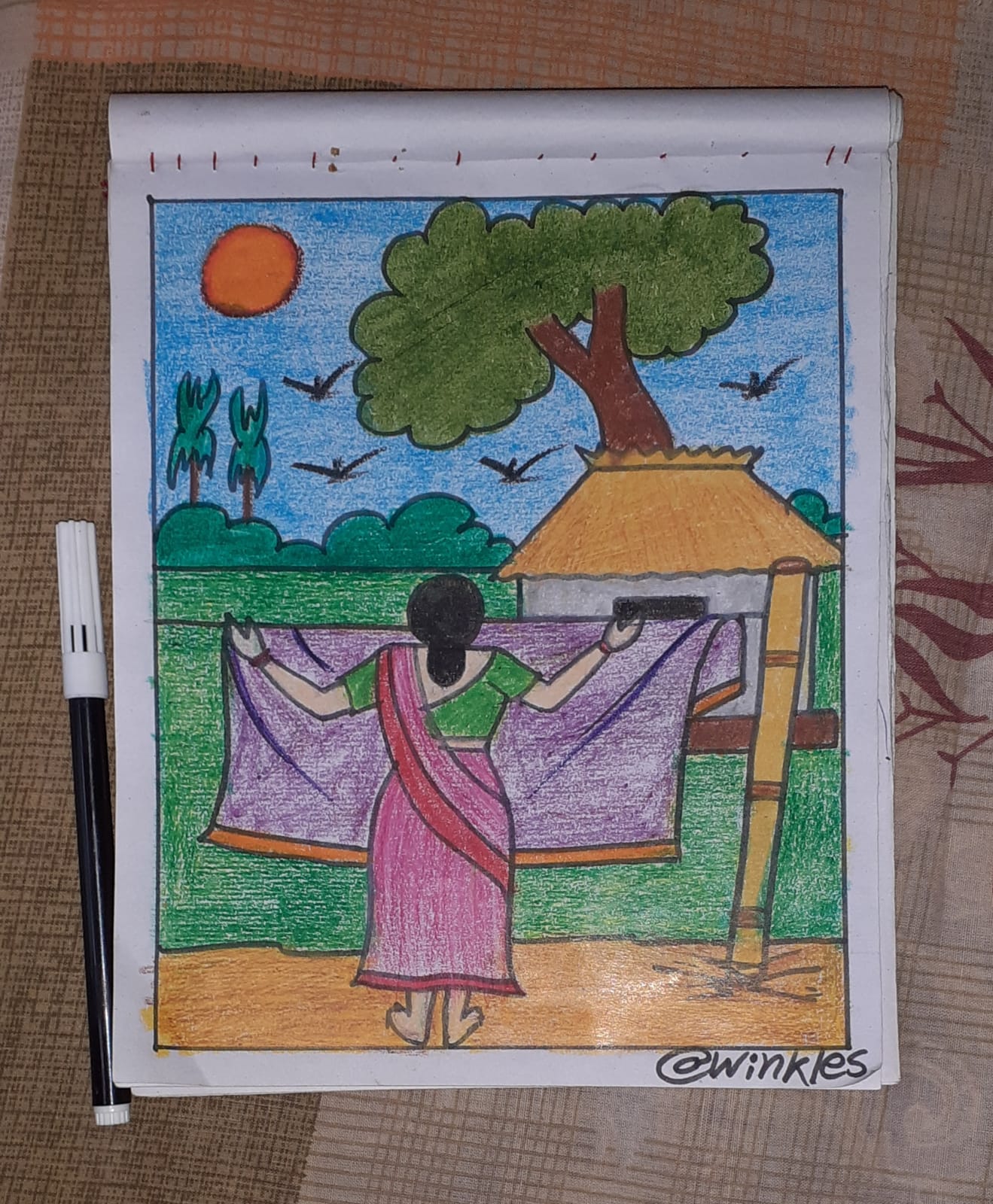 বাড়ির মহিলারা বা মেয়েরা বিভিন্ন ধরণের কাজ করে থাকে। তার মধ্যে একটা কাজ হলো, কাপড় ধুয়ে রোদ দেওয়া। বিষয়টা এইরকম, খুবই সাধারণ ধাঁচের মাধ্যমে দৃশ্যটা ফুটিয়ে তোলার চেষ্টা করেছিলাম। গ্রামে এইরকম আরো বিভিন্ন ধরণের দৃশ্য দেখা যায়, তবে সেই দৃশ্য আর আঁকার চেষ্টা করেনি। এইসব এর মধ্যেই কাল্পনিক আকারে একটা দৃশ্যপট তুলে ধরেছি। আশা করি আপনাদের কাছে ভালো লাগবে। এখন অঙ্কন এর মূল বিষয়ের দিকে চলে যাব।
