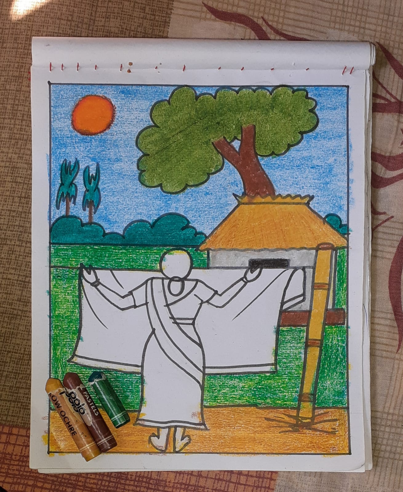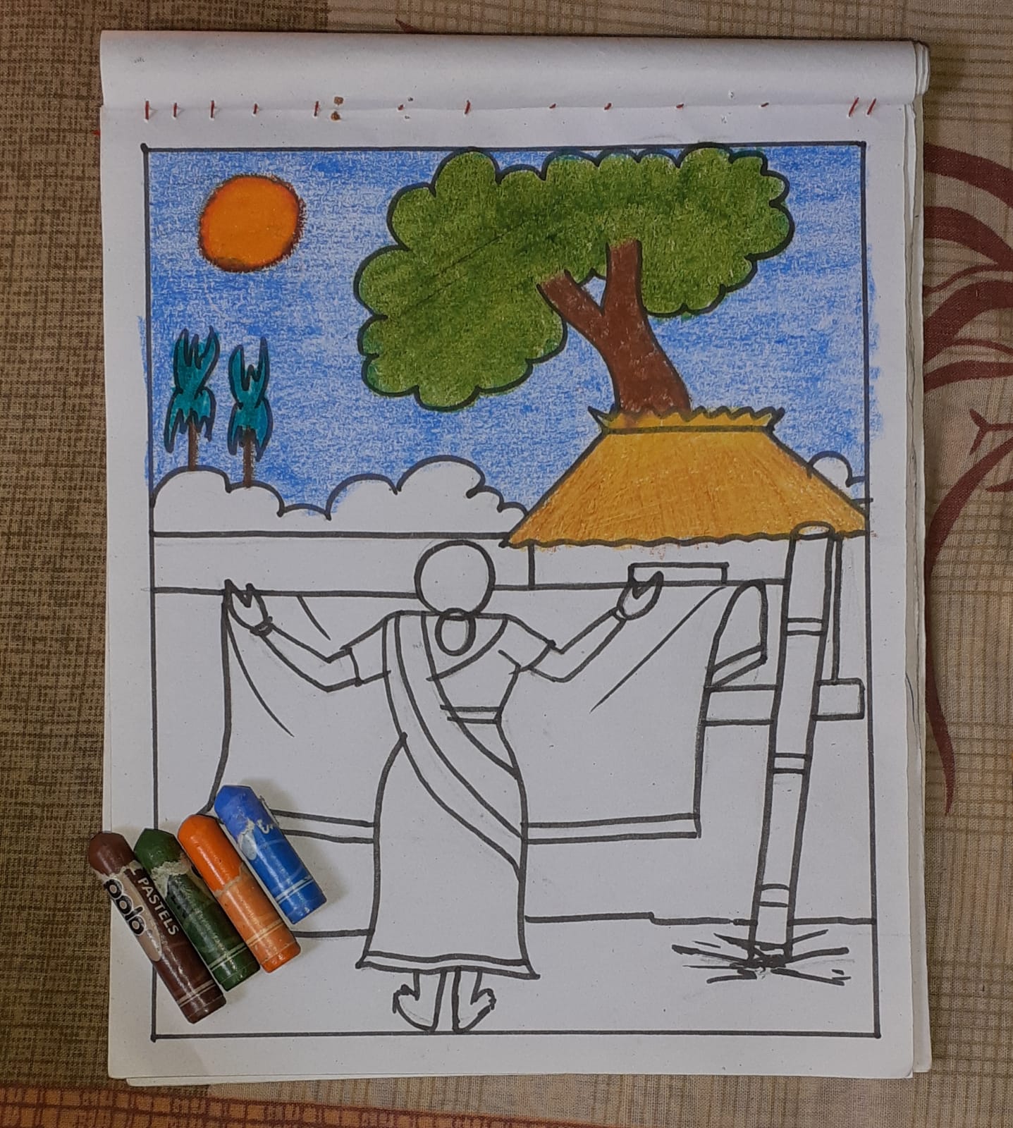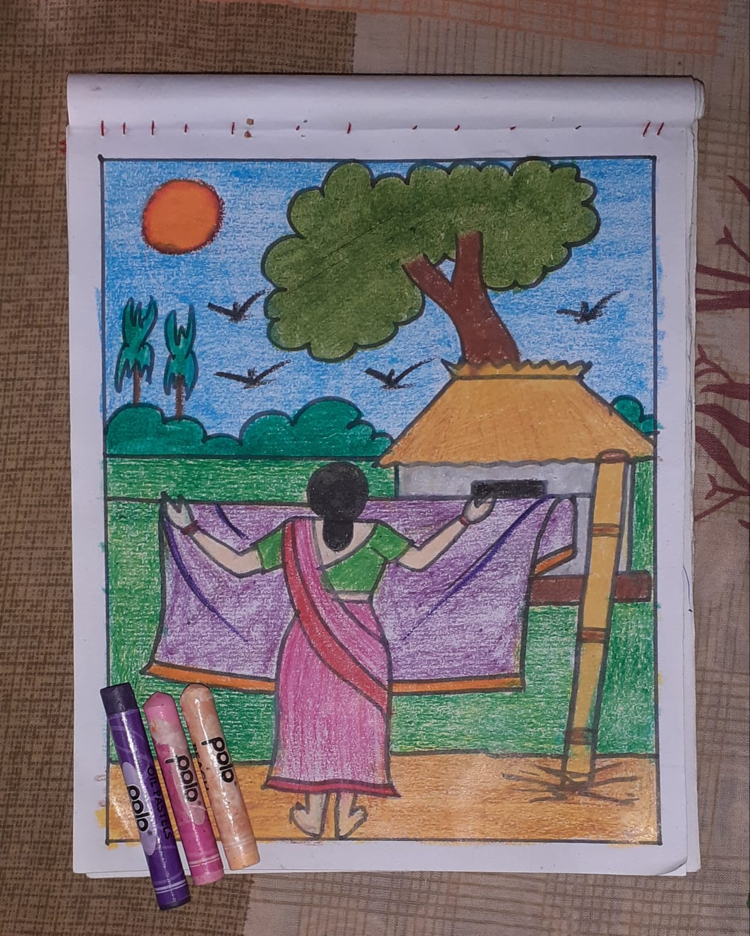 ▶️পঞ্চম ধাপে- মহিলা সহ কাপড় রোদ দেওয়ার দৃশ্যে কালার করে দিয়েছিলাম। আর অঙ্কনটি এখানেই সমাপ্ত করেছিলাম।