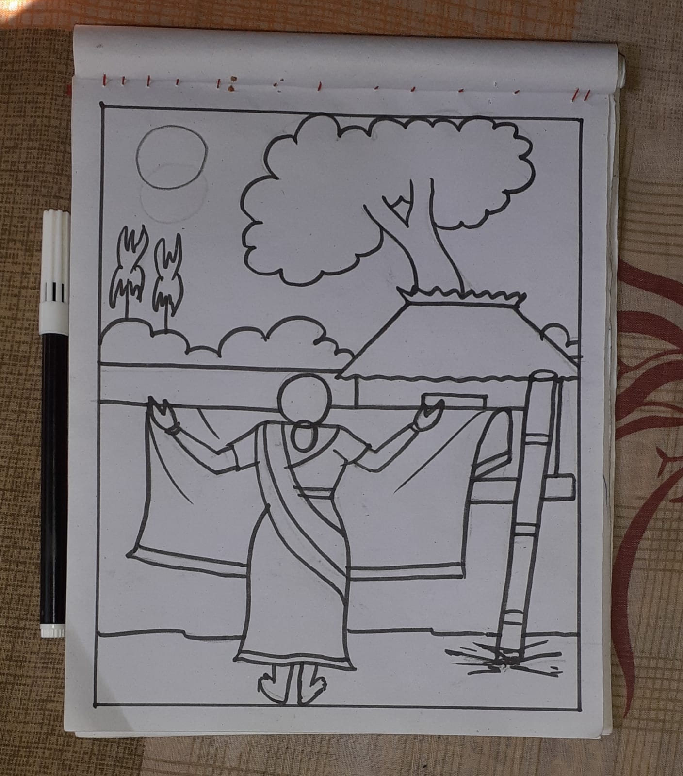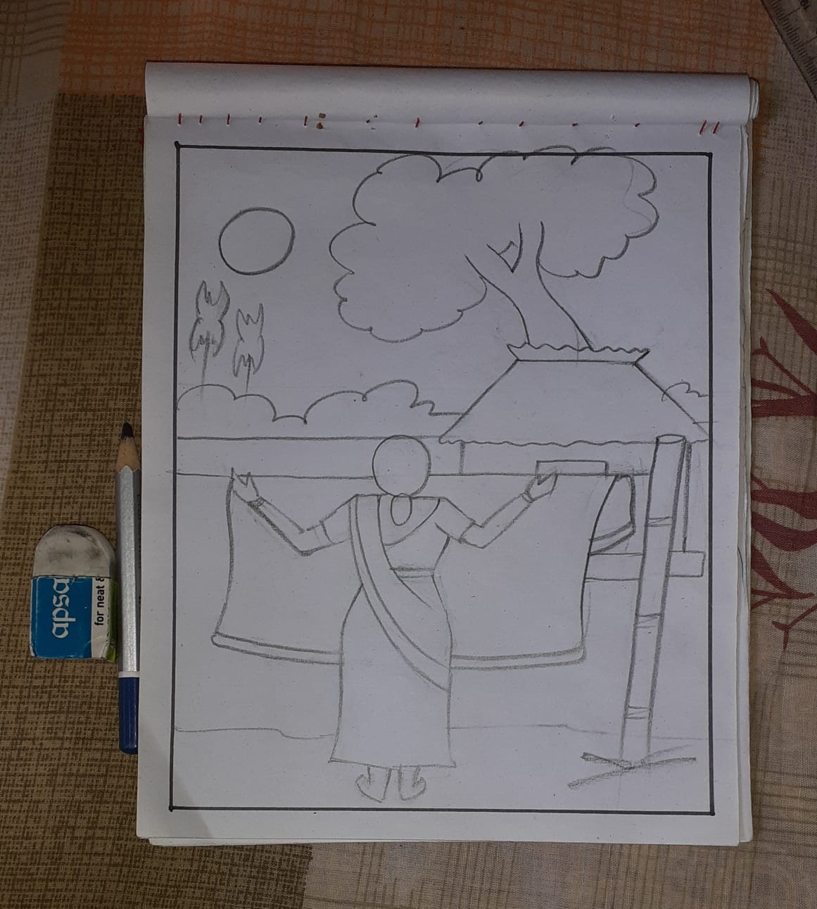 ▶️প্রথম ধাপে- স্কেচ পেন্সিল দিয়ে প্রথমে একটি মহিলার দৃশ্য এঁকে নিয়েছি এবং সেখানে সে কাপড় রোদ দিচ্ছে, এই বিষয়টা তুলে ধরেছি। এরপর গ্রামীণ বাড়ি, গাছ এইসব এঁকে দিয়েছিলাম।