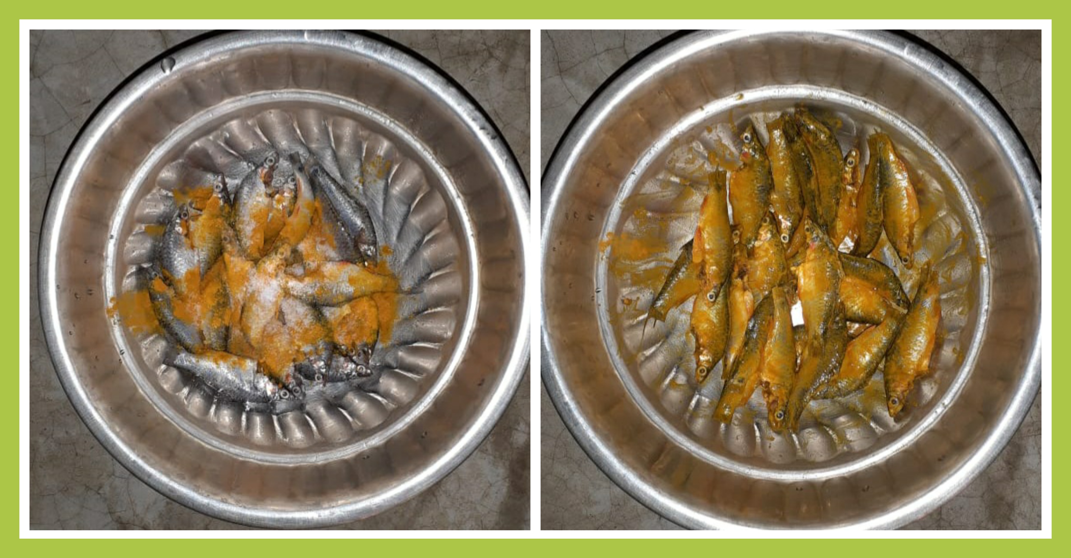 ❖কেটে রাখা পুঁটি মাছগুলোর গায়ে লবন আর হলুদ ঠিকমতো দিয়ে দিয়েছিলাম এবং পরে হাত দিয়ে গায়ে ভালো করে মাখিয়ে নিয়েছিলাম।
