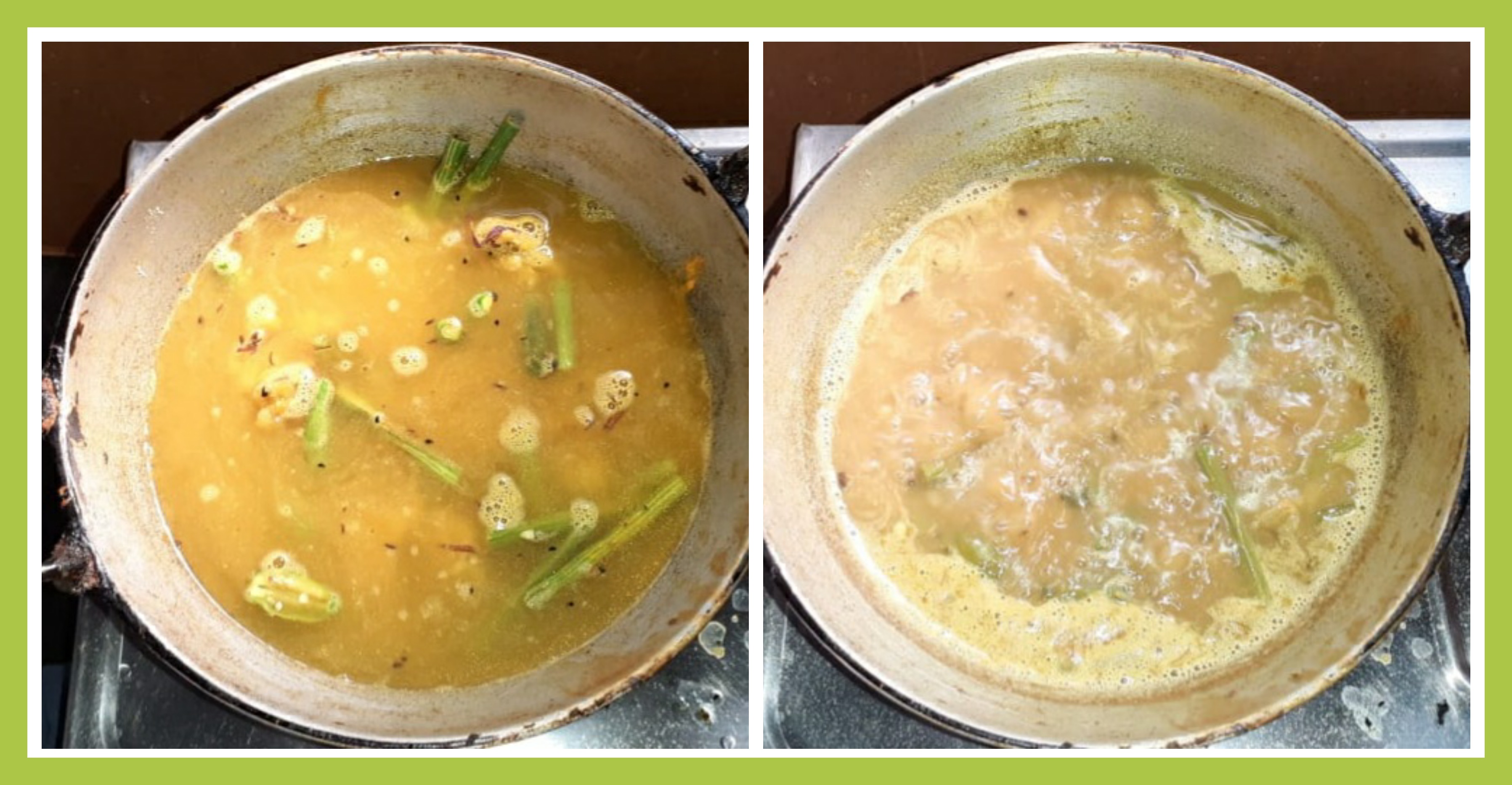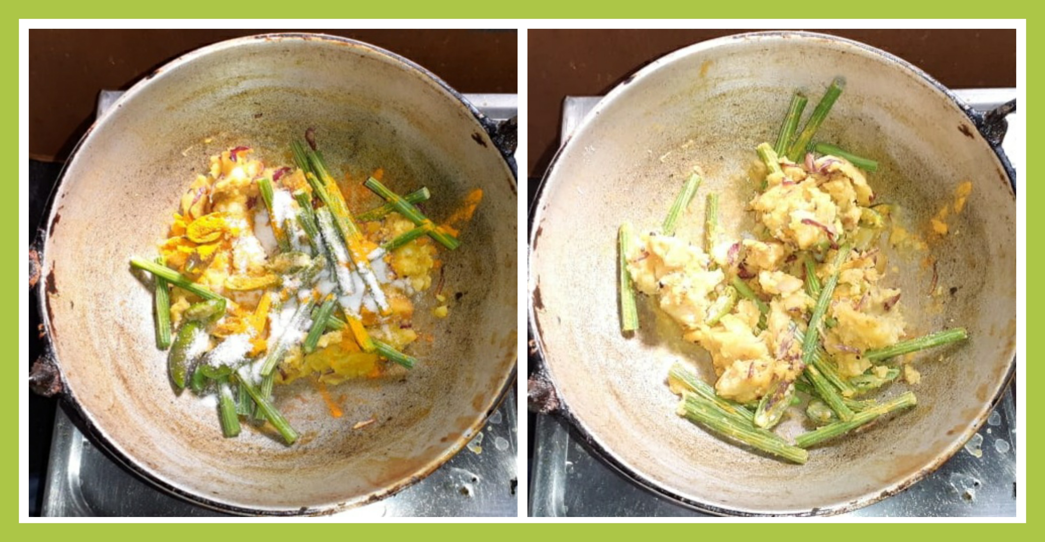 ❖গলানোর পরে তাতে সজনের ডাঁটাগুলো এবং কাঁচা লঙ্কা, স্বাদ মতো লবন আর হলুদ দিয়ে দিয়েছিলাম। এরপর সব ঘেঁটে একসাথে মিশিয়ে নিয়েছিলাম।