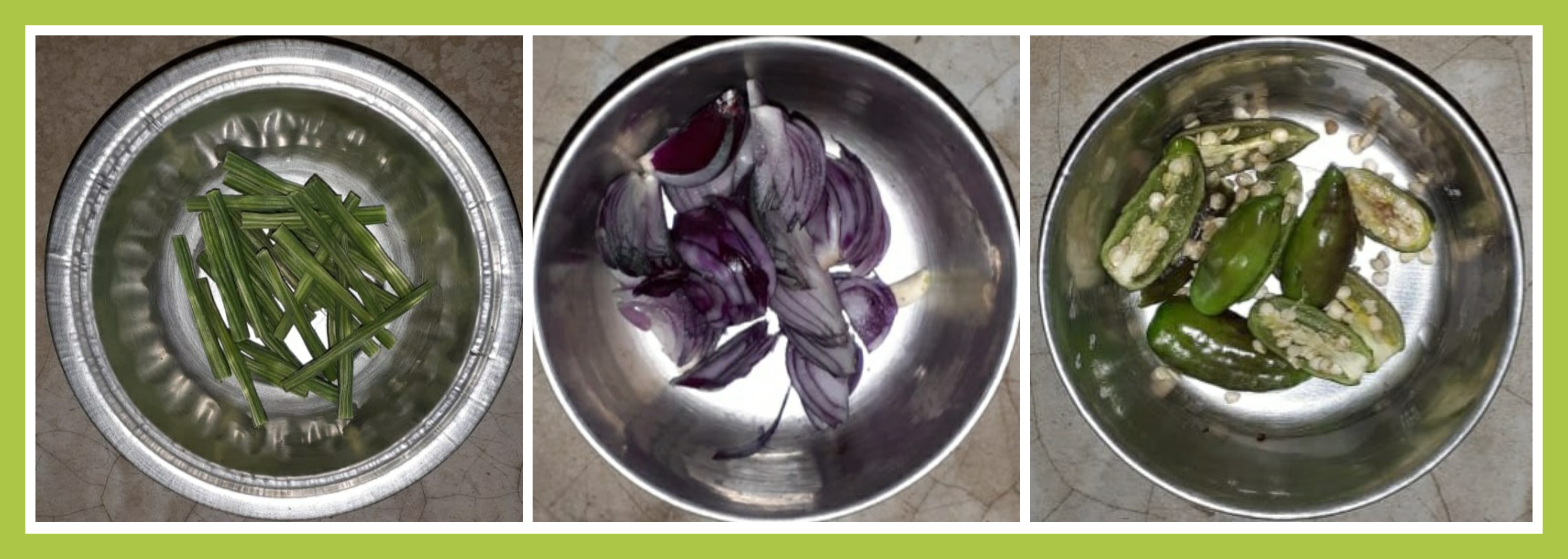 ❖সজনে ডাঁটাগুলো কেটে ছোট ছোট করে নিয়েছিলাম। পেঁয়াজ এর খোসা ছাড়িয়ে নেওয়ার পরে কুচি করে নিয়েছিলাম। এরপর কাঁচা লঙ্কাগুলো কেটে নিয়েছিলাম।