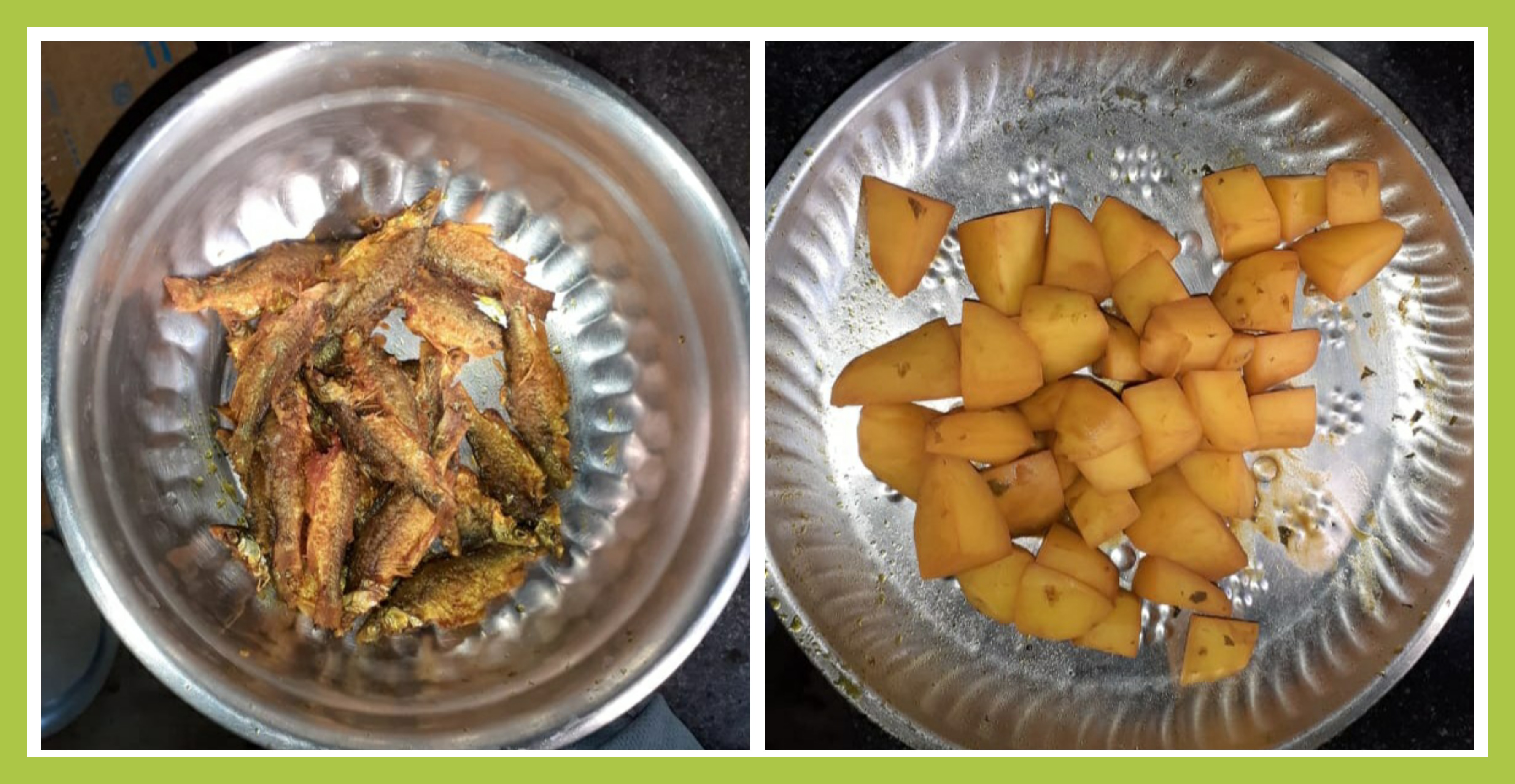 ❖পুঁটি মাছগুলো ভালো করে ভেজে নিয়েছিলাম। এরপর আলুর পিচগুলো লাল মতো করে ভেজে নিয়েছিলাম।