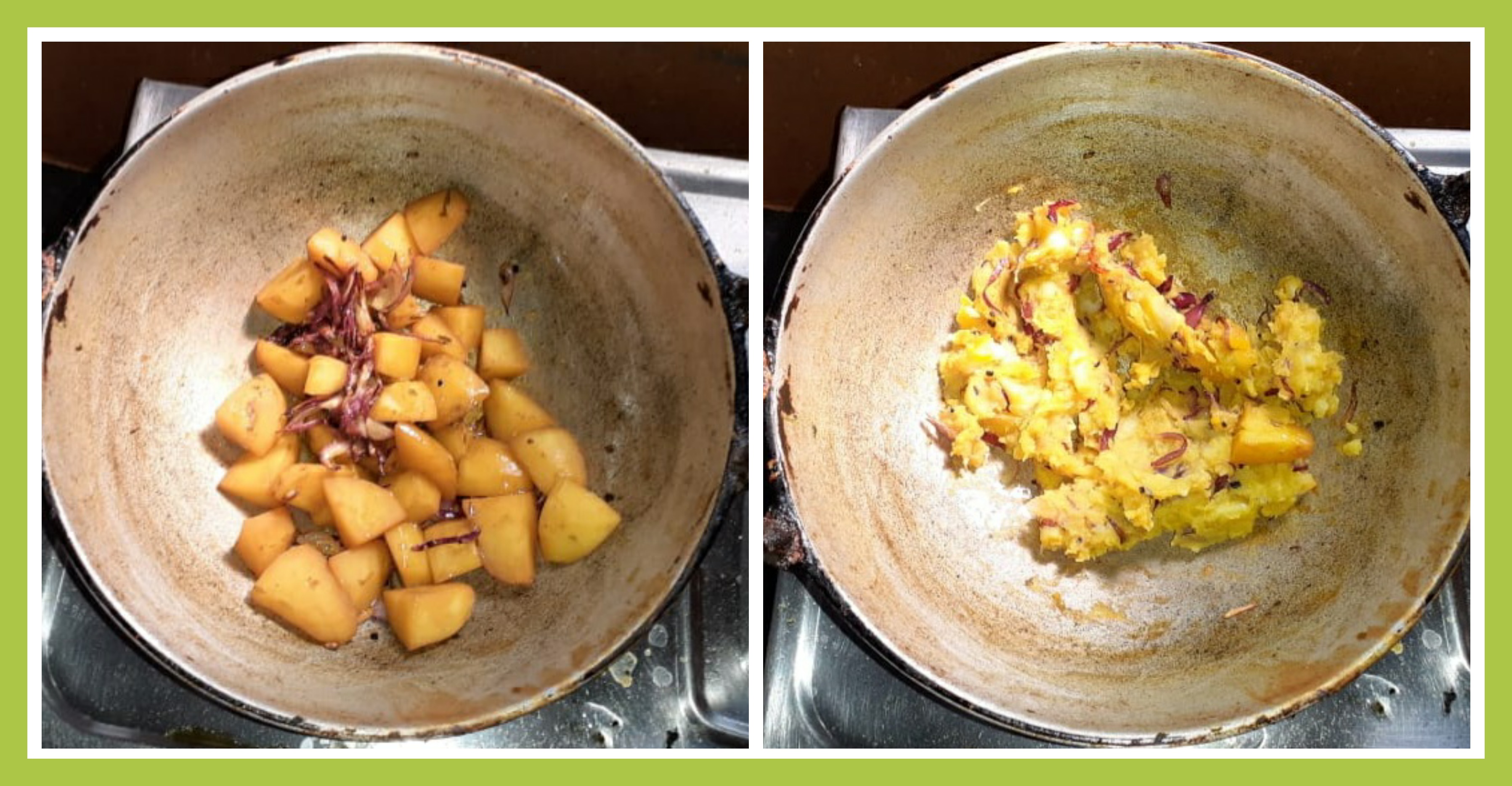 ❖পেঁয়াজ ভাজার পরে তাতে ভাজা আলুর পিচগুলো দিয়ে দিয়েছিলাম। এরপর পেঁয়াজ এর সাথে আলু একসাথে চেপে গলিয়ে নিয়েছিলাম।