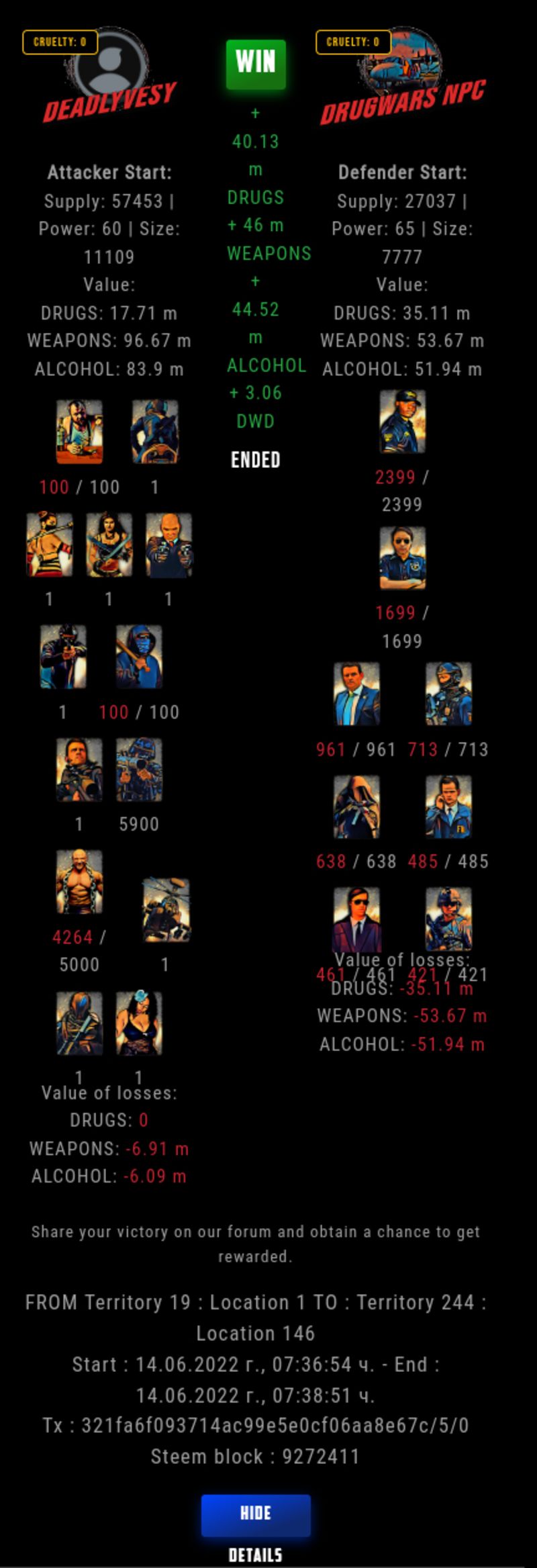 Check my latest fight ! deadlyvesy vs The Govermentdeadlyvesy (61)in DrugWars • 4 years ago #drugwars-fight #gaming #fight #dw