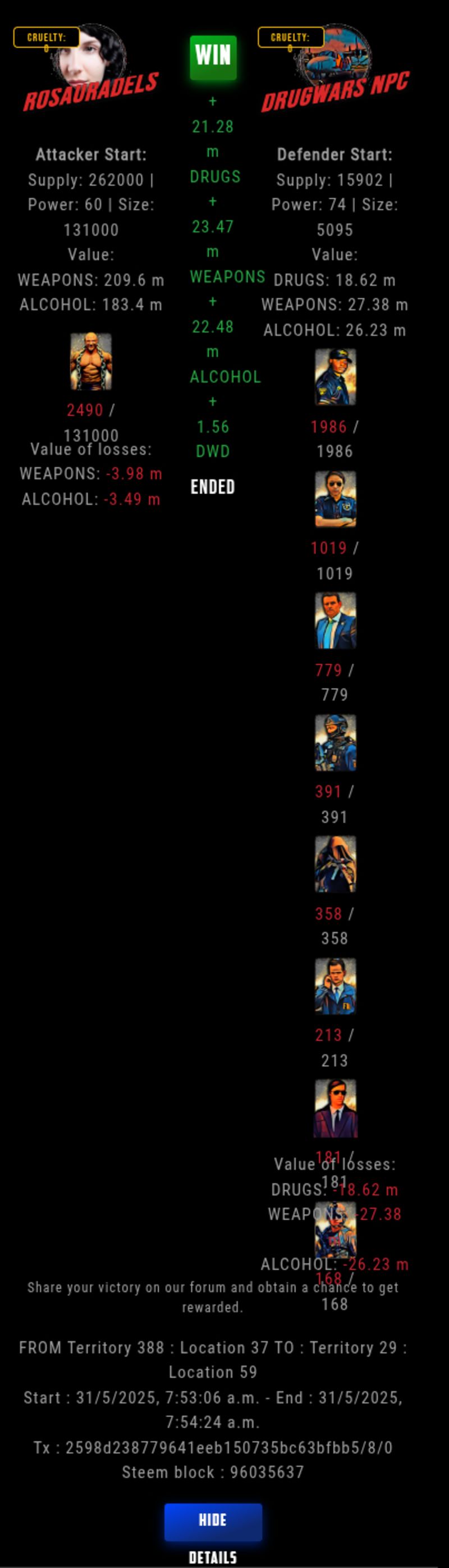 Check my latest fight ! rosauradels vs The Govermentrosauradels (67)in DrugWars • 9 months ago #drugwars-fight #gaming #fight #dw