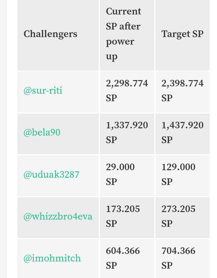 | Challengers | Steem power when Challenge commenced and after Week 1 of Challenge |