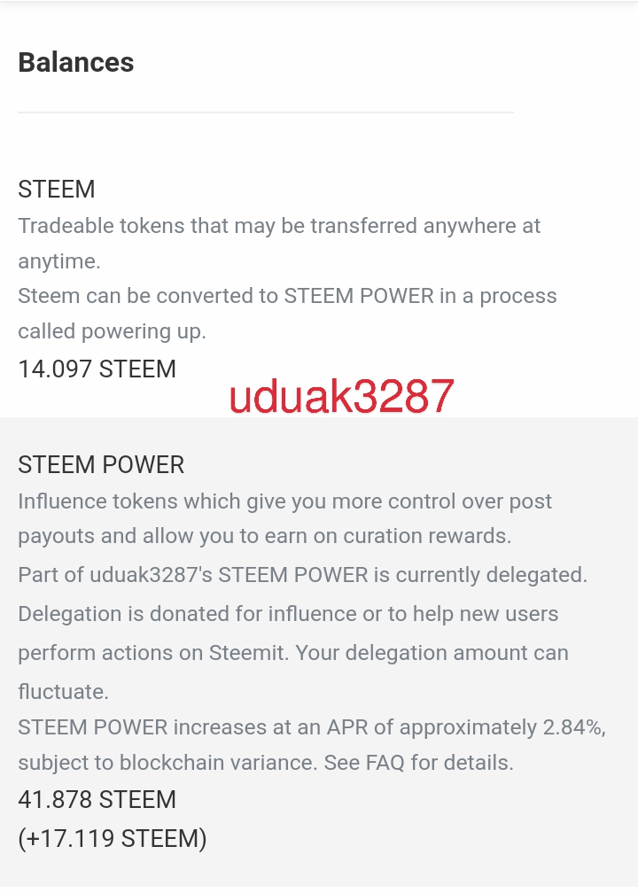 | @uduak3287 | 29 SP - 41 SP. He made 12 steem power and 14 steems in a frame of one week. You can do better next week @uduak3287. The effort you put last week is commended. You still have 88 SP to make. You made 3 posts this week which is very commendable. It's possible to beat your challengers. ![]() |