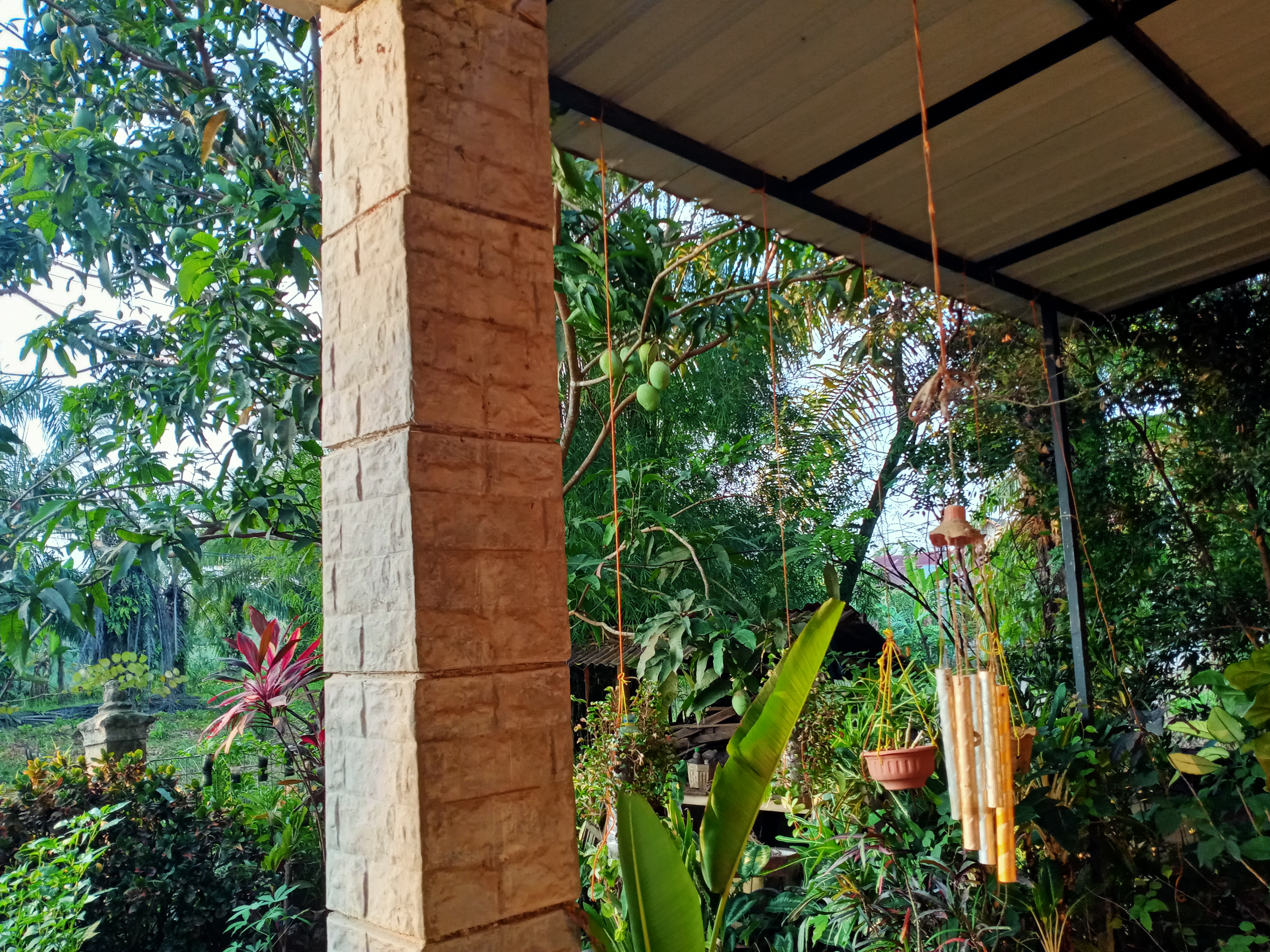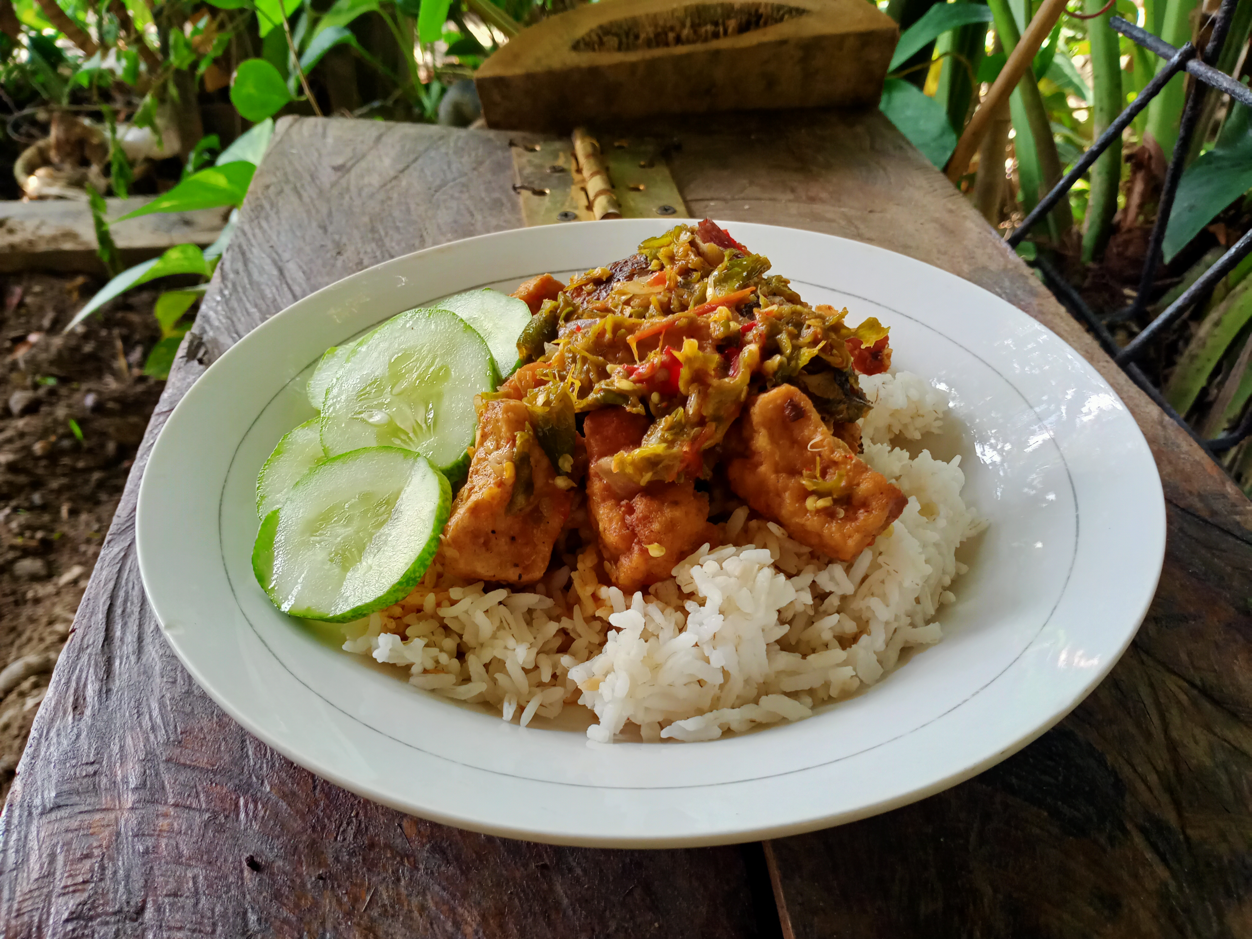 Dan siang ini aku makan siang di teras rumah atau di pinggir eks kolam ikan koi kami dengan menu yang telah aku siapkan bersama istriku sejak tadi pagi.