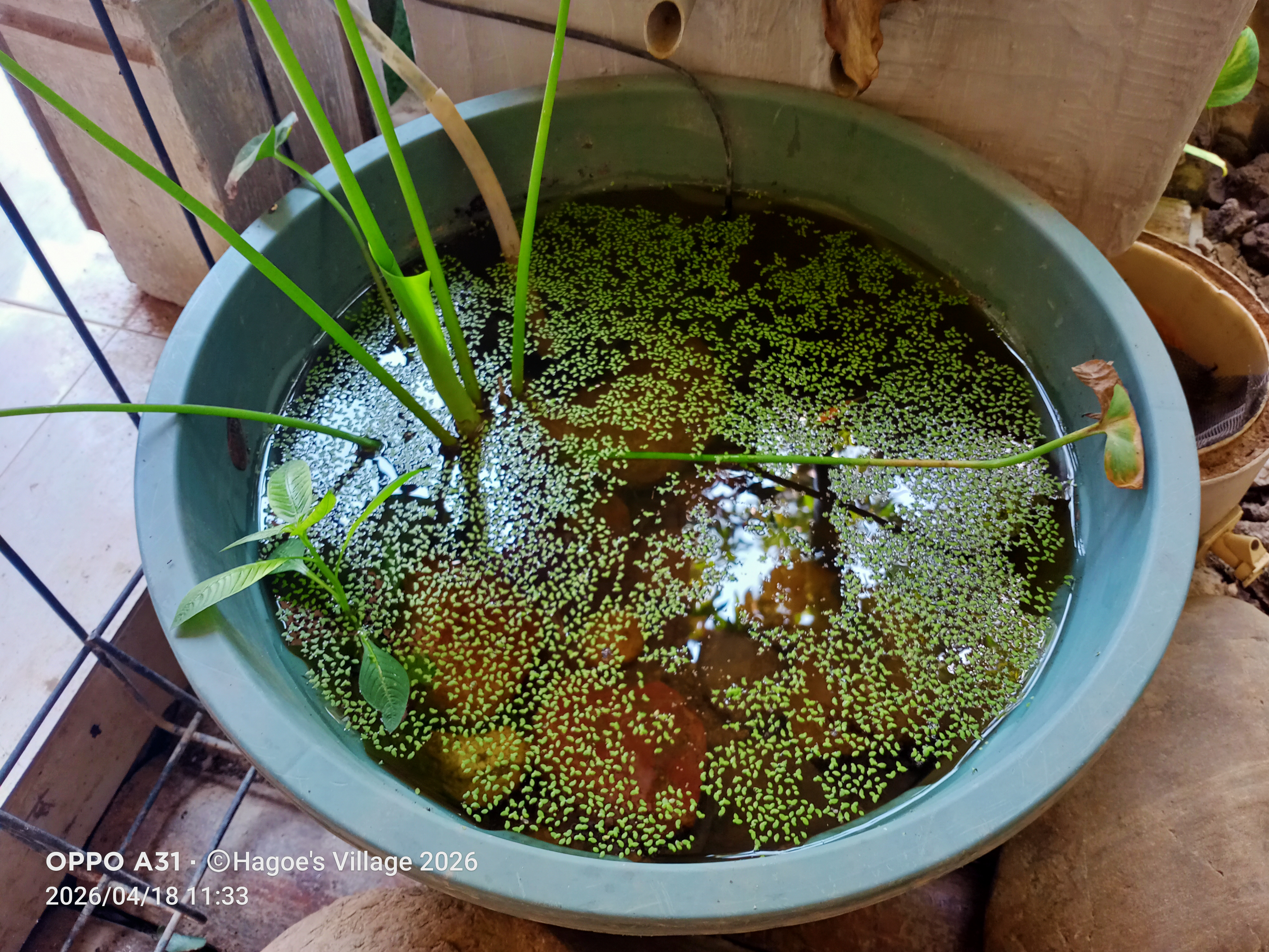 Aku juga memindahkan sejumlah tanaman air (Azolla) ke dalam mini ponds yang ada di teras rumah kami. Begitu pula dengan tanaman-tanaman yang ada di teras rumah yang sempat aku tata ulang di siang ini.