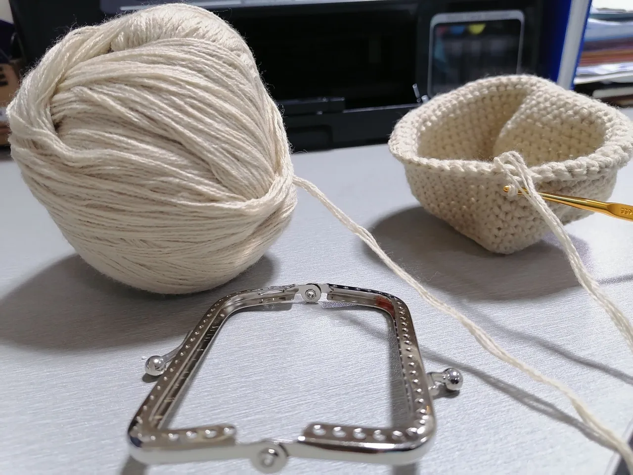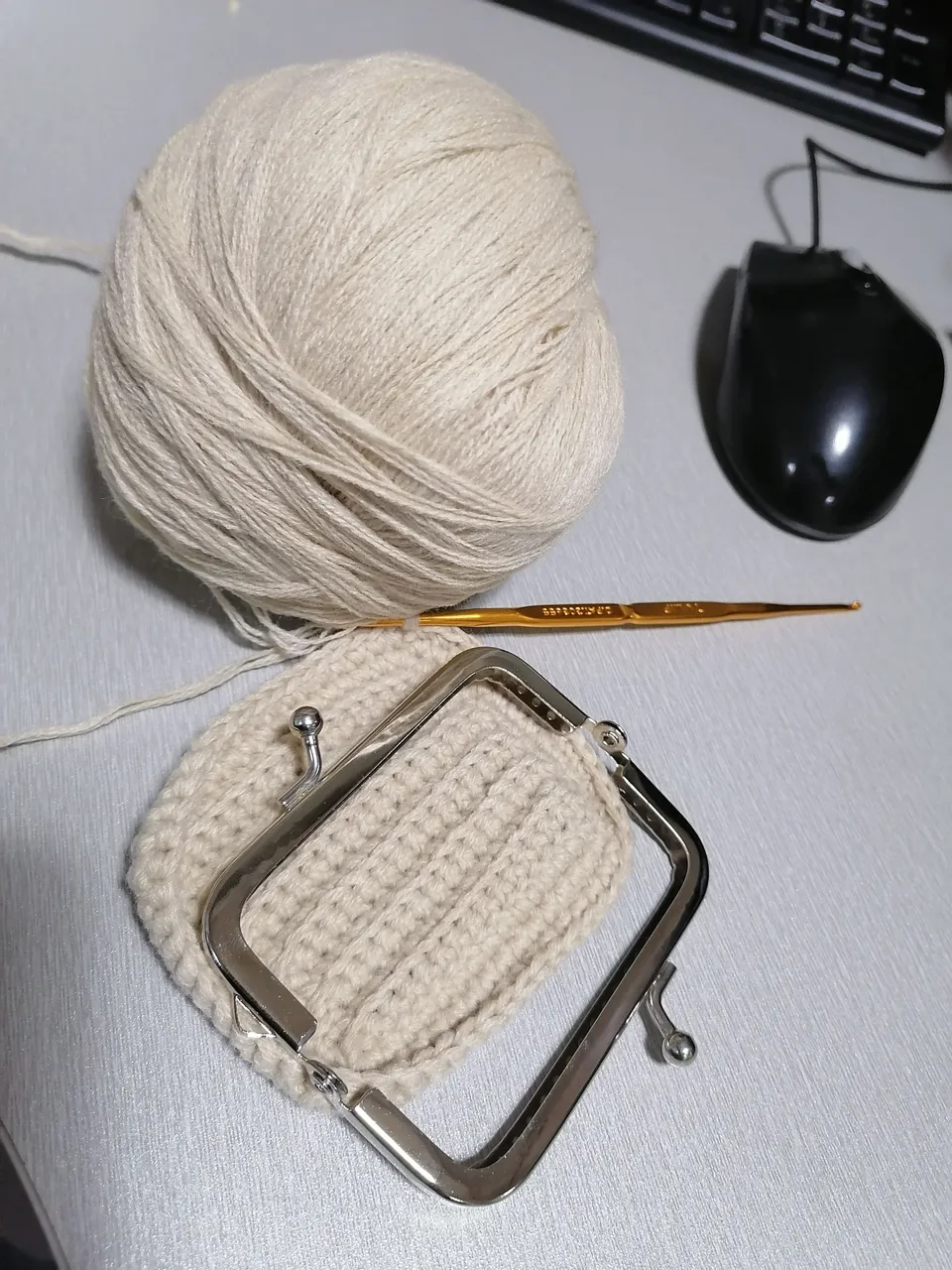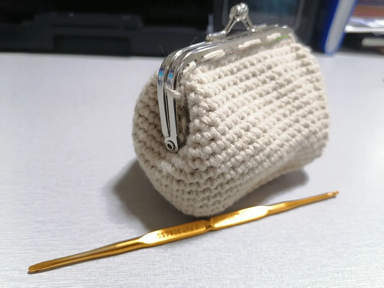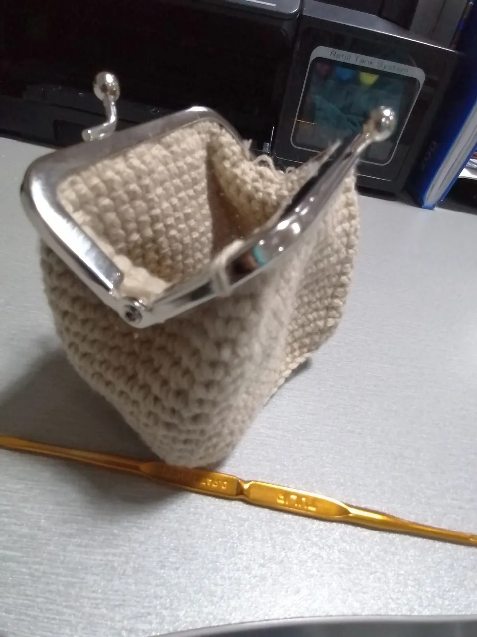So I came across and joined crochet groups in other social media platforms, and saw these coin purses being made. I thought to my self that I should give it a try. I watched for video tutorials and ordered a metal frame too. It arrived sooner that expected that I had to lend money to get the parcel. I chose the cash on delivery method of payment.The polyester yarns that I ordered has not come yet so I tried making the purse using an indophil yarn 4ply.