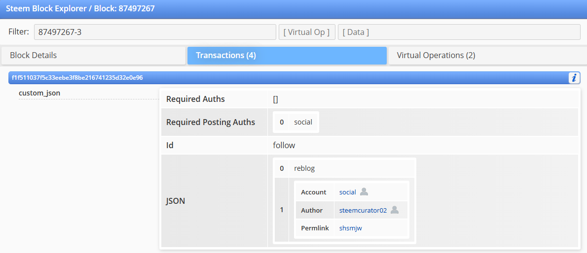 custom_jsonoperation. Only the author and the permlink need to be specified for the reblog operation. For the chain, a comment is the same as a post, only with adepth > 0.In the conderser, the reblog button is simply hidden. So if you create the operation without the condenser, this is not a problem.