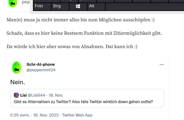 Das war so im Zuge mit dem Steemquote Projekt/Idee/Ansatz. Da ging es auch um die Möglichkeit einen Kommentar/Artikel mit einem Zitat, Kurzhinweis, wtf resteemen zu können.