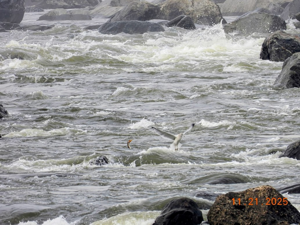 - No Eagle here, but if you look carefully, you can see some sort of fish above the surface of the water. Maybe the gull dropped the fish, or maybe it jumped out of the water to escape...