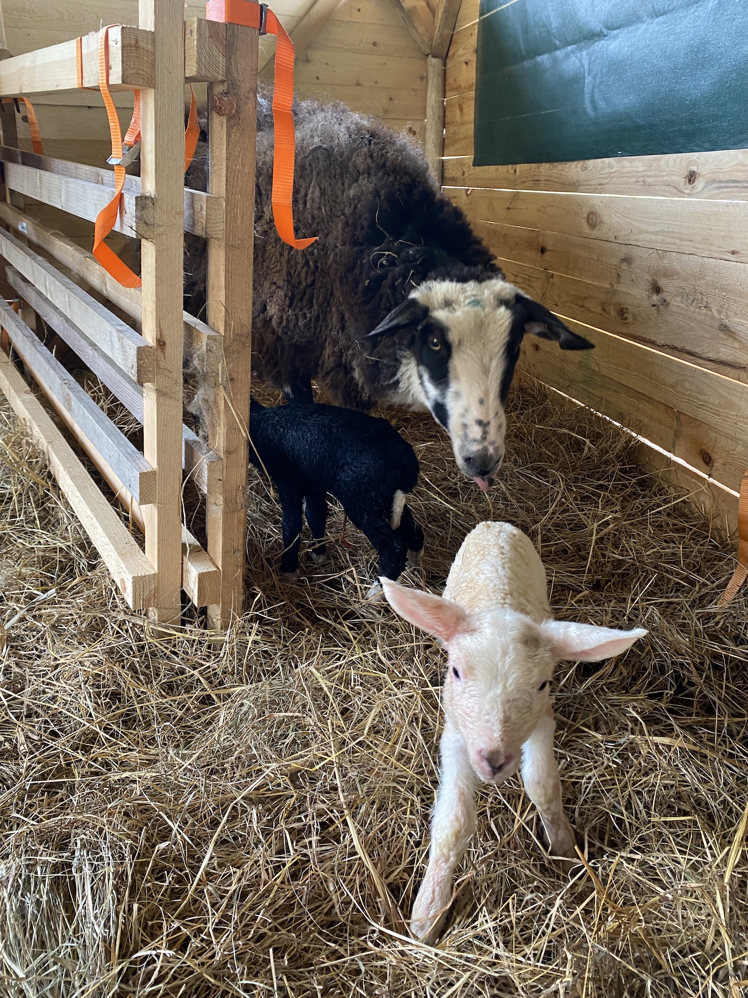 Kein einziges Lämmchen wurde/wird aussortiert! Die sehen richtig gut und gesund aus. Hüpfen rum, nerven ihre Mütter, suchen sich selbst die ersten zarten Heuhalme und ein paar Gersteflocken heraus, um sich zu stärken. Soooo irre, wie schnell das alles geht! Die "Großen" sind fünf Tage alt, die "Lütten" drei! Warum Anführungsstriche? Nun, die jüngeren Lämmer sind bereits größer als die Drillinge - müssen eben nur zu zweit an die Milchbar. Aber alles im grünen Bereich - wir schauen bestimmt 10x am Tag nach... 🫣
