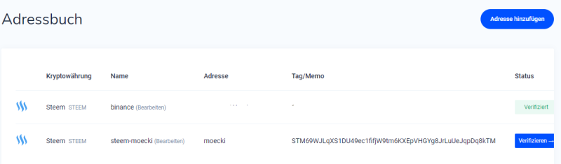 Bei der Steemit-Adresse habe ich den Accountnamen als Adresse und den Memo-Key als Memo eingetragen. Das hat so jedenfalls bei Binance reibungslos funktioniert. Um die Auszahlung auf vornehmen zu können, muss man die Adresse nun verifzieren.